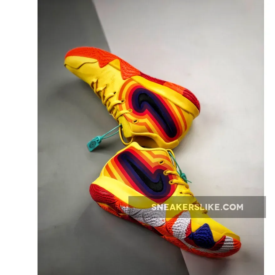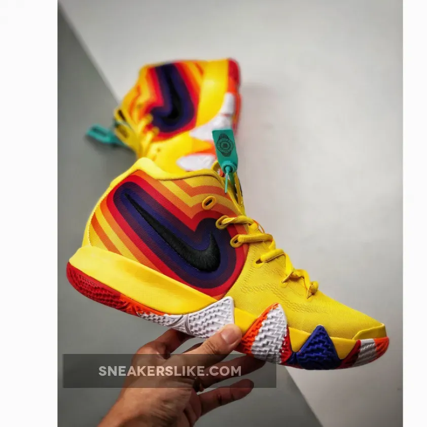 Dressed in Starburst-like colors, although the connection is unofficial, this Nike Kyrie 4 comes in a mix of Yellow, Orange, Purple, and Red color tones. It features a Yellow-based upper highlighted with a vintage pattern on the ankle area atop a colorful rubber outsole.