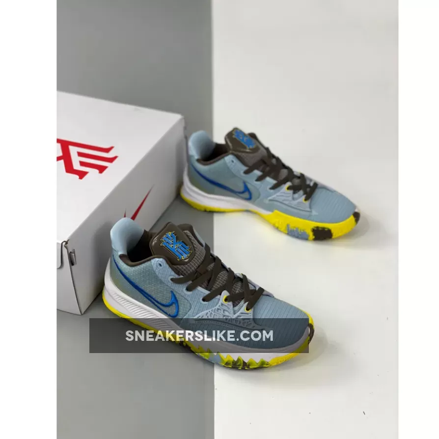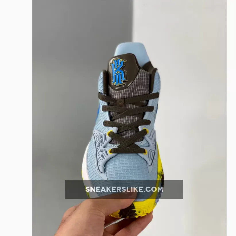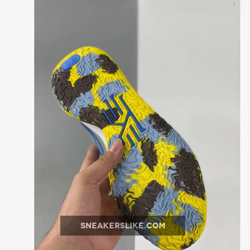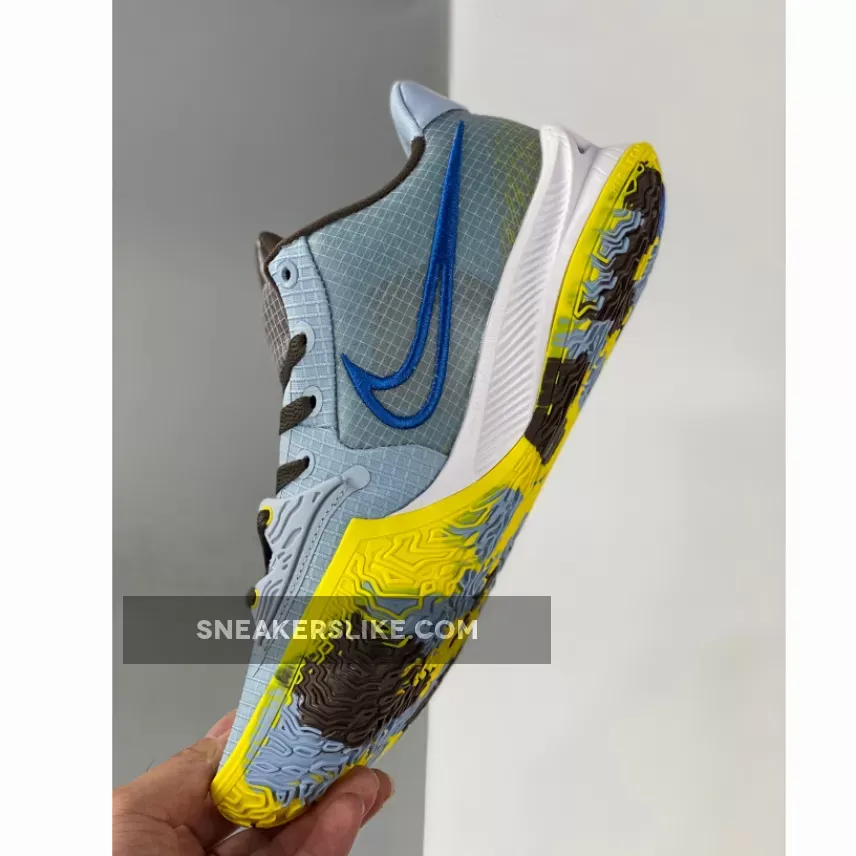 Specifically, this Nike Kyrie Low 4 comes dressed in a Light Armory Blue, Black, and Signal Blue color combination. Utilizing various materials and an outlined Swoosh on the panels while Yellow, Brown, and Blue form for marble or camouflage look on the outsole.