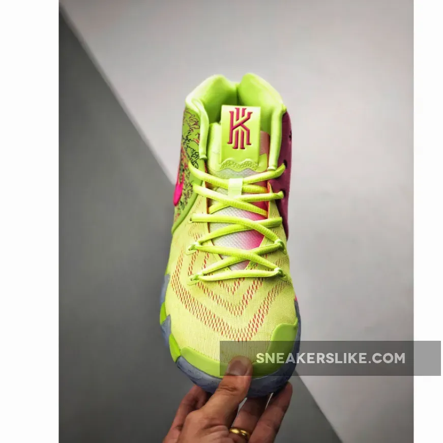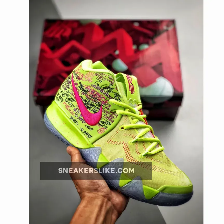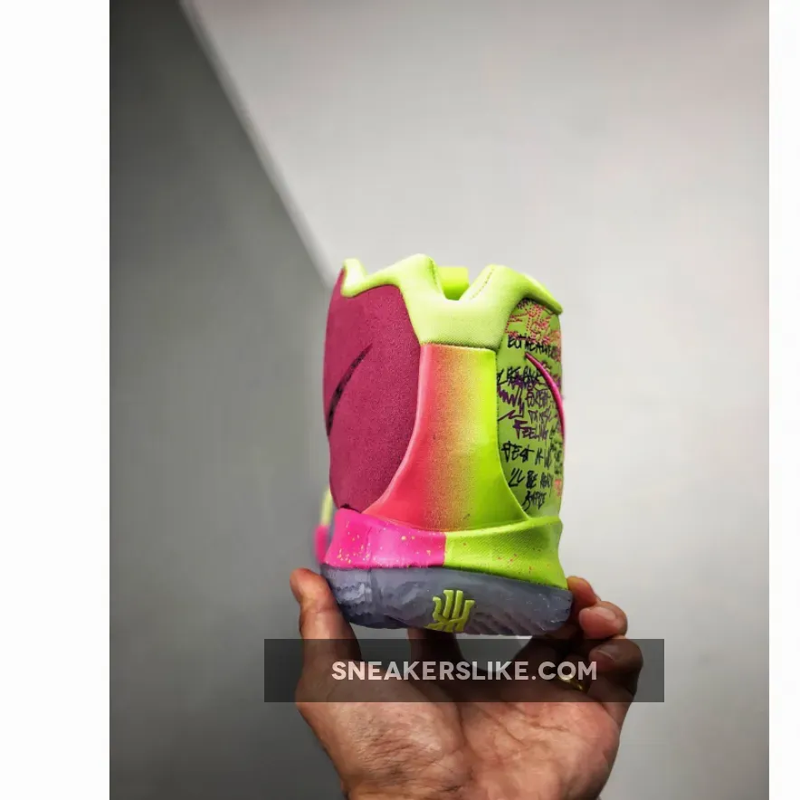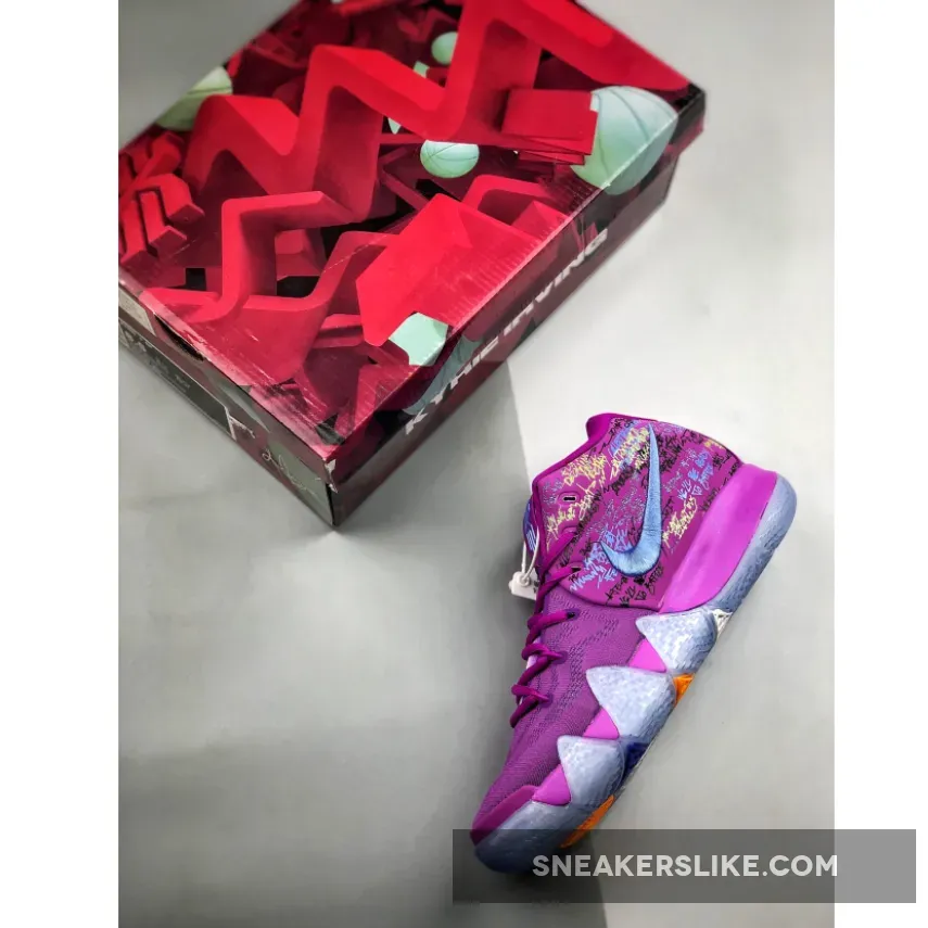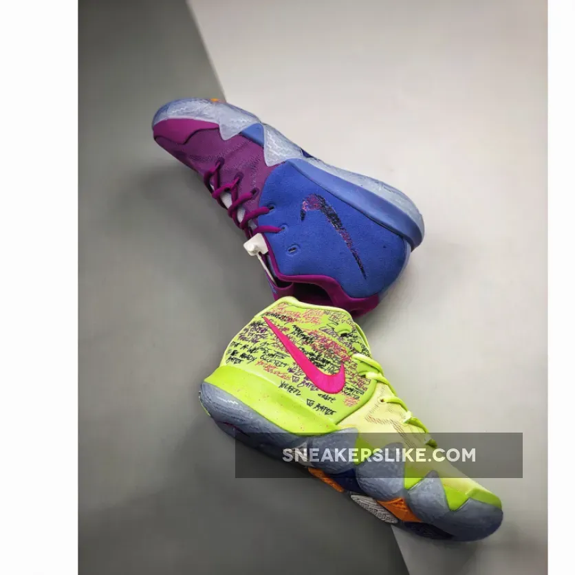 Dressed in a Multi-Color color scheme. This Nike Kyrie 4 features a Purple and Light Blue tone on the left shoe, and Pink and Volt hue on the right shoe. Both are completed with scribble writing and translucent outsole. No official word on the theme behind this release at the moment.