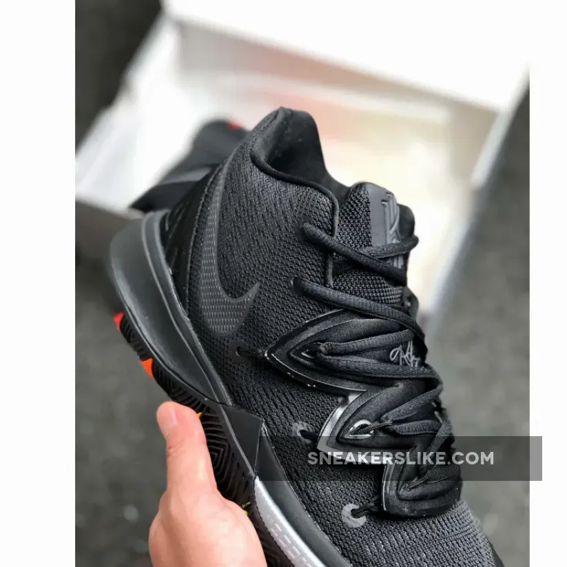 This offering of the Nike Kyrie 5 features an all-Black upper with matching tonal branding.