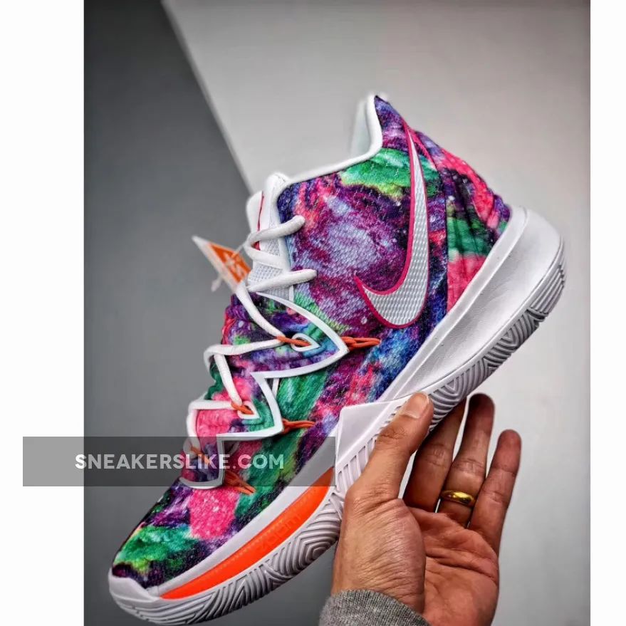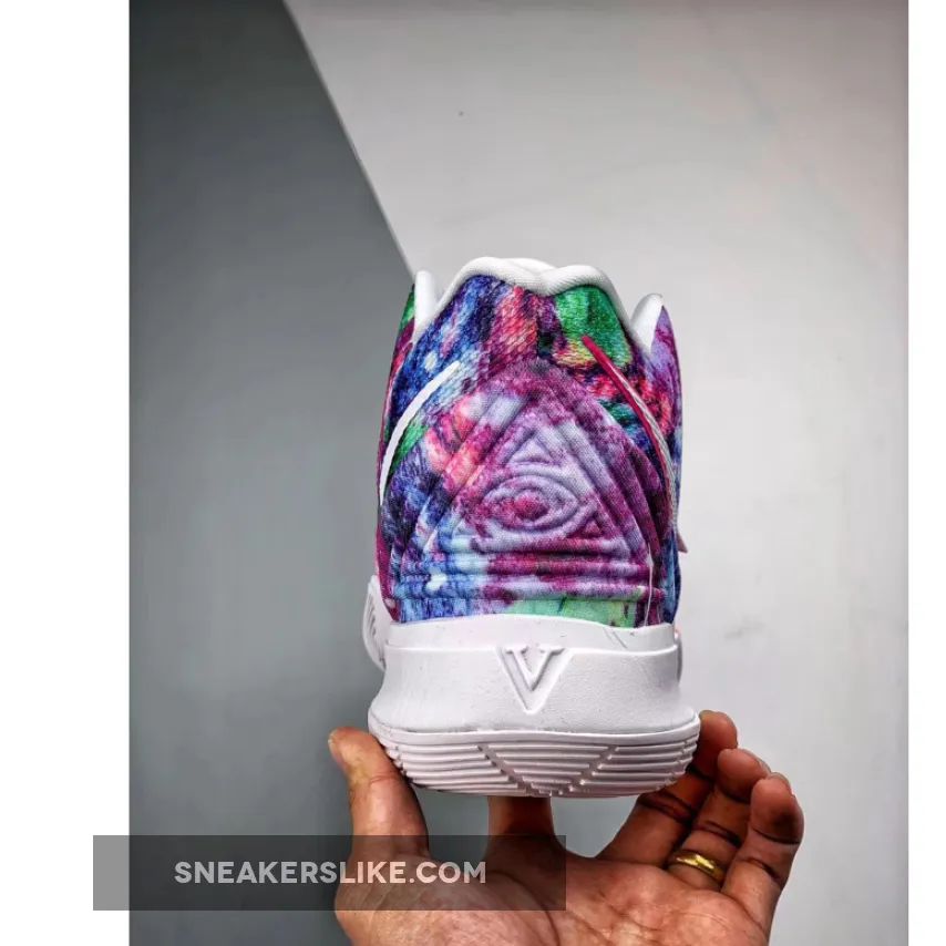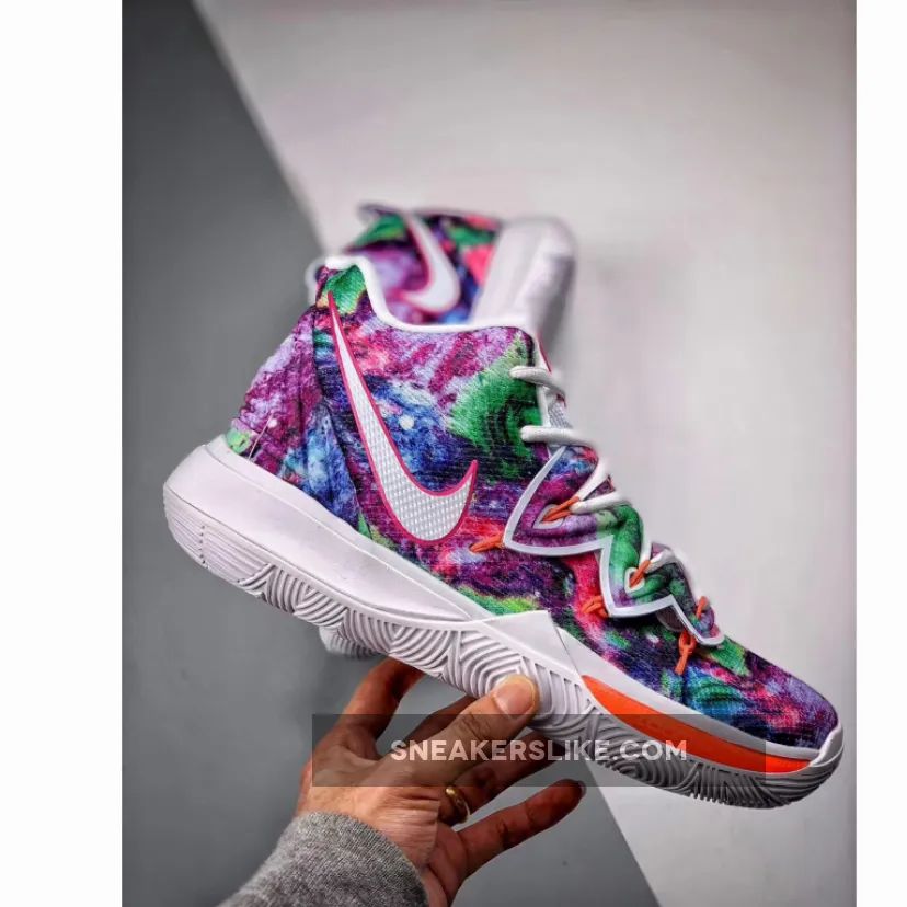 This iteration of the Nike Kyrie 5 features a mix of dyed colors on the upper while having White on the lining, tongue, and sole.