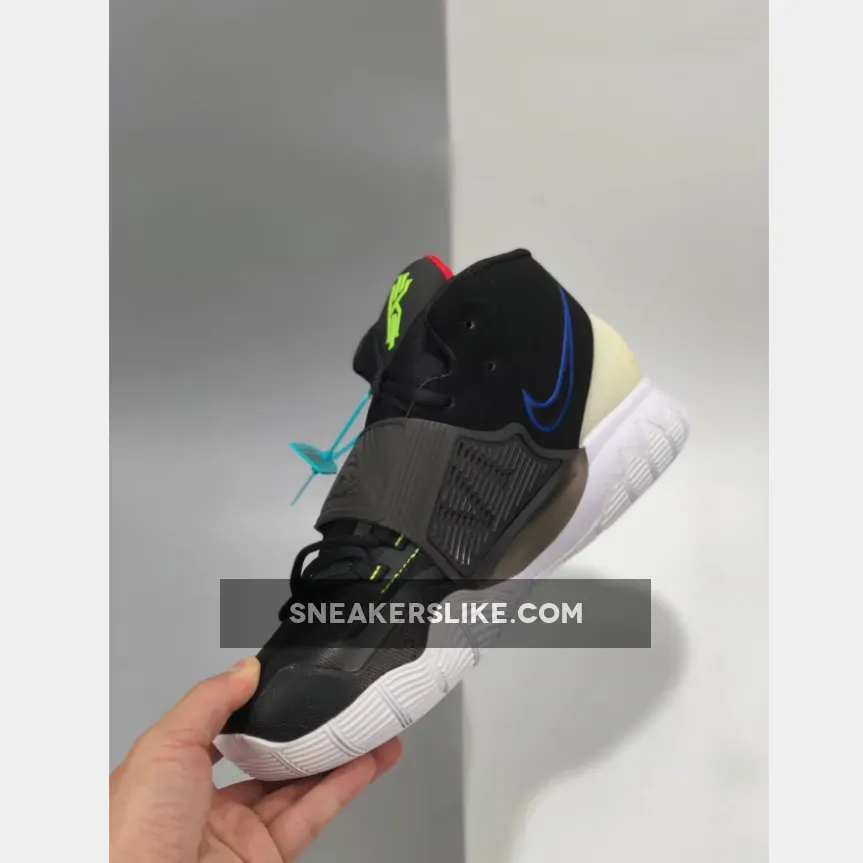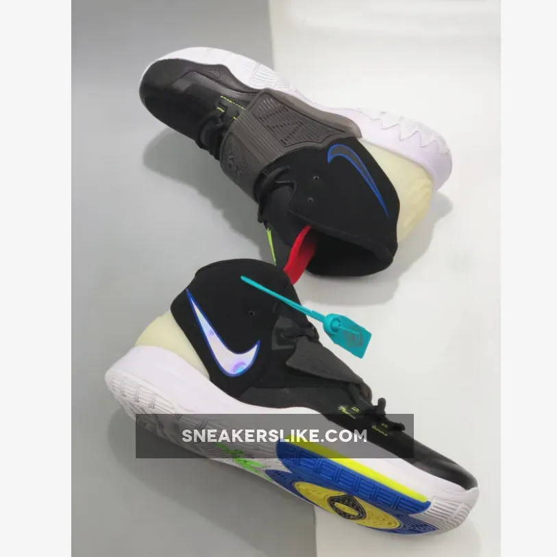 Dressed in a Black, White, Soar, and Dynamic Yellow color scheme. This Nike Kyrie 6 features a Black base with Yellow and Blue contrasting accents atop a White rubber sole. Iridescent Swooshes and a glow-in-the-dark heel completes the design.