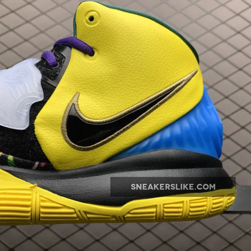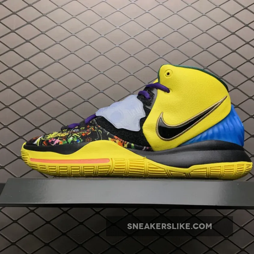 This rendition of the Nike Kyrie 6 “Chinese New Year” sports vibrant Yellow leather on the tongue and rear atop a matching colorful outsole. It features a festive collage print on its forefoot paired with Purple laces, a translucent midfoot strap covered in Kyrie’s Seeing Eye logo. Finishing touches includes a Black Swoosh logo outlined in Gold, Nike’s 2020 CNY badge on the right tongue, Green liners atop a Black midsole.