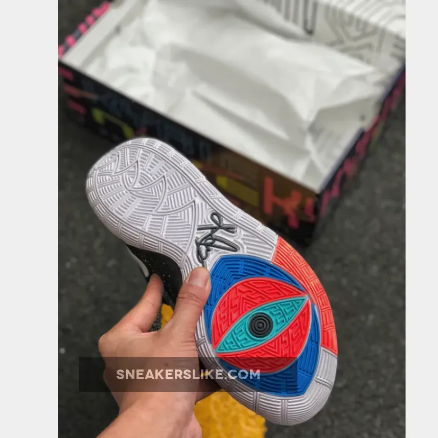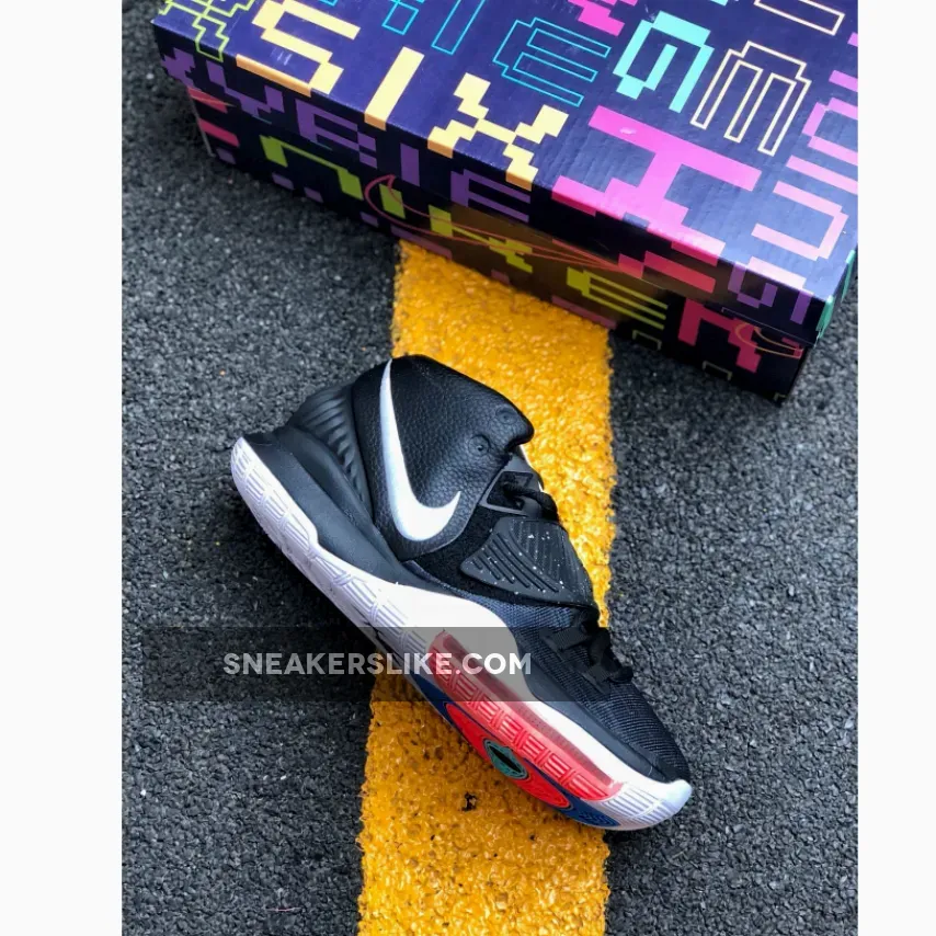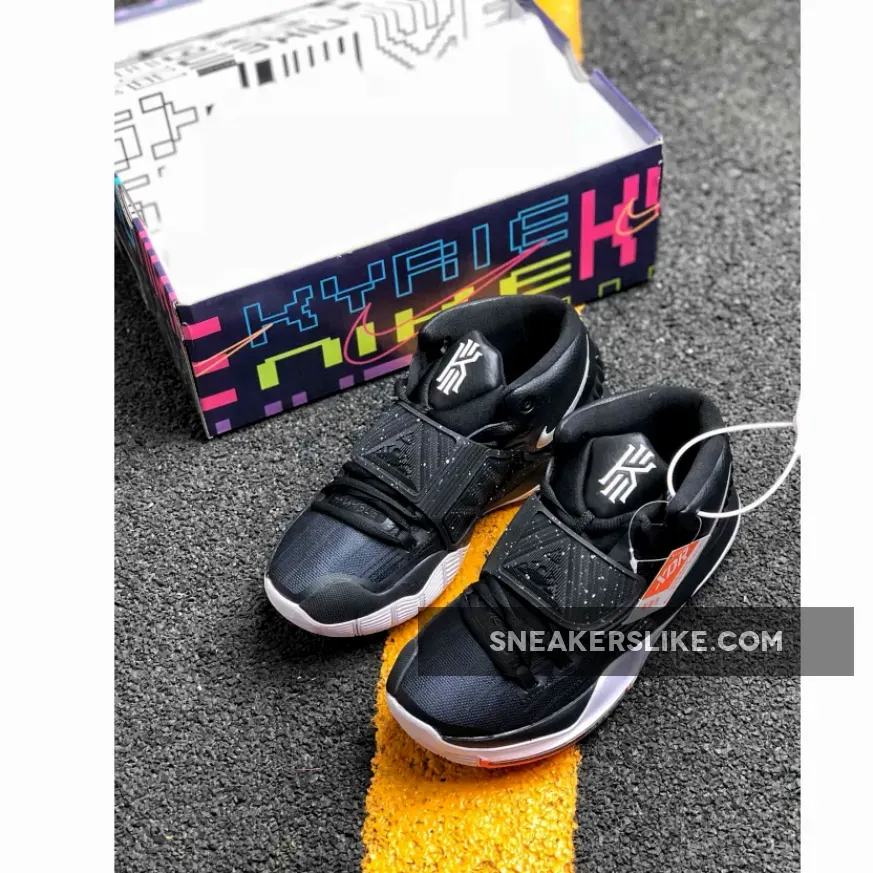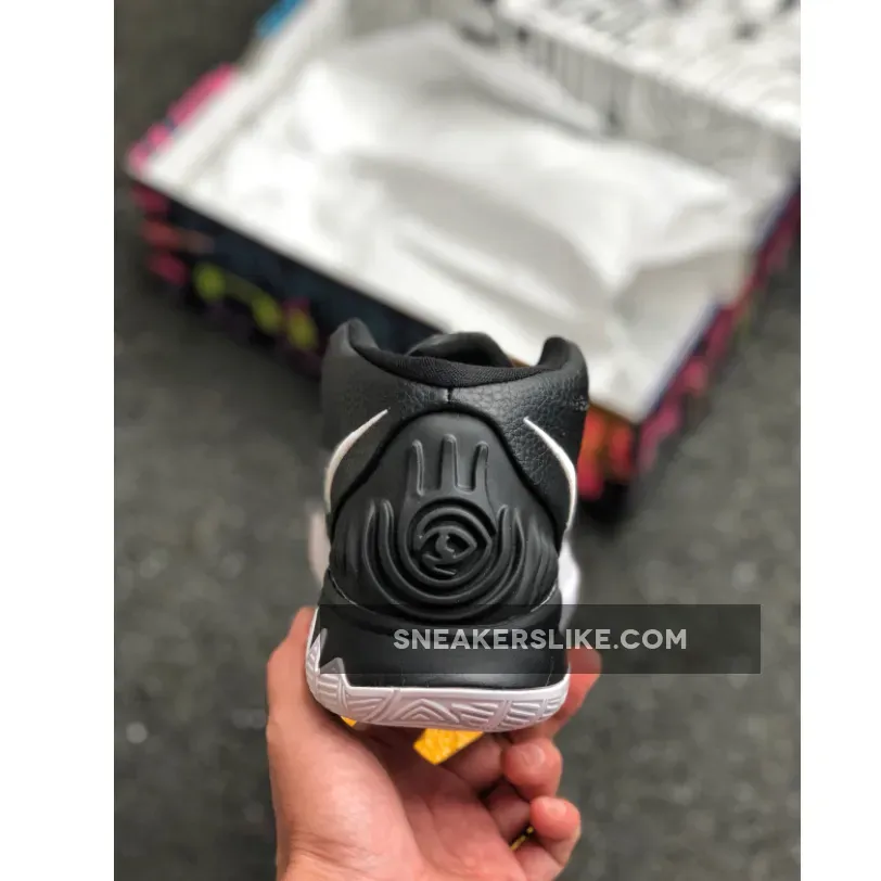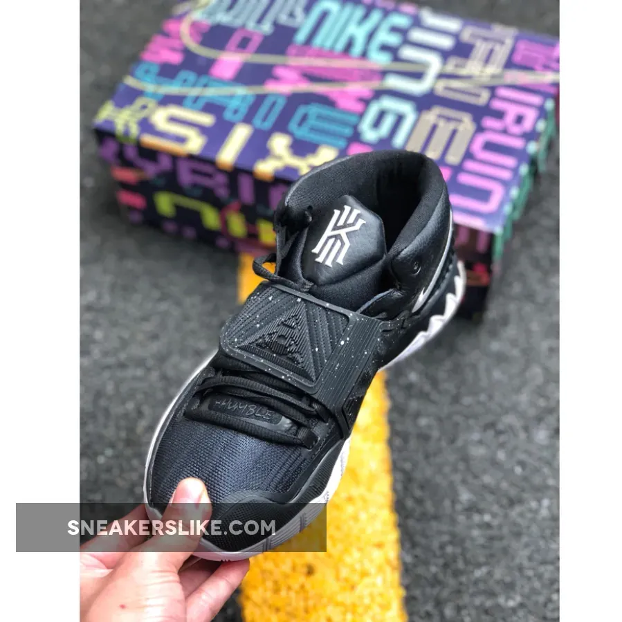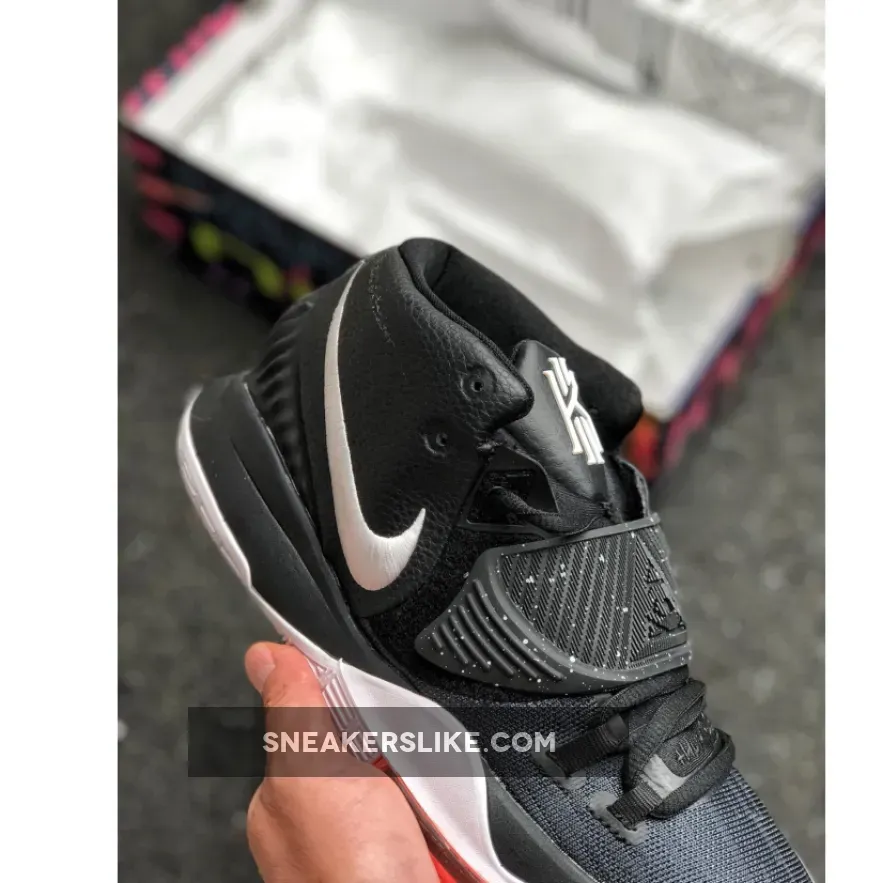 This offering of the Nike Kyrie 6 comes dressed in a traditional Black and White color scheme. It features a Black upper in a combination of leather and mesh with contrasting White logos, speckle print on the midfoot strap and rubber outsole. Other details includes an articulated heel design with branded insoles and lace tips.