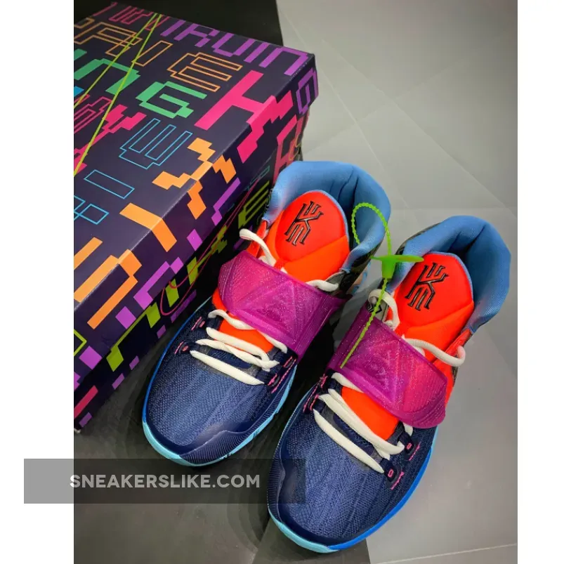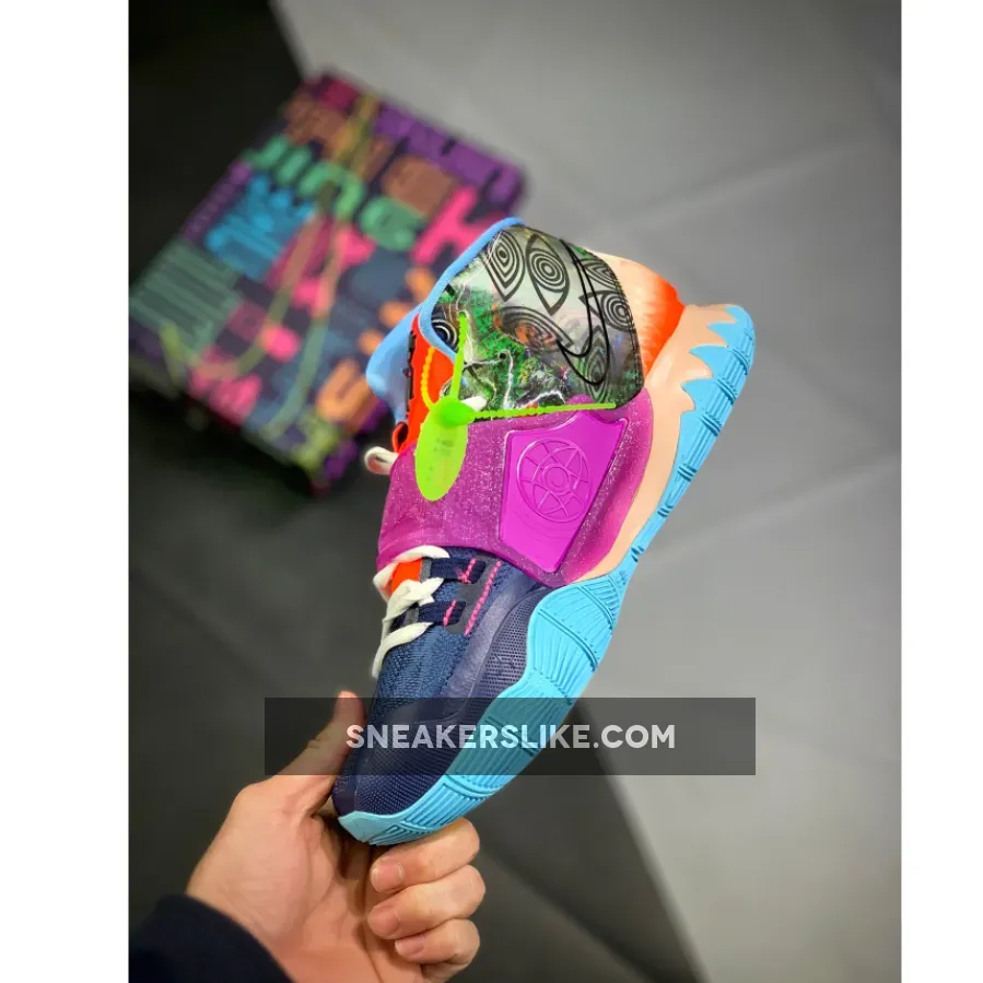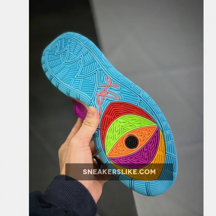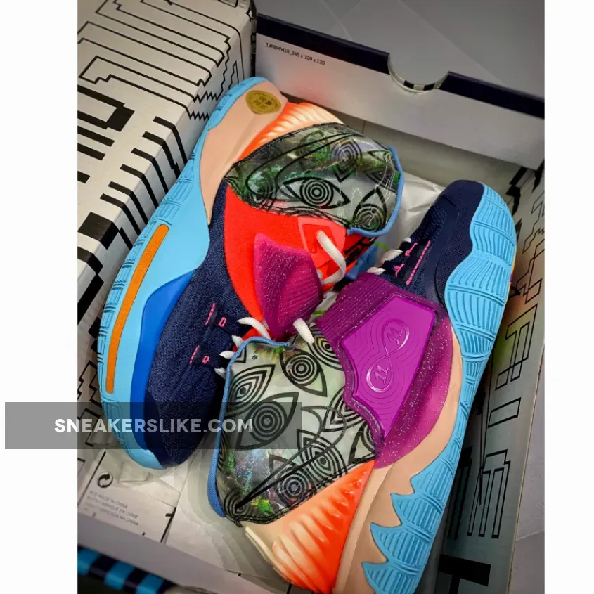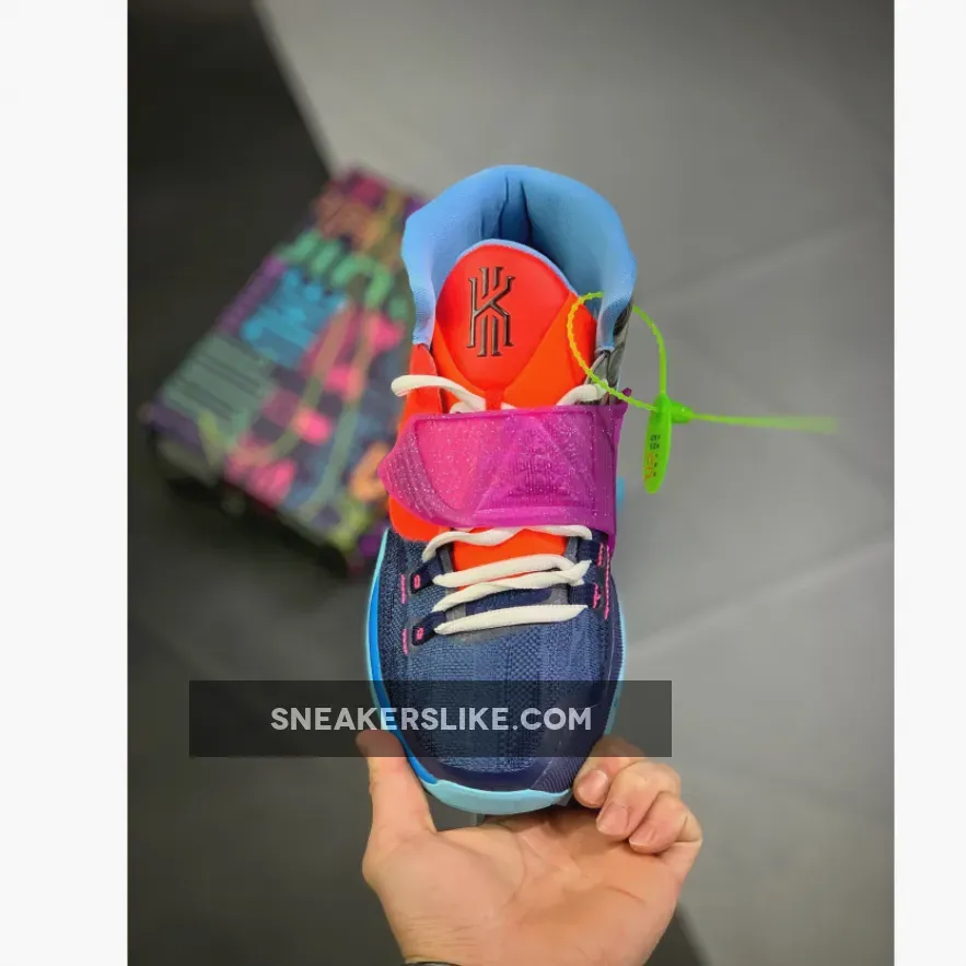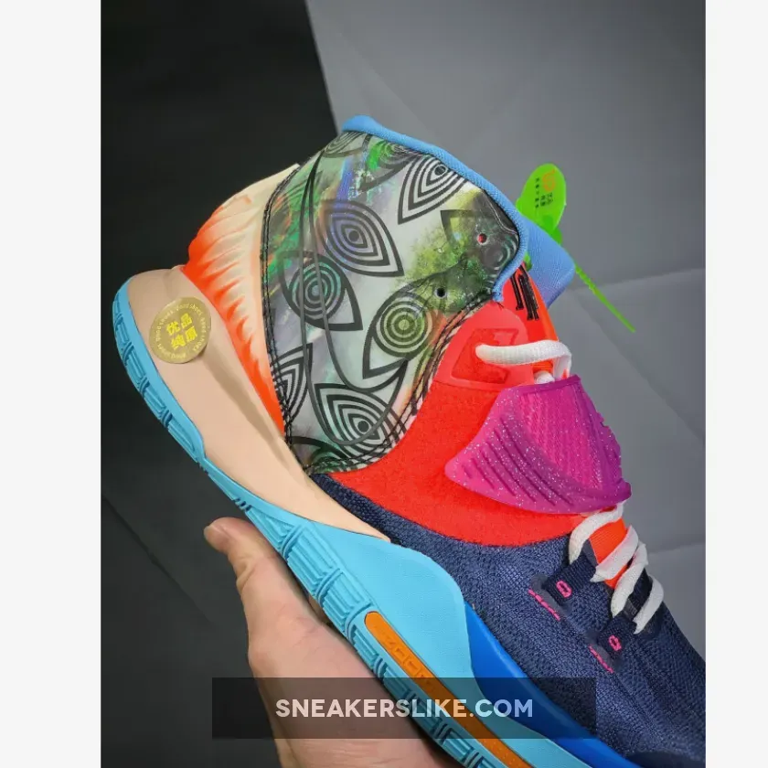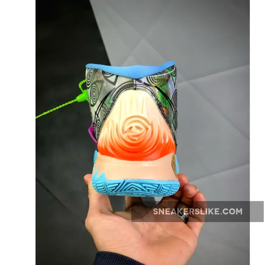 Looking closer this Kyrie 6 features various colors throughout along with textures and translucent materials. In addition it features special details that connect to Kyrie’s personal and spiritual connections. Following we have a translucent seeing-eye wrap with a scale iridescent below it. The mid-foot strap comes with Red and Purple glitter while Navy lands on the toe. Finishing the look is gradient Orange on the heel and Light Blue on the rubber outsole.