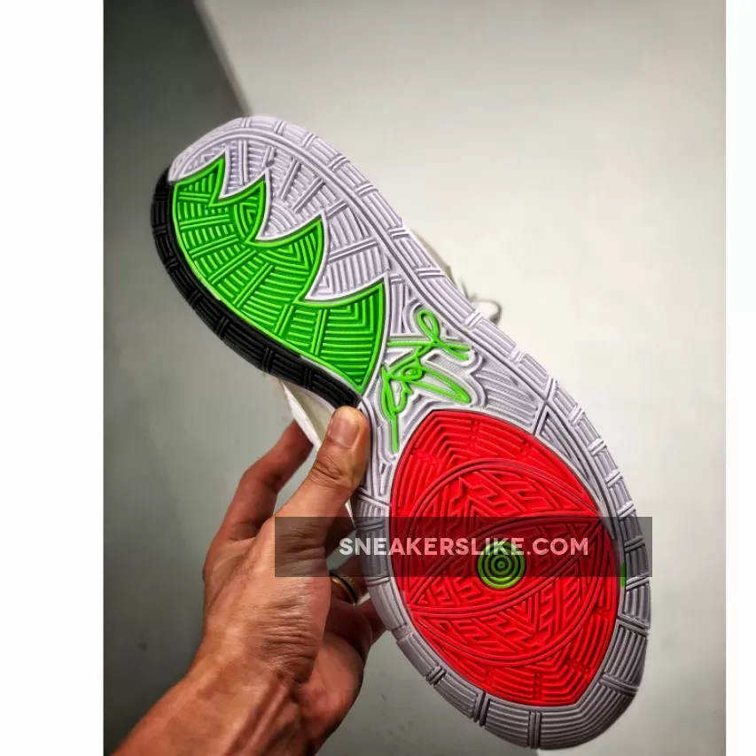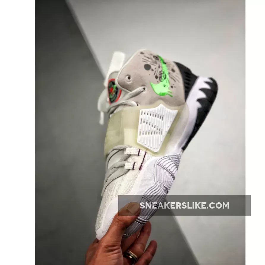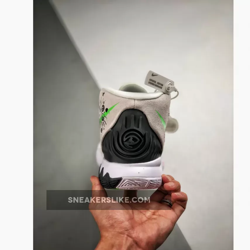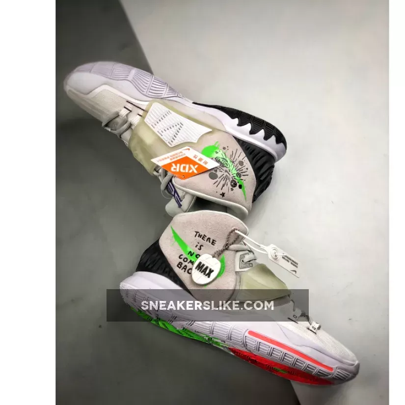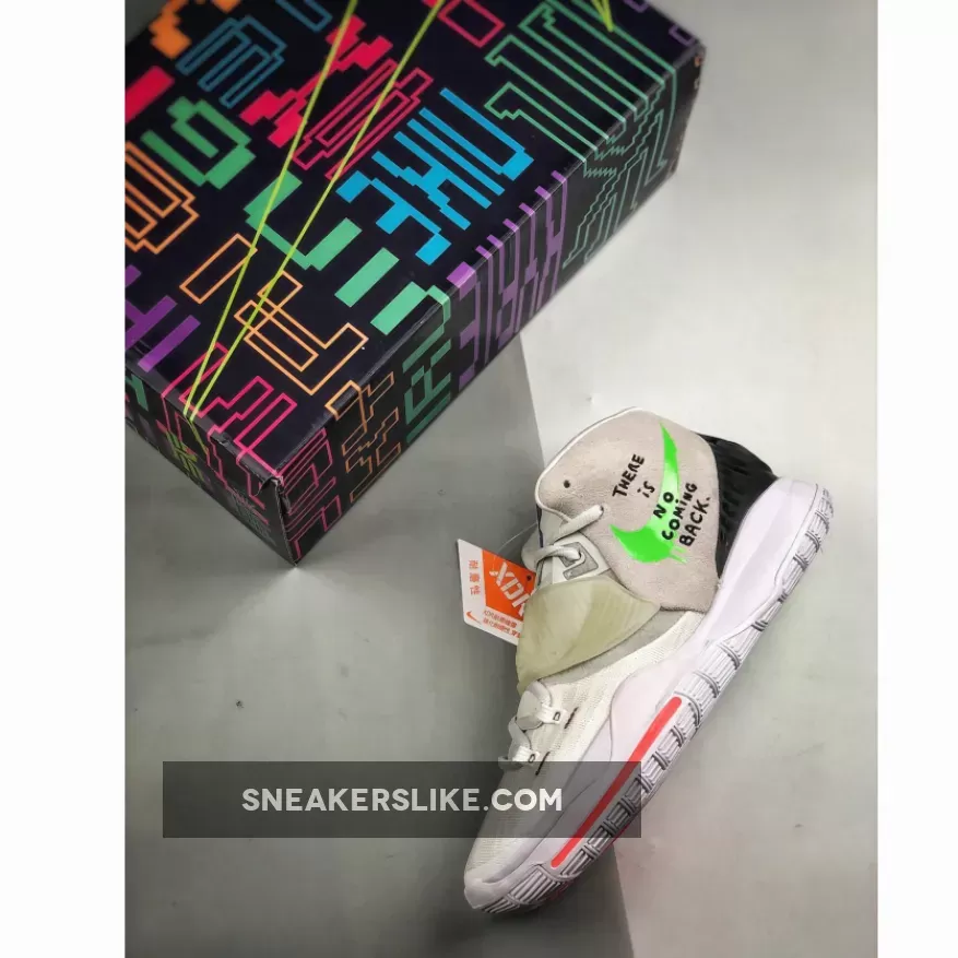 Dressed in a Photon Dust and Green Strike color scheme. This Nike Kyrie 6 features an engineered mesh upper detailed with glow-in-the-dark midfoot straps and Green slime Swoosh logos on the sides. Highlighting the shoe are Black embroidered “There Is No Coming Back” text on the lateral rear, along with a basketball logo embroidered on the toughen of the right shoe.