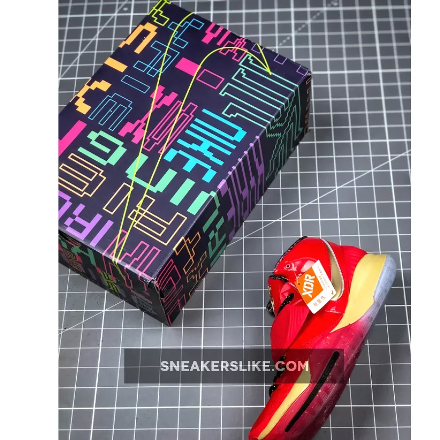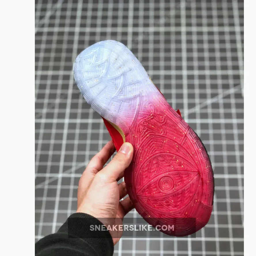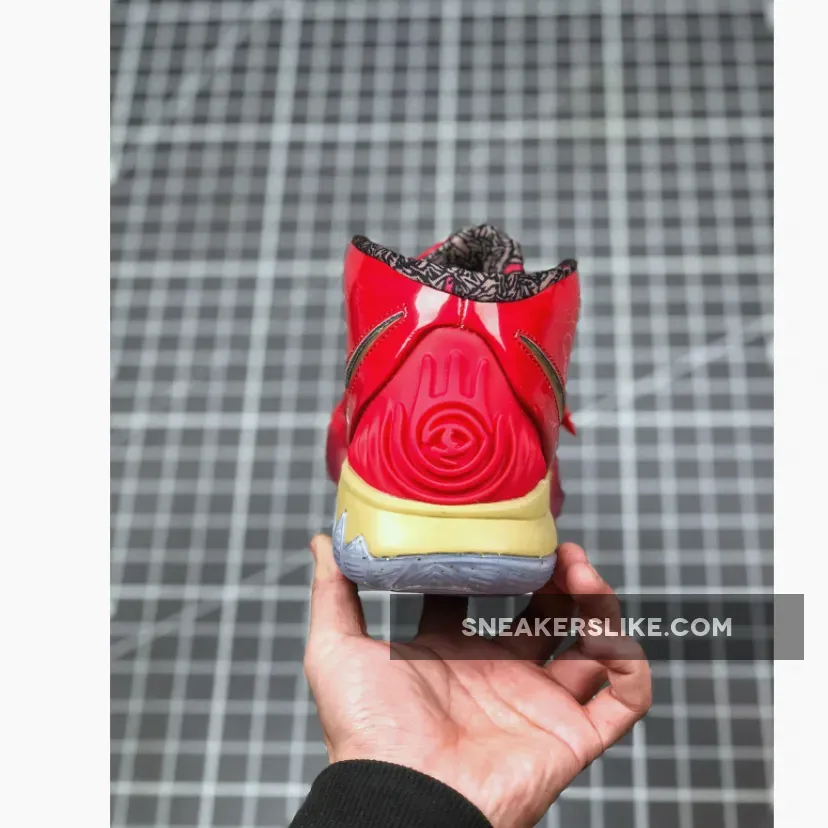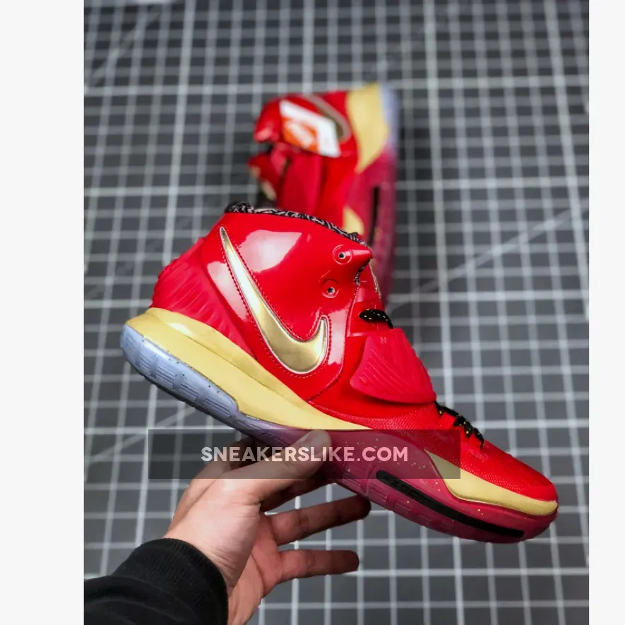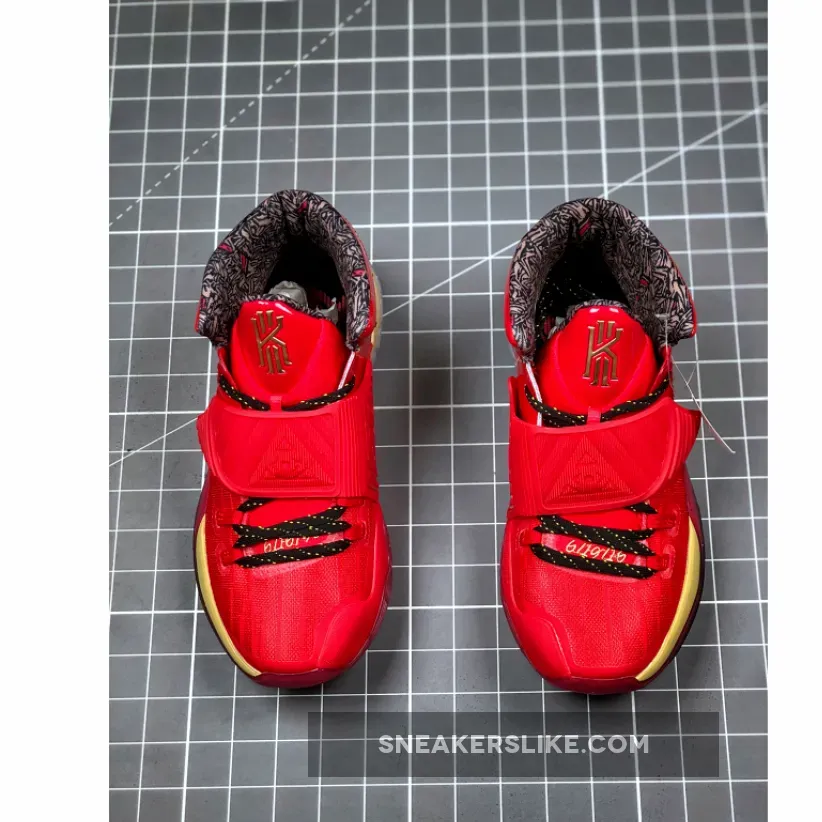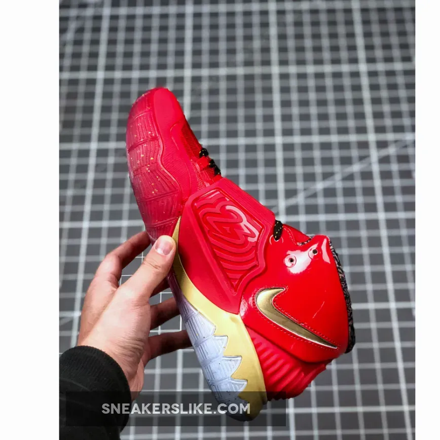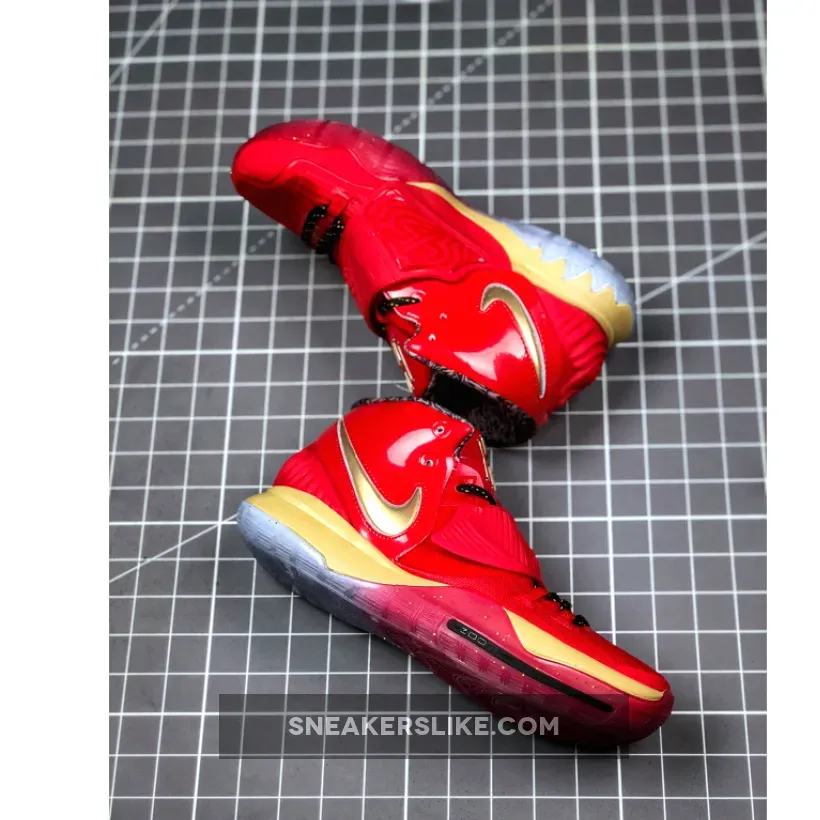 This offering of the Nike Kyrie 6 features a Red base paired with Gold and Black detailing throughout atop a speckled translucent outsole. Other details includes “06/16/96” text on the lower tongue of the right shoe and “06/19/16” on the left nodding to Irving’s only NBA Championship. Completing the design is a graphic inner lining pattern resembling the carpet that MJ laid on crying after winning his first NBA title after losing his father.