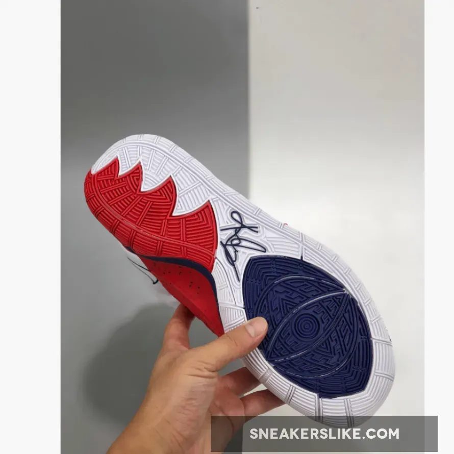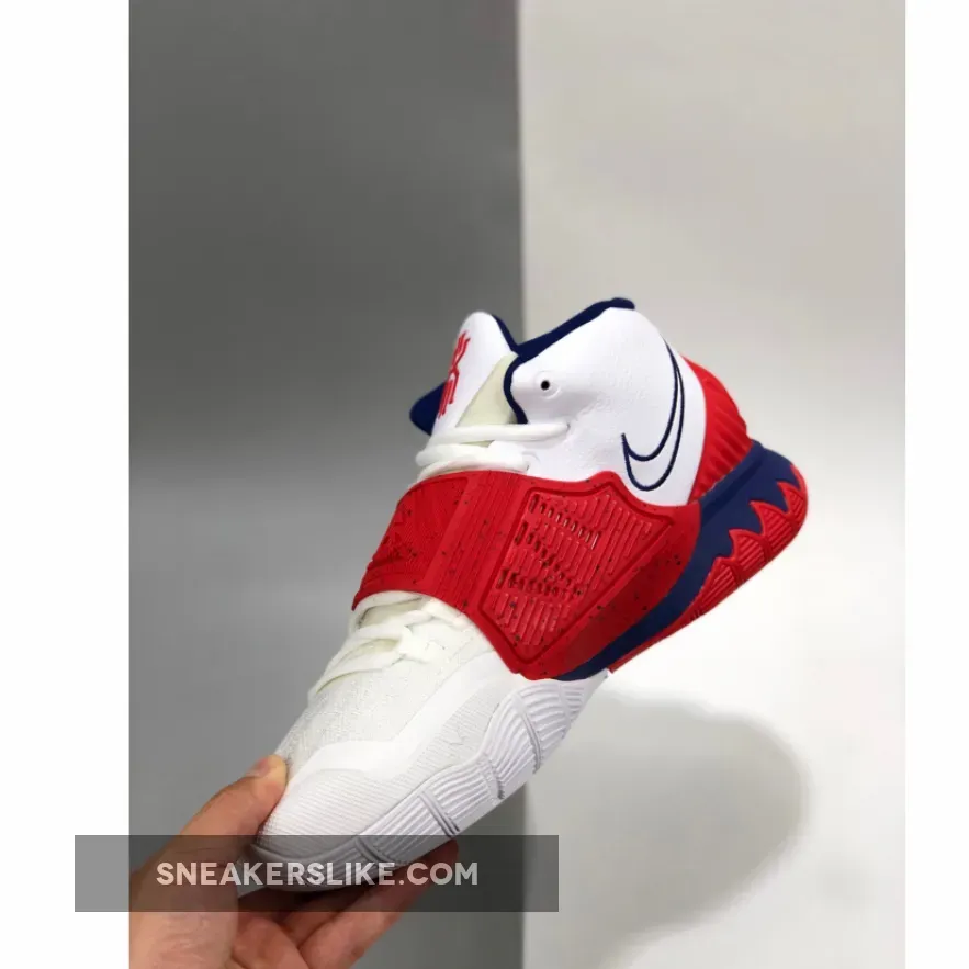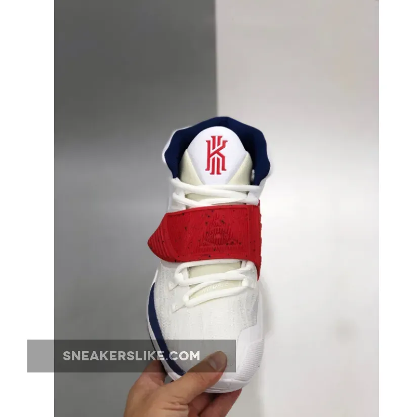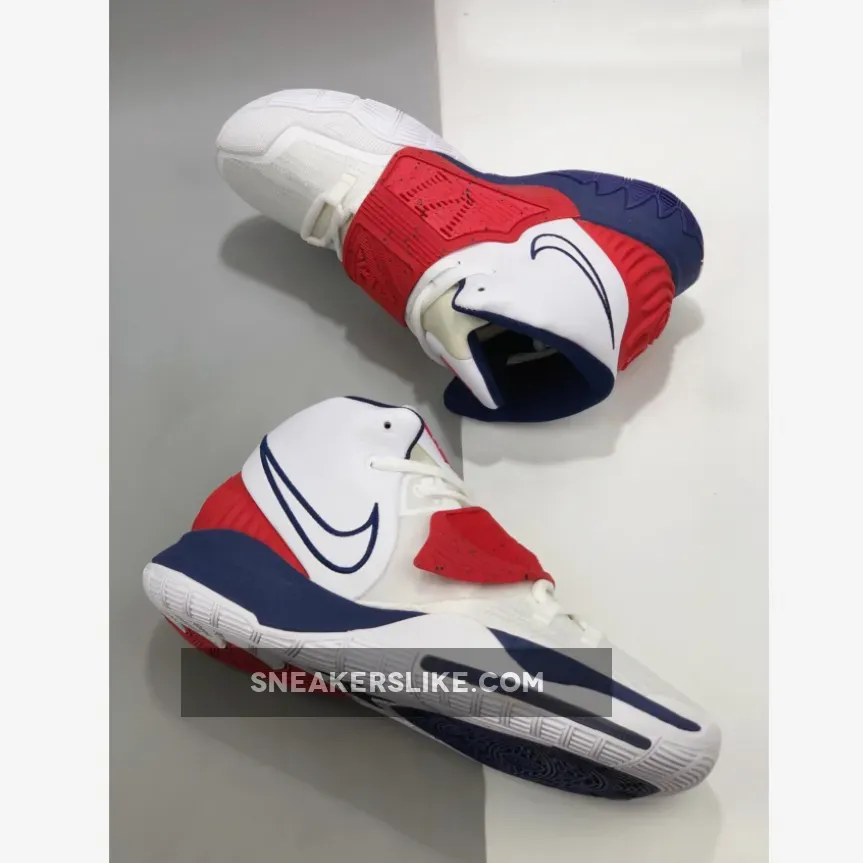 This “USA” edition of the Kyrie 6 sports a White mesh and leather upper paired with Navy embroidered Swooshes, lining, and midsole. Red detailing covers the midfoot strap, tongue branding and heel piece atop a White rubber sole.