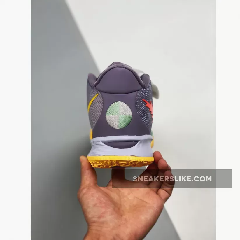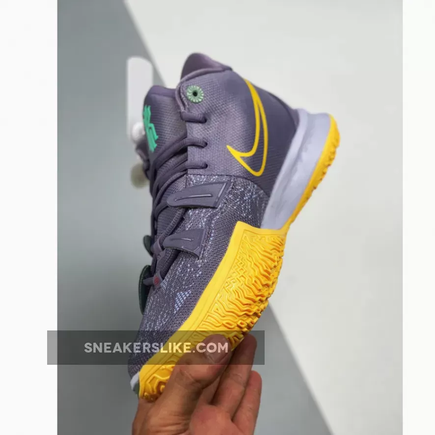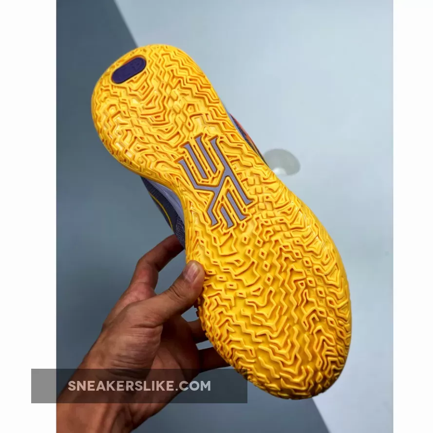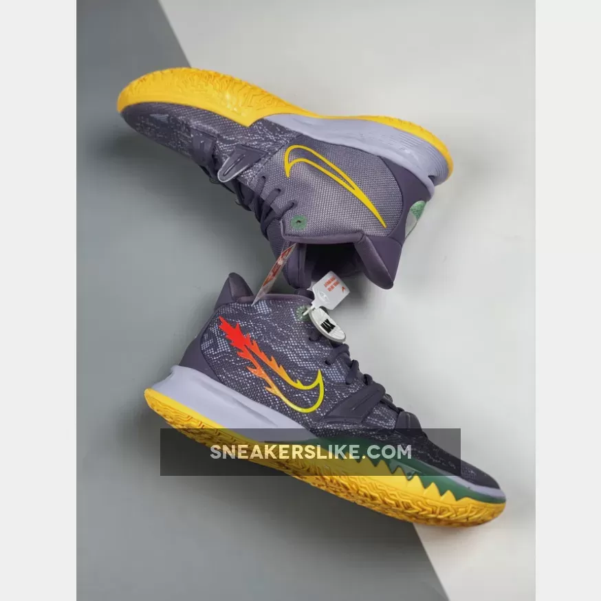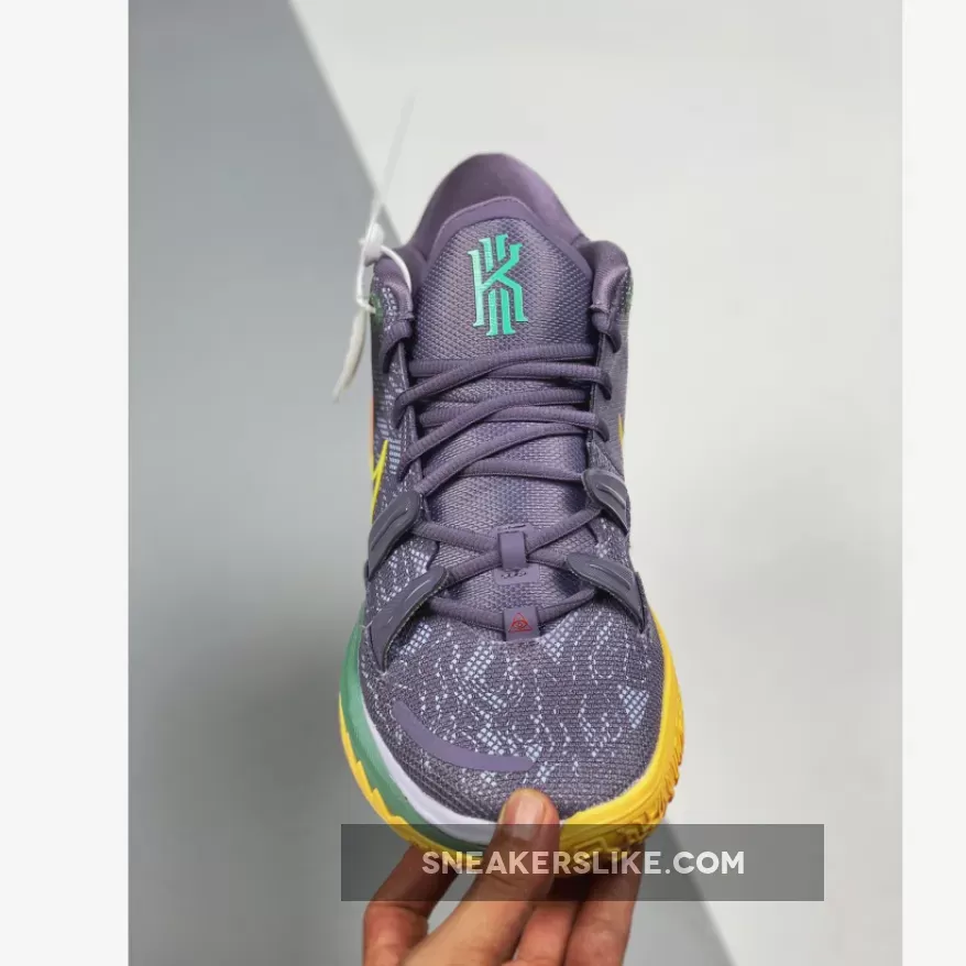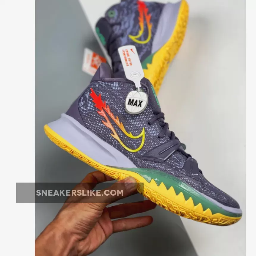 Dressed in a Daybreak, Citron Pulse, Siren Red, and Ghost color scheme. This Nike Kyrie 7 features a Grey-based upper with a Yellow outlined Swoosh on the medial and a gradient flaming Swoosh on the lateral.