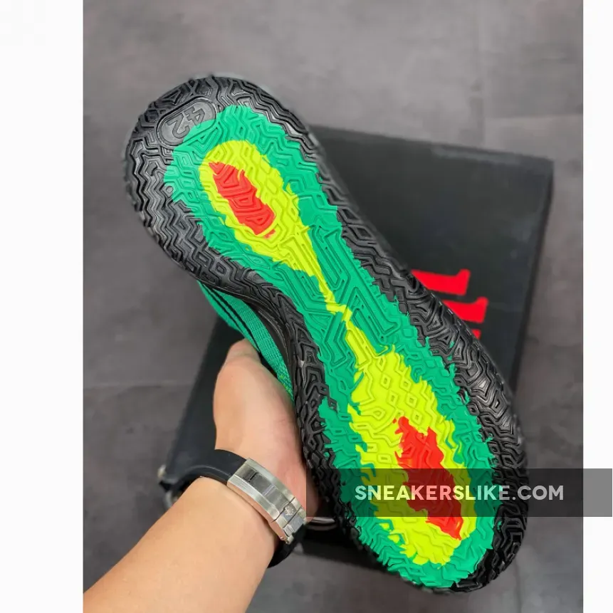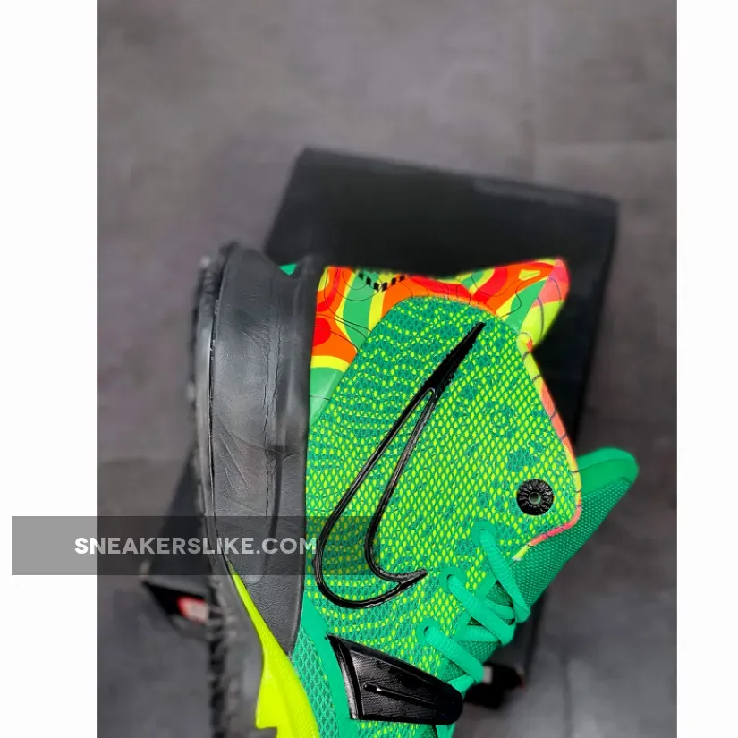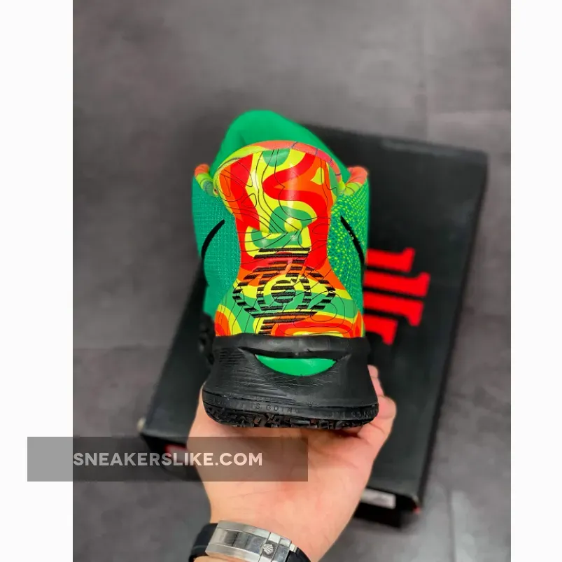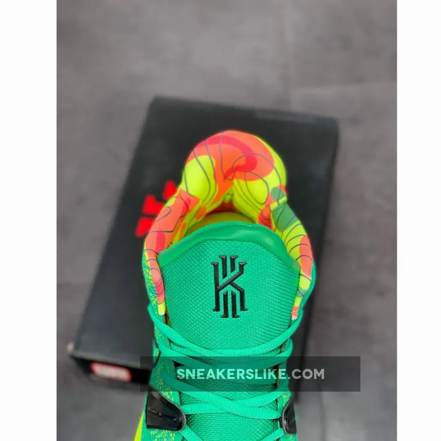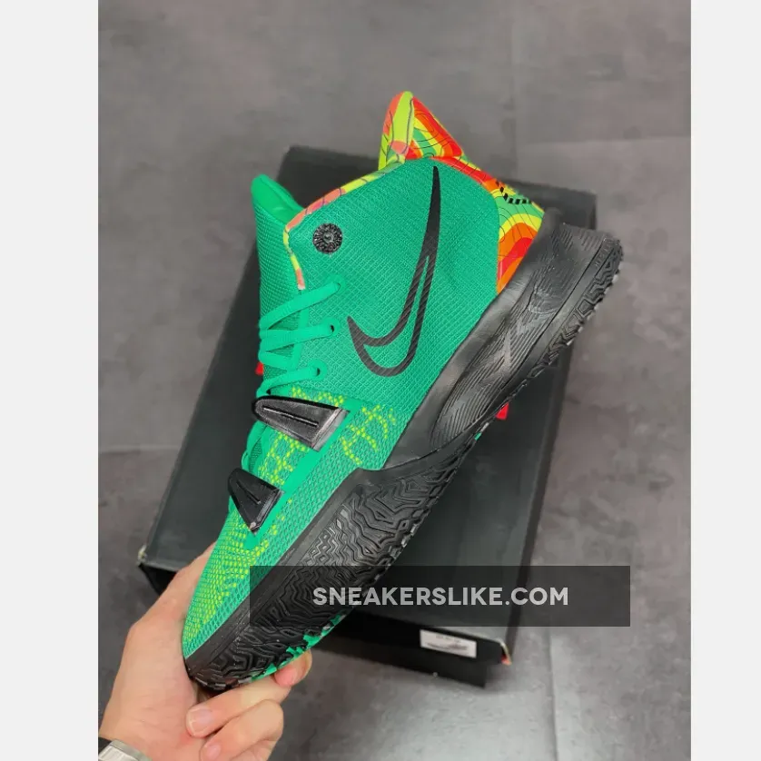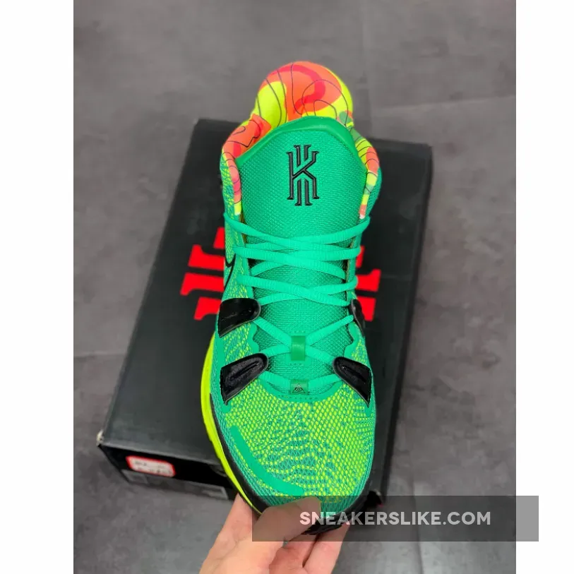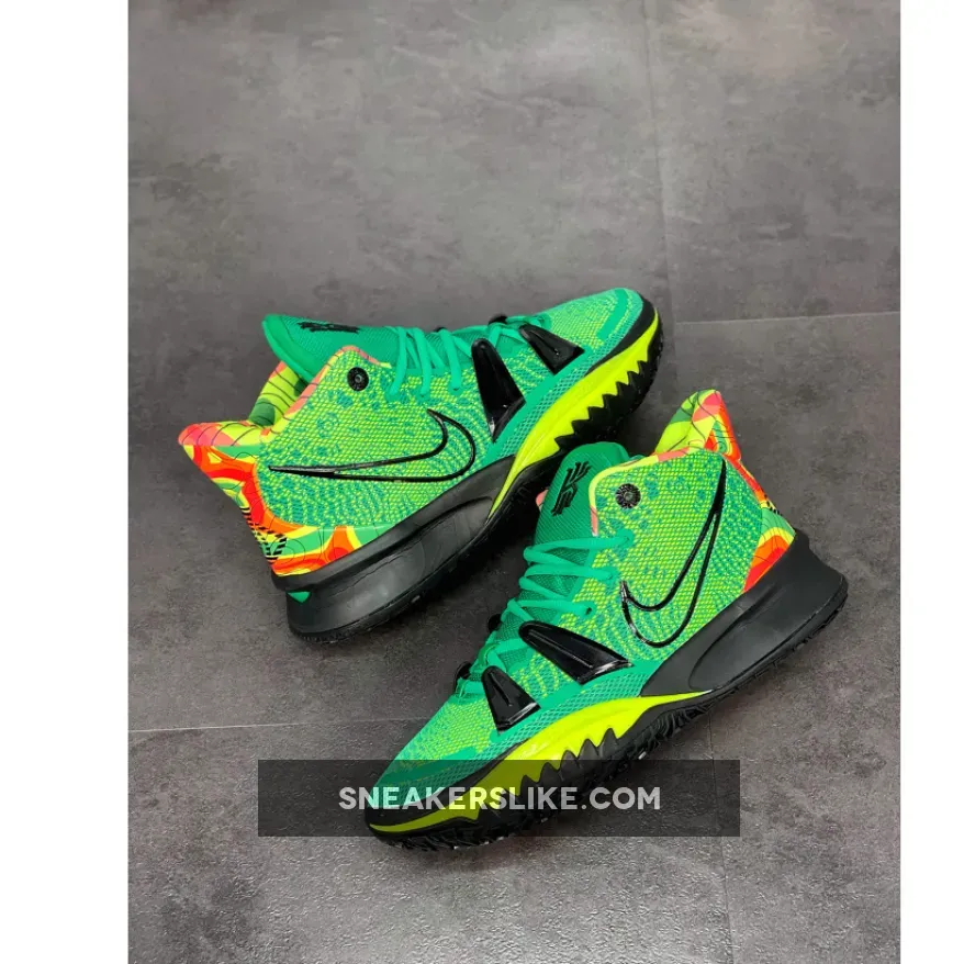 This edition of the Nike Kyrie 7 sports a similar Green base as a nod to a Green screen with the bold weather inspired heat-map pattern wrapping the heel.