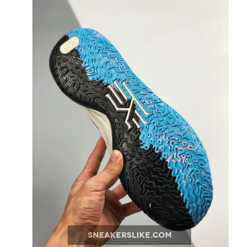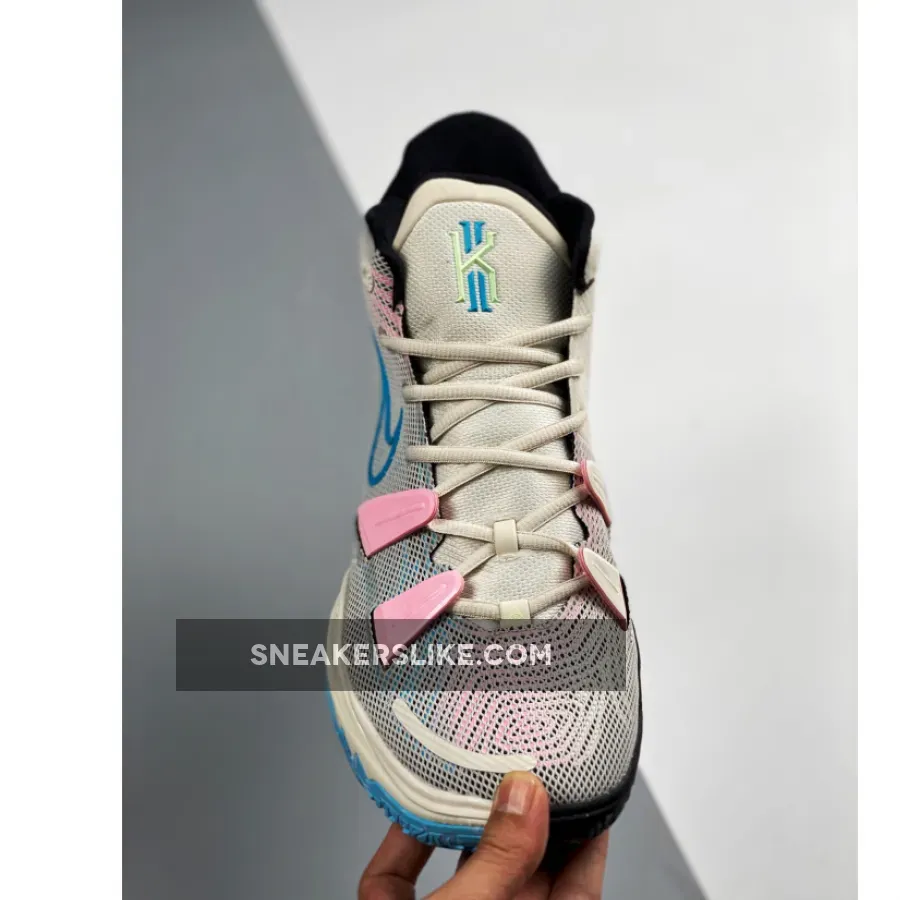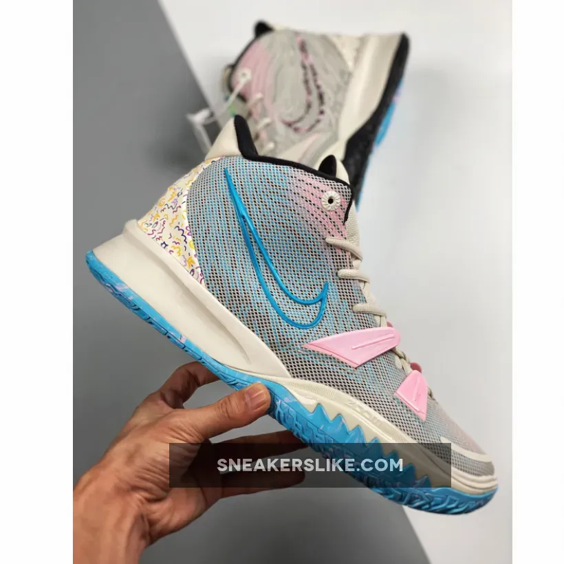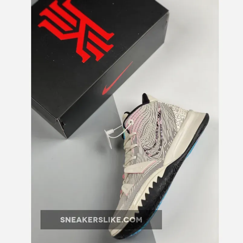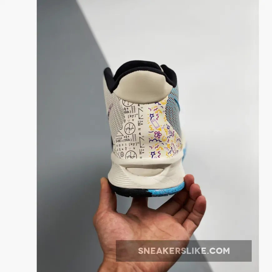This Nike Kyrie 7 comes dressed in a Pale Ivory, Chlorine Blue, and Black color combination. Constructed with mesh on the upper and plastic overlays, while an array of colors splash the tongue and Swoosh logos. Next, we have playful drawings and mathematic graphics on the heel.