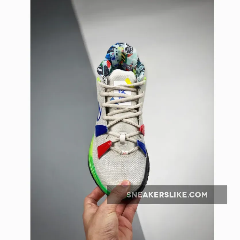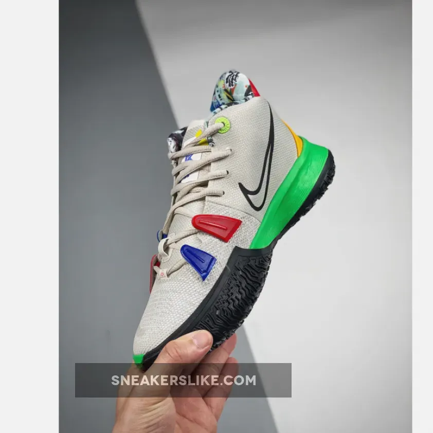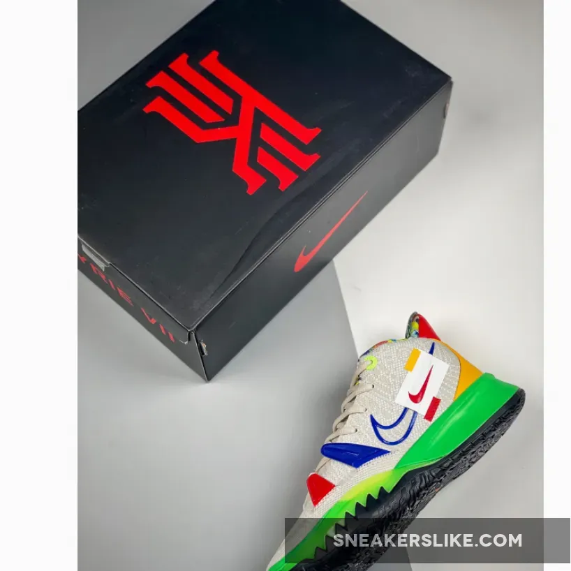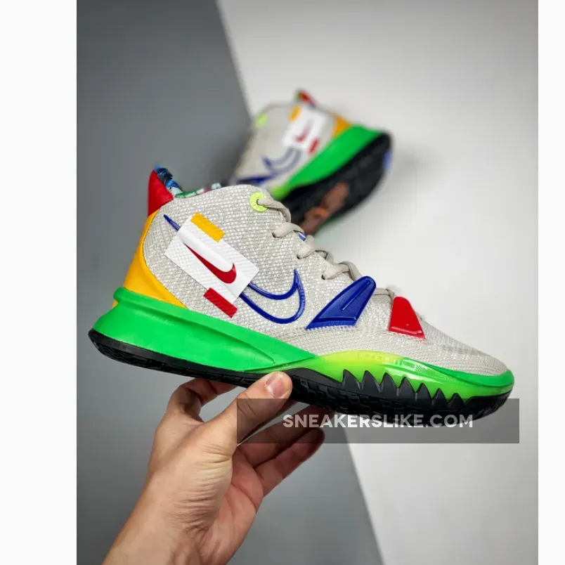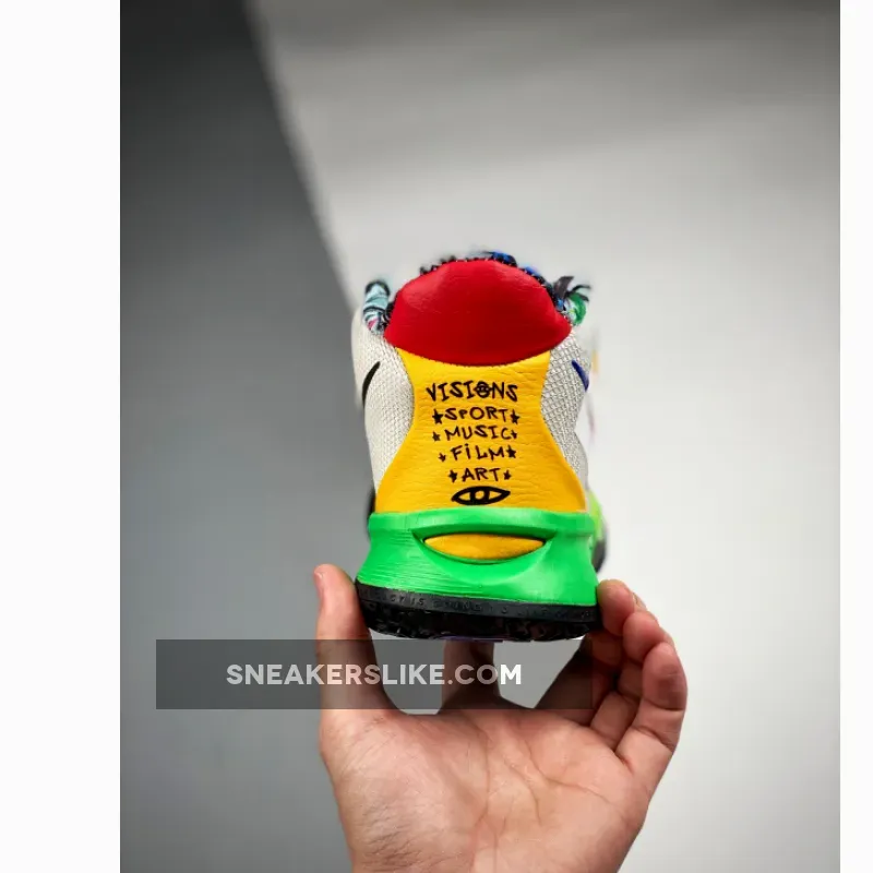 This offering of the Nike Kyrie 7 features a White base highlighted with Red, Blue, and Yellow contrasting accents along with Neon Green on the upper eyelets that matches the shoes midsole. Adding to its theme is a Yellow heel tab with a list of Irving’s love for sport, music, film, and art.