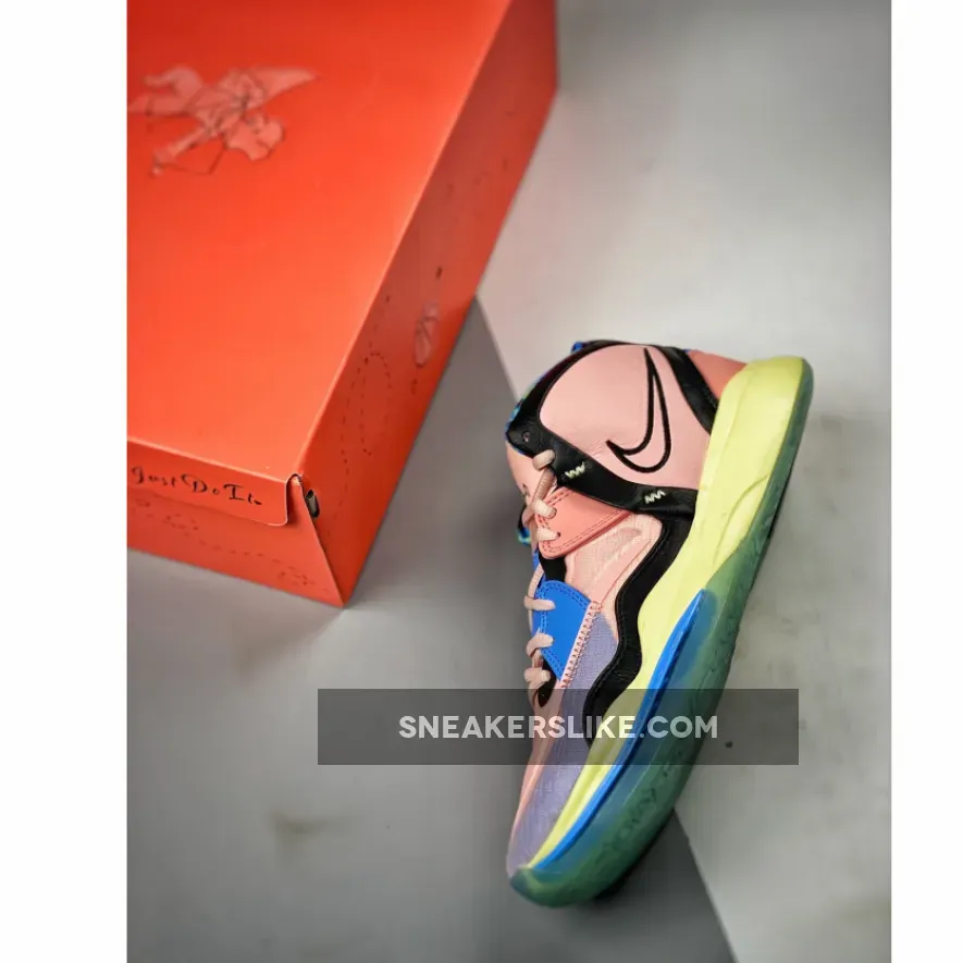 The Nike Kyrie 8 Valentine’s Day comes dressed in a Pink upper paired up with Blue accents found throughout the upper and sole unit. Other notable details include the Blue-heavy graphics on the lining and heel atop a Pale Yellow midsole. Valentine’s Day motifs come by way of the heart-arrowed basketball on the left tongue with a cupid logo on the insole.