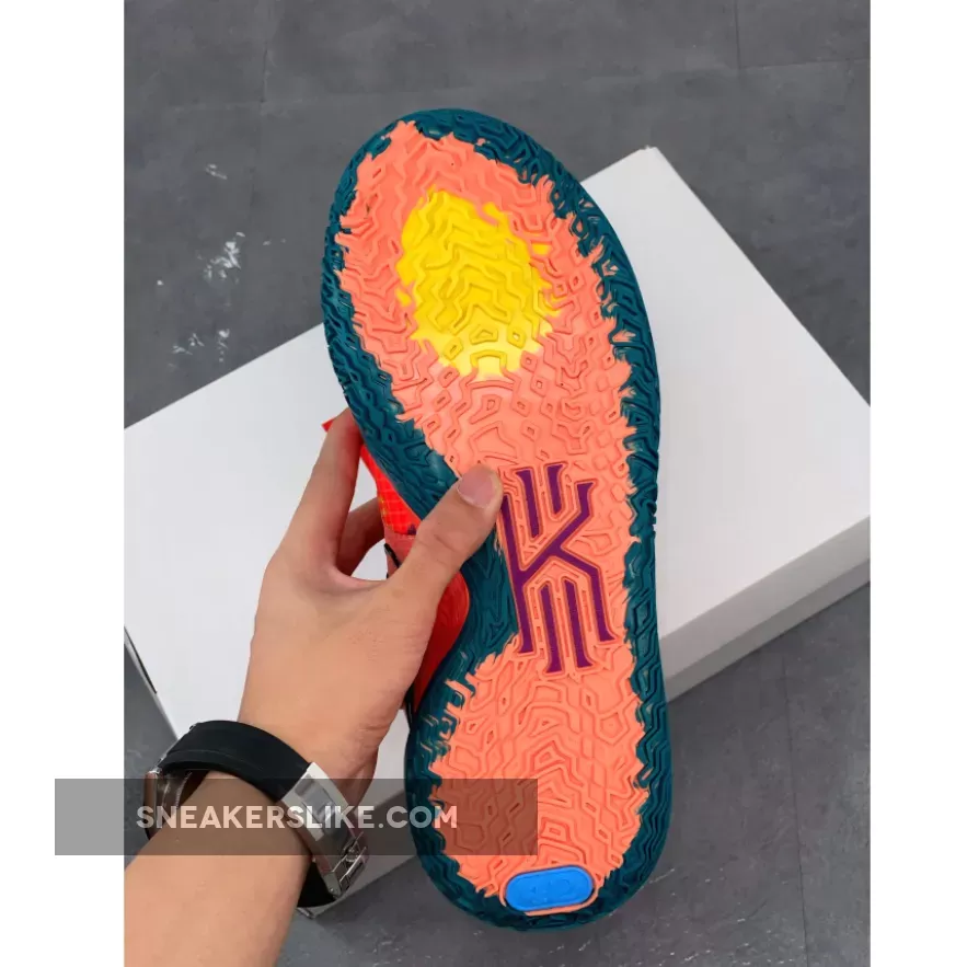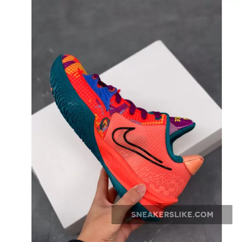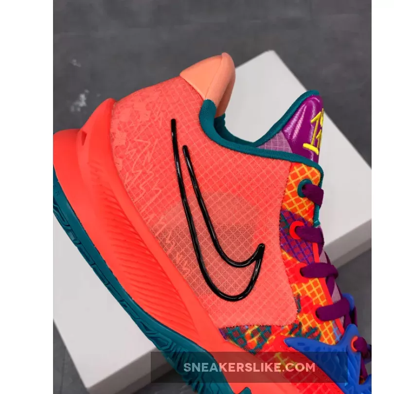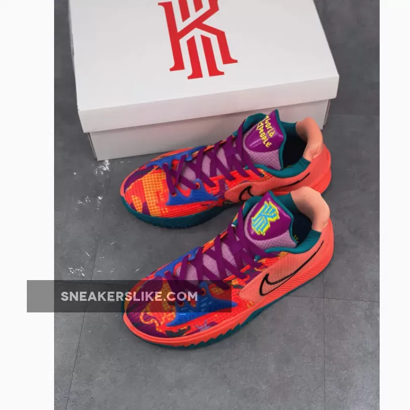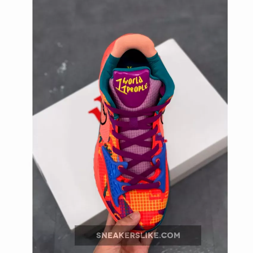 This offering of the Nike Kyrie Low 4 comes dressed in a Peach-like color blocking detailed with colorful graphics covering the toe area and up the eyestays. Other details includes Black outlined Swooshes on the sides, Blue and Teal contrasting accents with Maroon laces and tongues. “1 World 1 People” is branded on the right tongue that also comes with a stencil pack in a special edition branded shoe box.