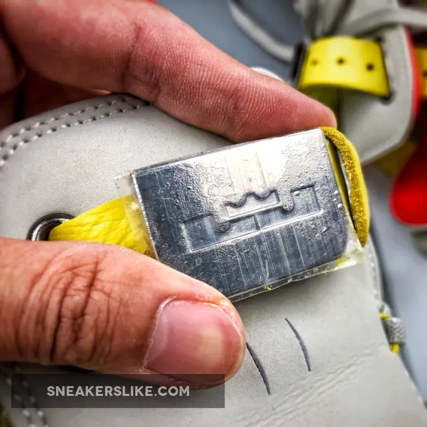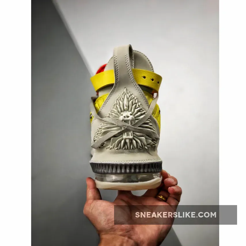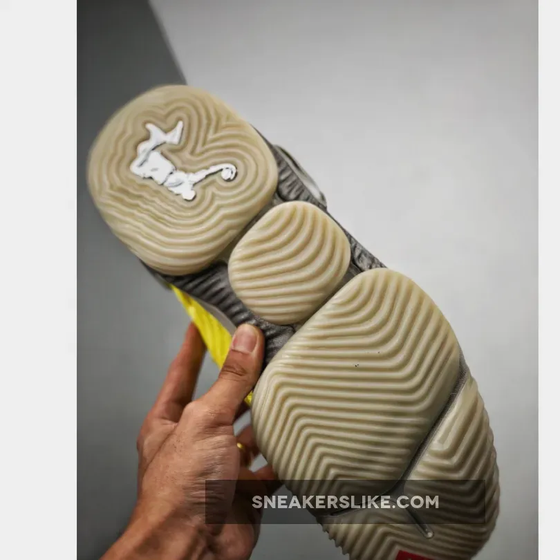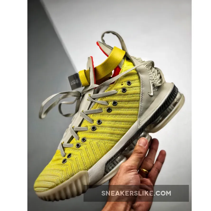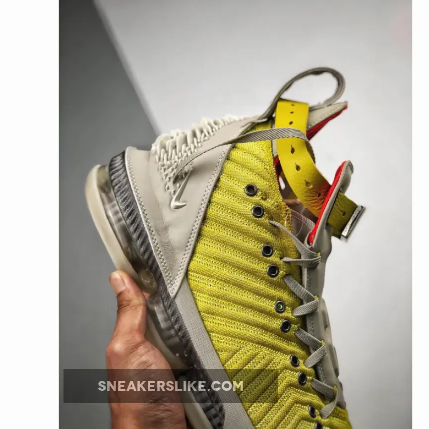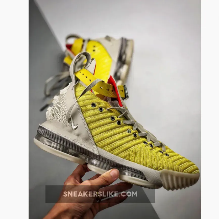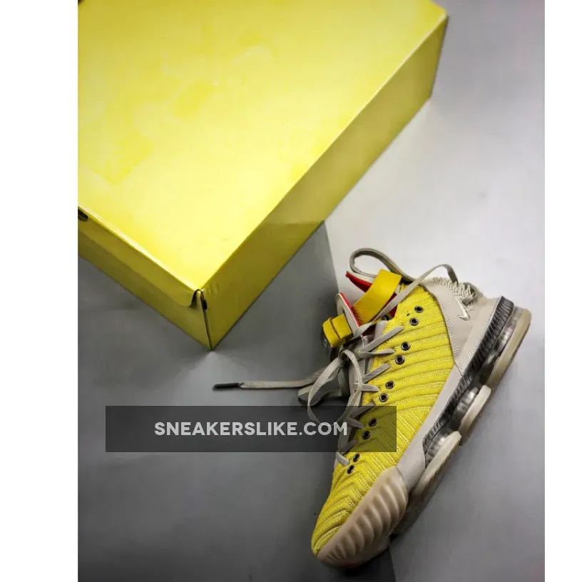 Dressed in a Bright Citron and Summit White color scheme. This HFR x Nike LeBron 16 features a Yellow Battleknit upper, 3D-molded lion’s head that grips the laces in its mouth and a distinctive piece is LeBron’s crown: a detachable leather bracelet you can wear on your wrist.