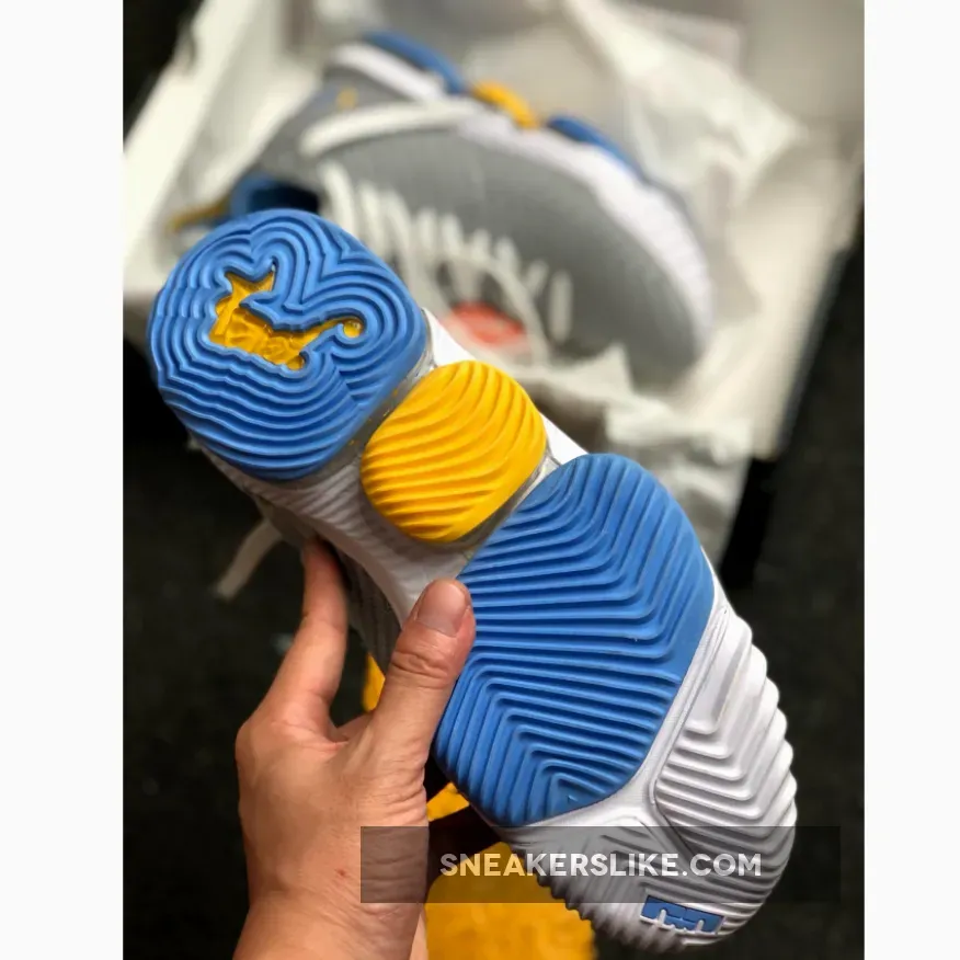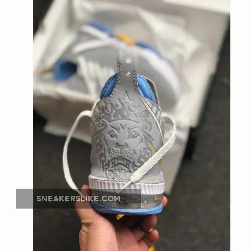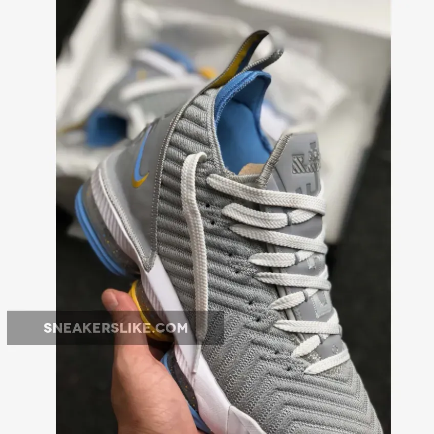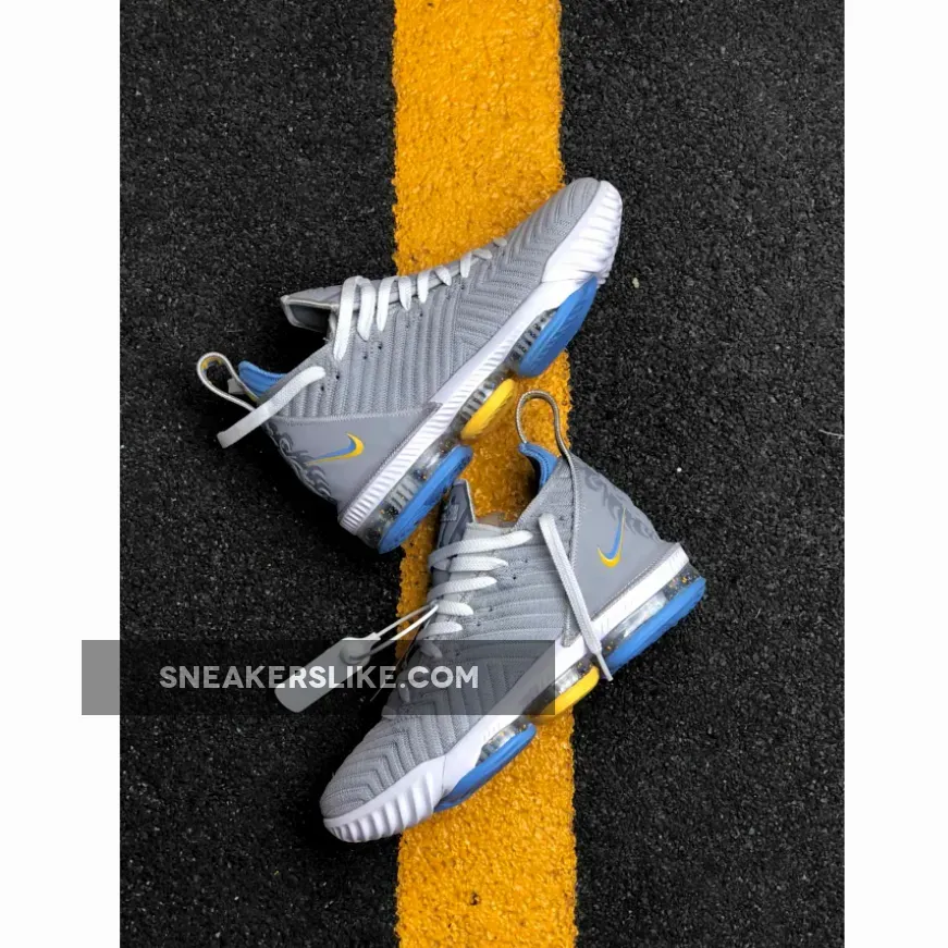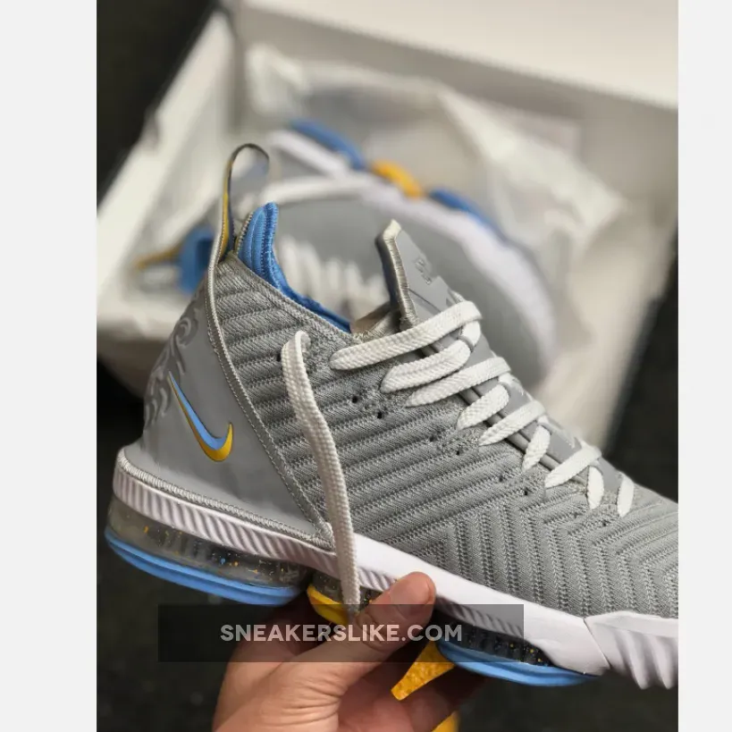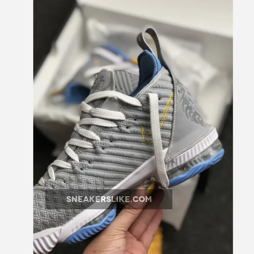 Its color scheme is a nod to the Minneapolis Lakers uniforms from the ’50s, this Nike LeBron 16 features a mix of Grey hues on its upper, tongue and heels. Giving off that MPLS vibe are Blue and Gold contrasting accents throughout.