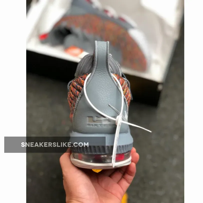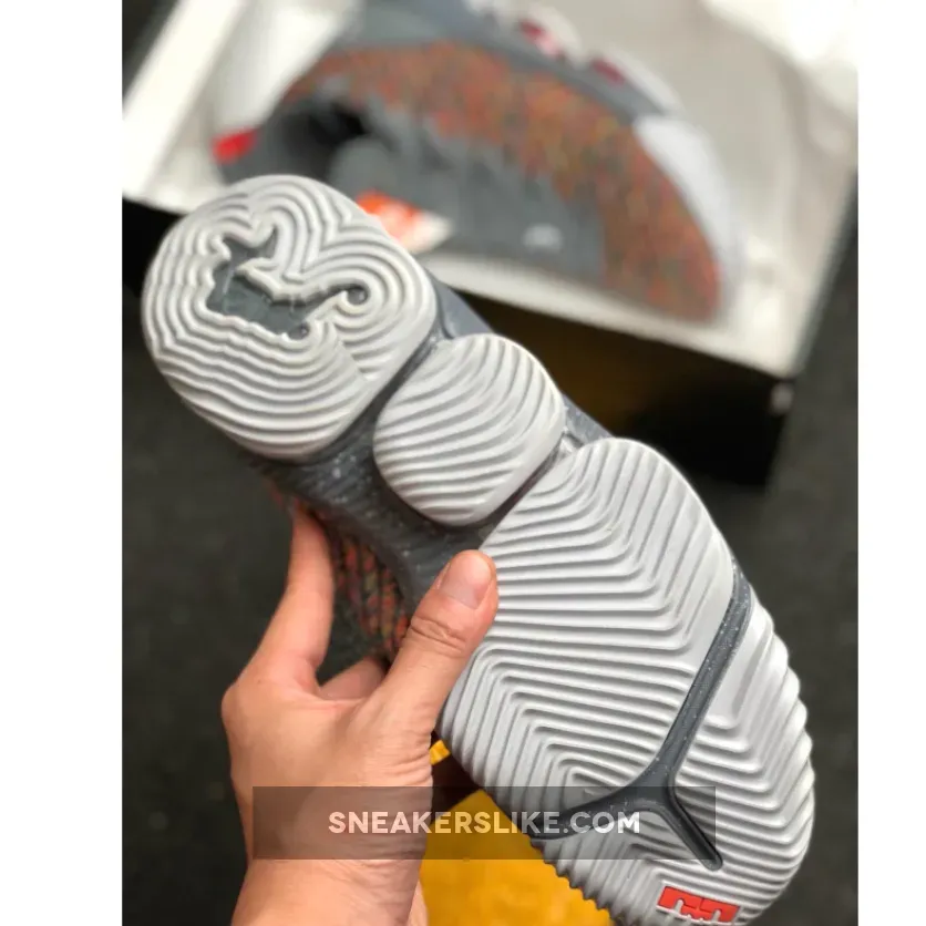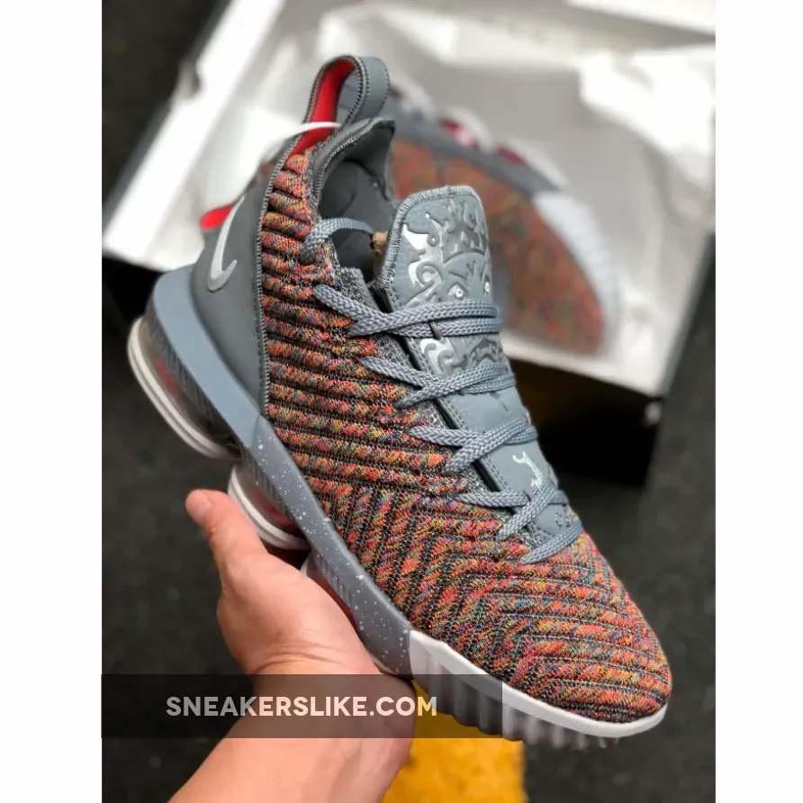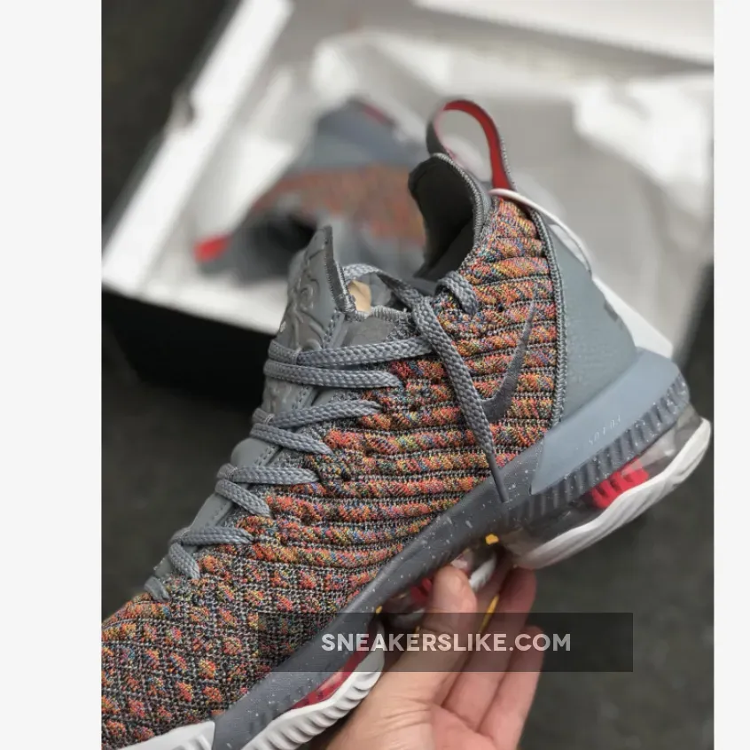 Dressed in a Multi-Color, Metallic Silver, and Cool Grey color scheme. This Nike LeBron 16 features a full Multicolor Battleknit 2.