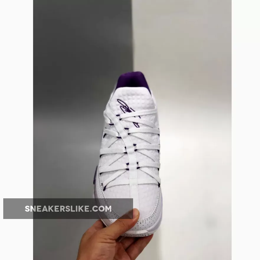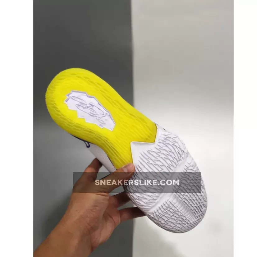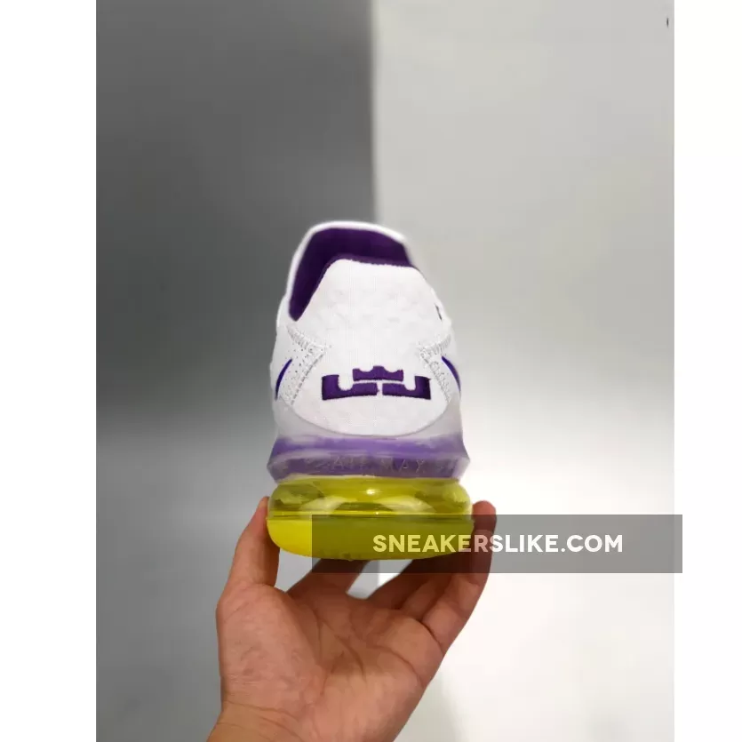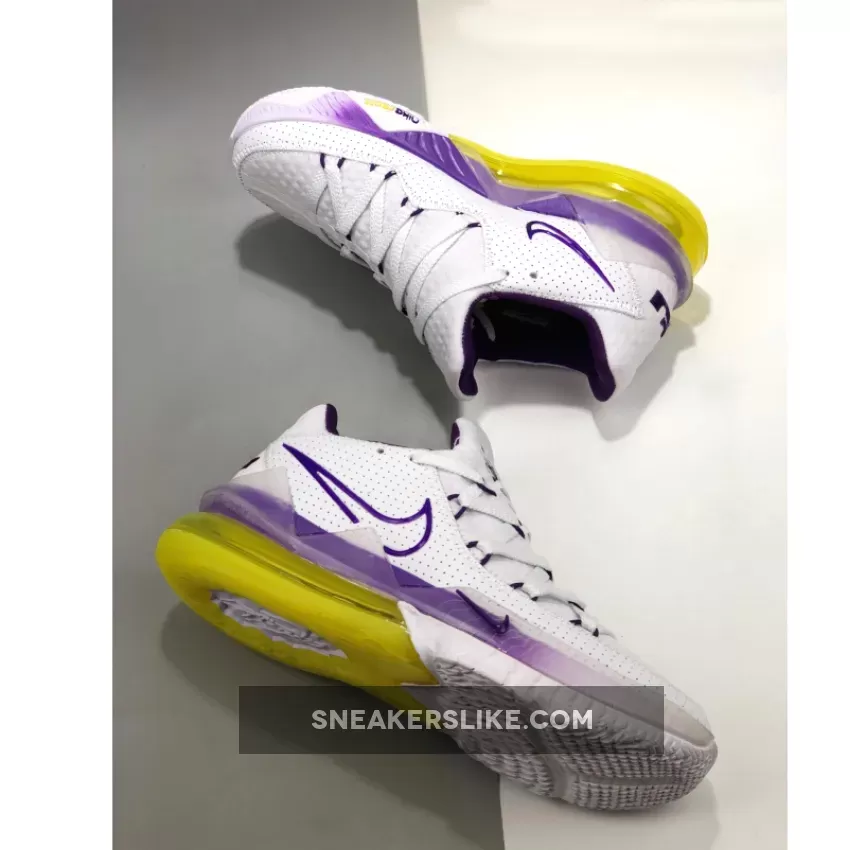 Dressed in a White, Voltage Purple, and Dynamic Yellow color scheme. This low-top Nike LeBron 17 features a White perforated upper detailed with Purple accents and Yellow covering the heel Air bubble. Finishing off the theme is King James’ first and last name printed on the insoles in Lakers font.