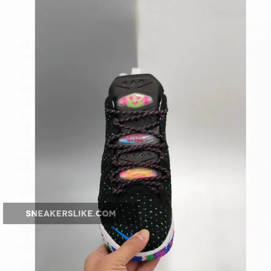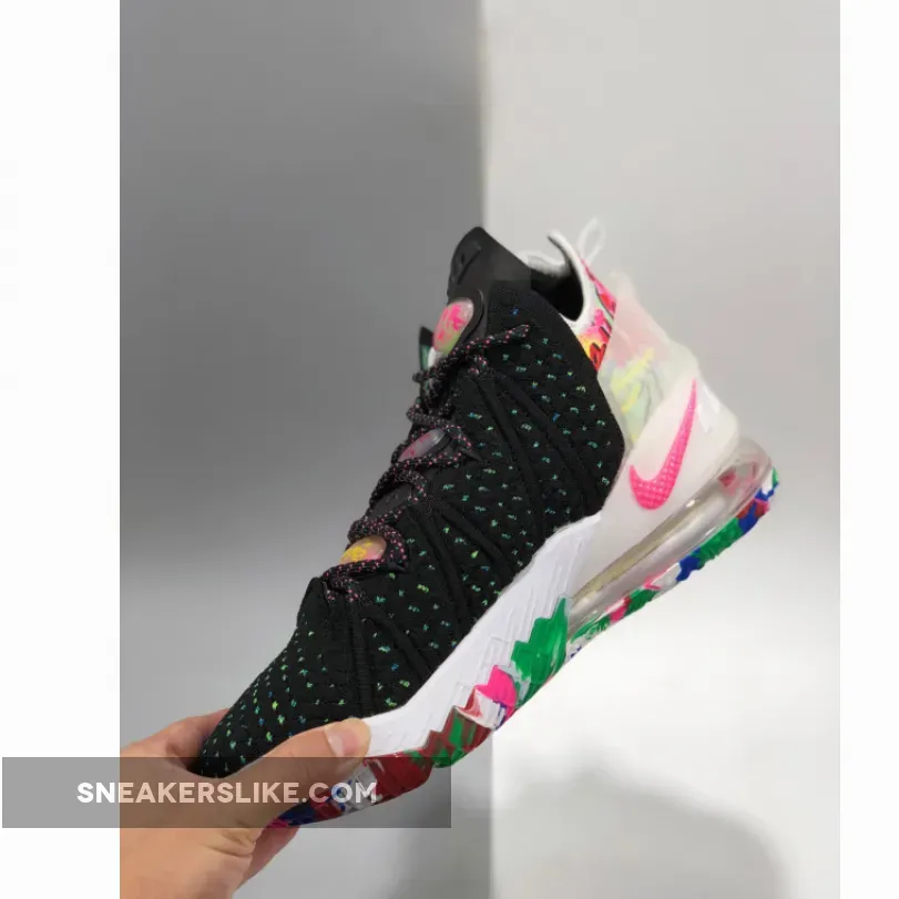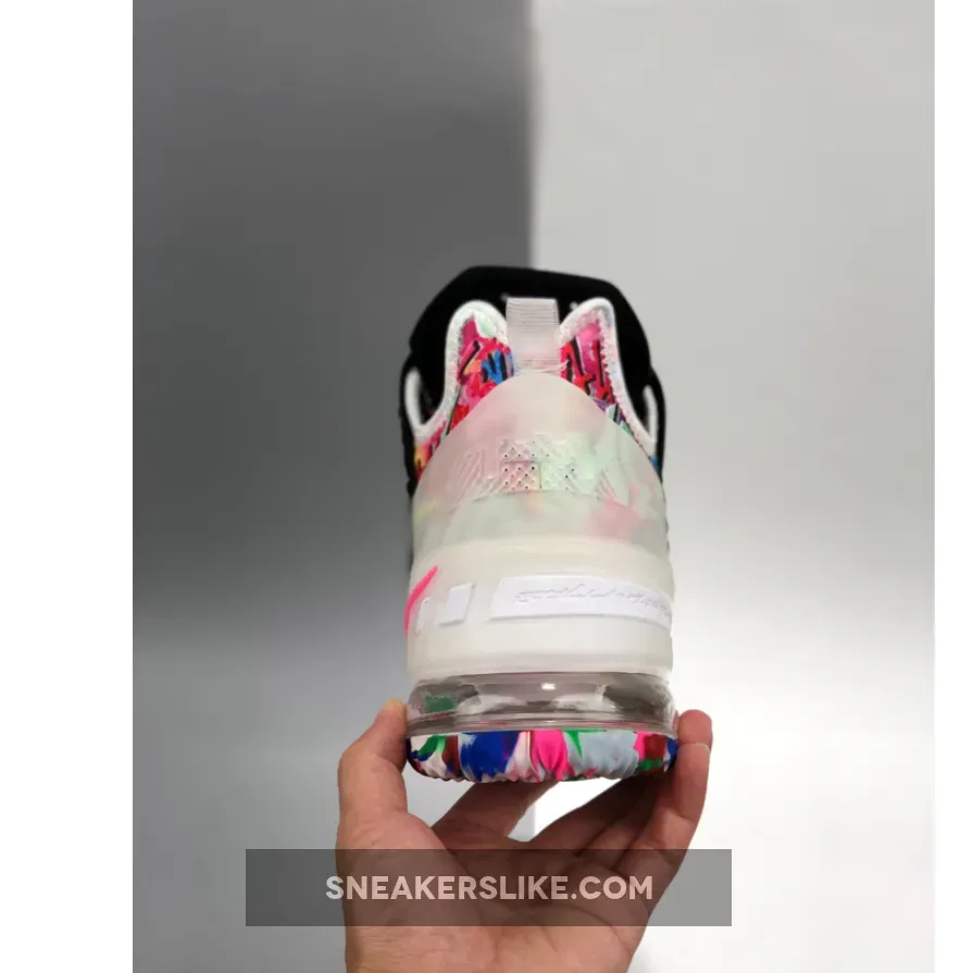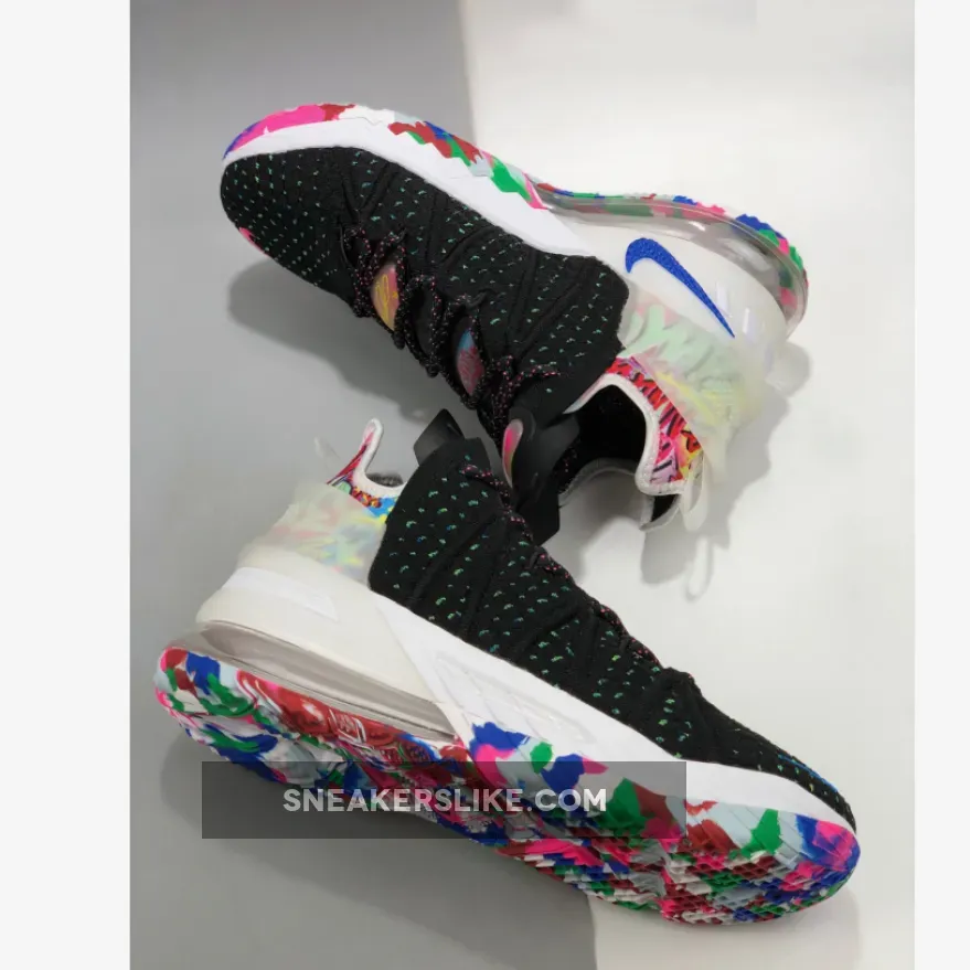 This offering of the LeBron 18 features a predominately Black knitted upper that’s contrasted with multicolored accents throughout.
