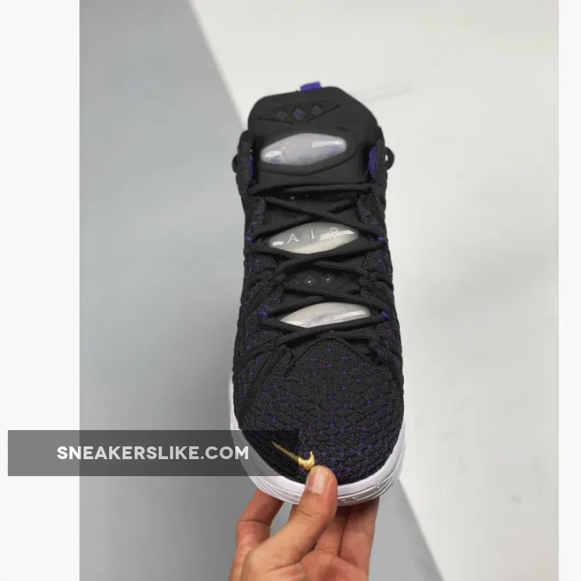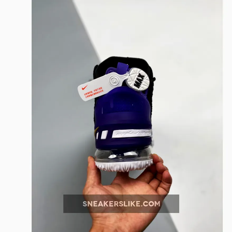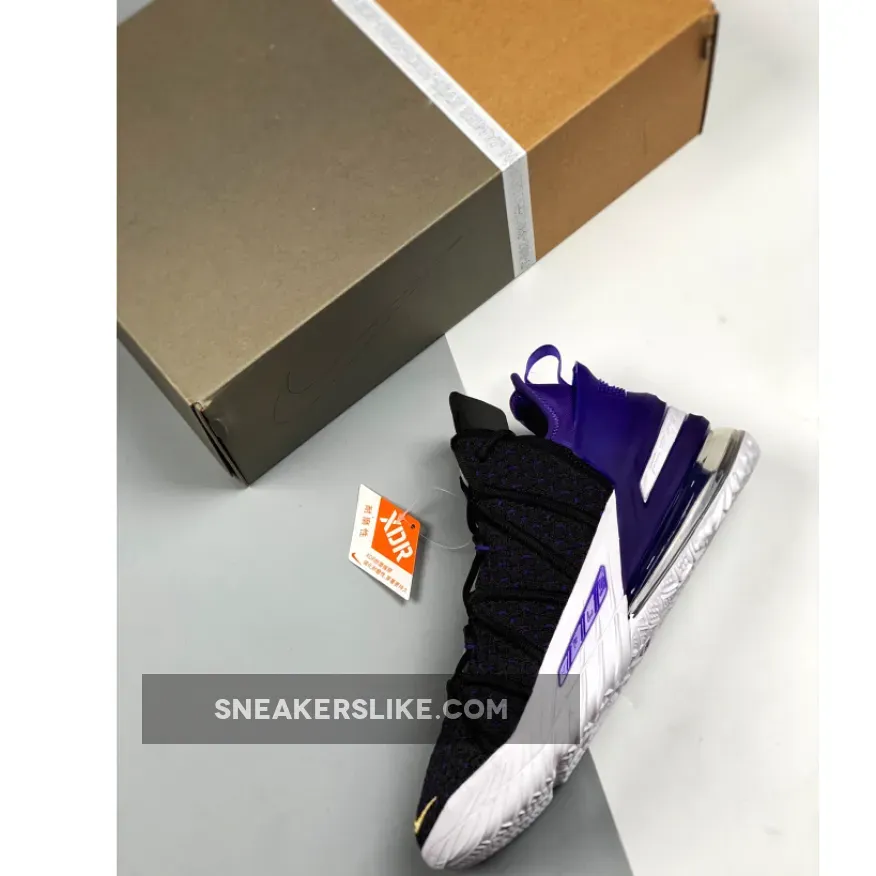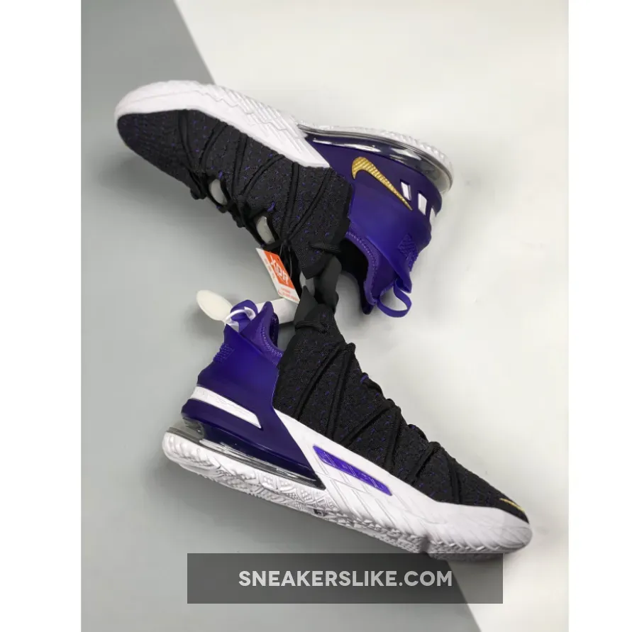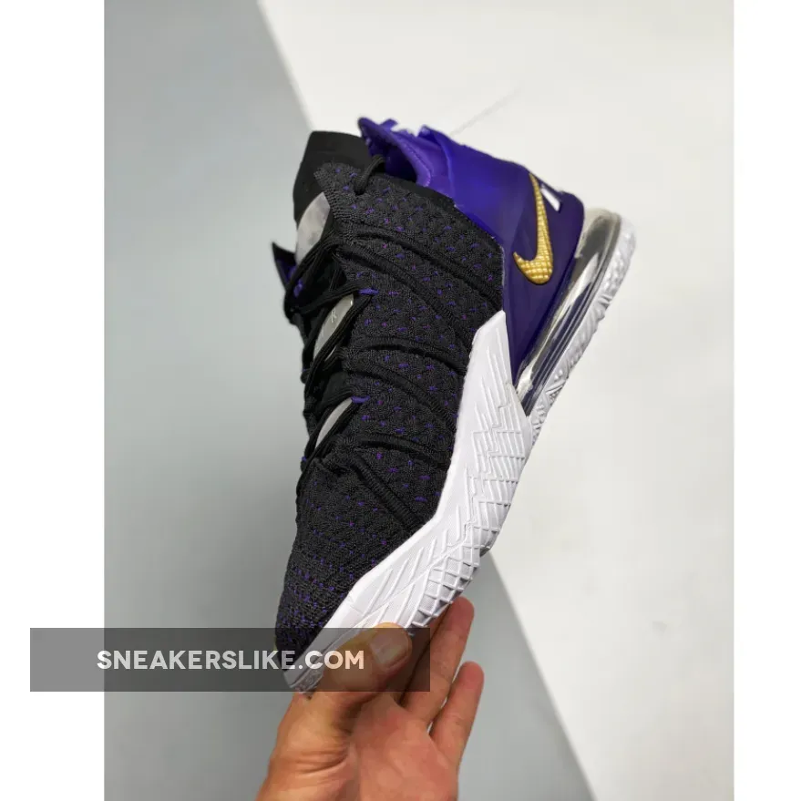Dressed in a Black, Metallic Gold, Court Purple, and White color scheme. This Nike LeBron 18 features a Black Knitposite 2.0 upper with Purple thread and durable molded heel clip. Gold Swooshes on the toe and medial heel with “LeBron James” in the Lakers font printed on the insoles atop a full-length Air Zoom unit combined with a Max AIR unit in the heel completes the design.