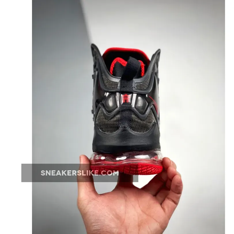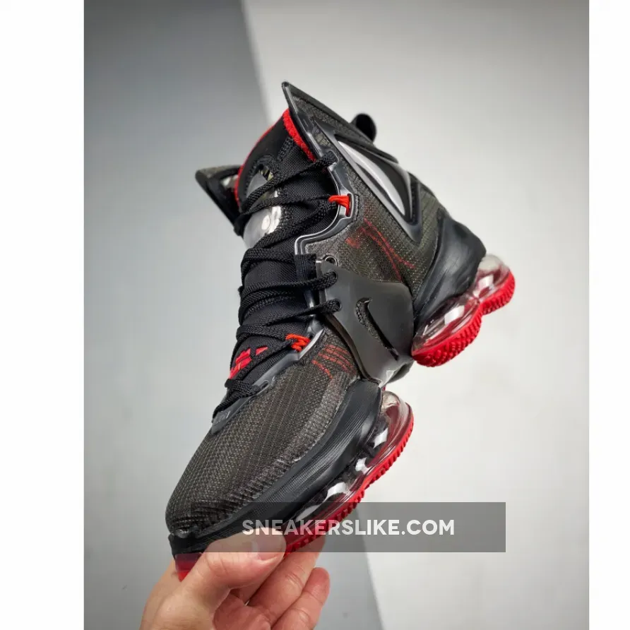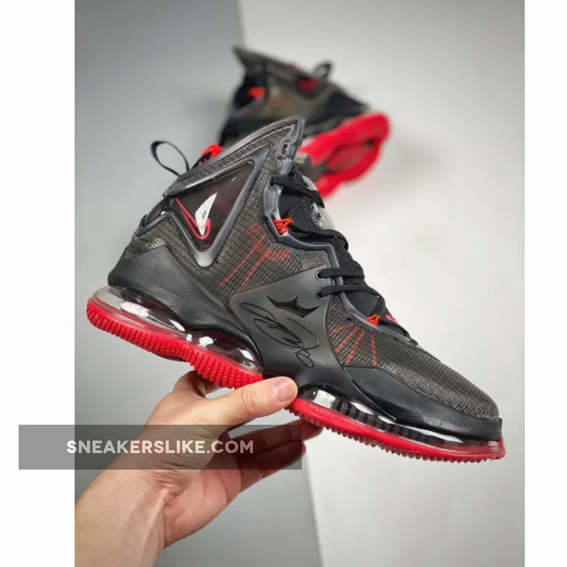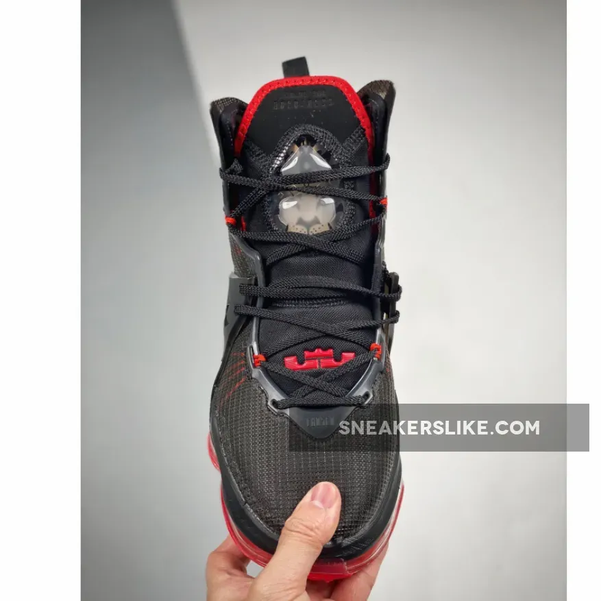 The Nike LeBron 19 uses a bootie construction with a black neoprene bootie and black multilayered mesh overlay that’s semi-transparent. Red accents the sneaker, with the Flywire cables underneath the mesh overlay and on the lining of the bootie and Swoosh. The ankle collar features either a jeweled or Air Max cushioning and a TPU overlay that extends from the lateral laces, underneath the sneaker to the medial laces. As far as cushioning, the Nike LeBron 19 uses a visible Zoom Air unit in the forefoot and a large Air Max unit in the heel.