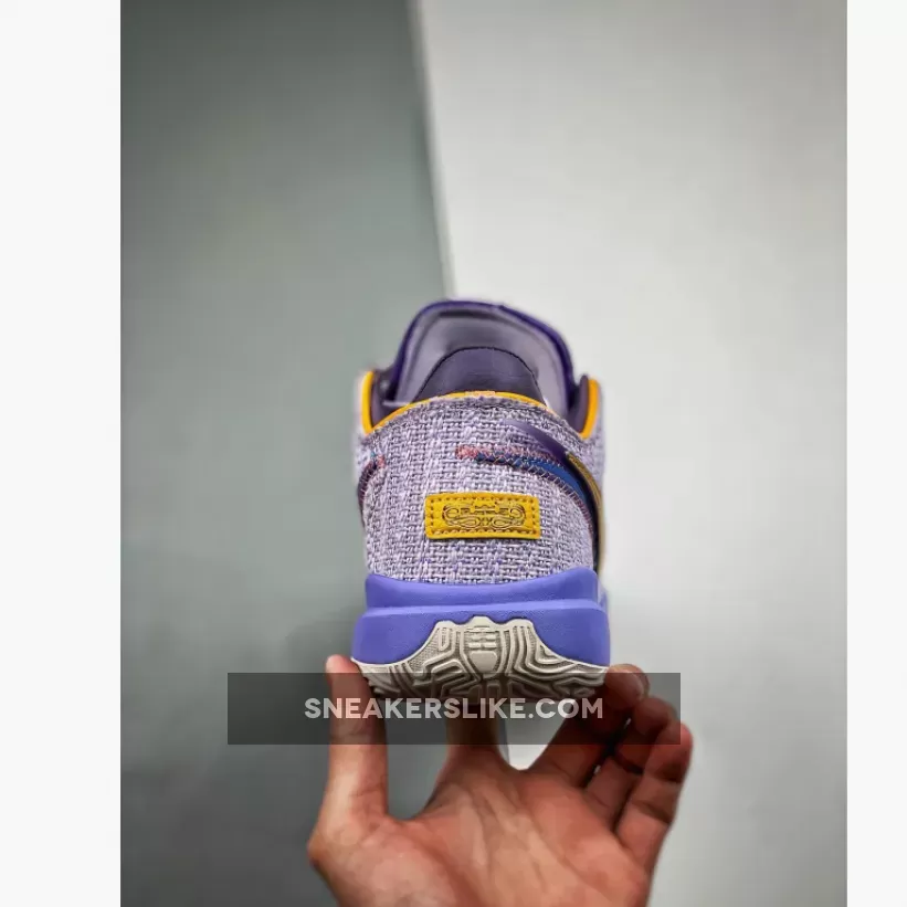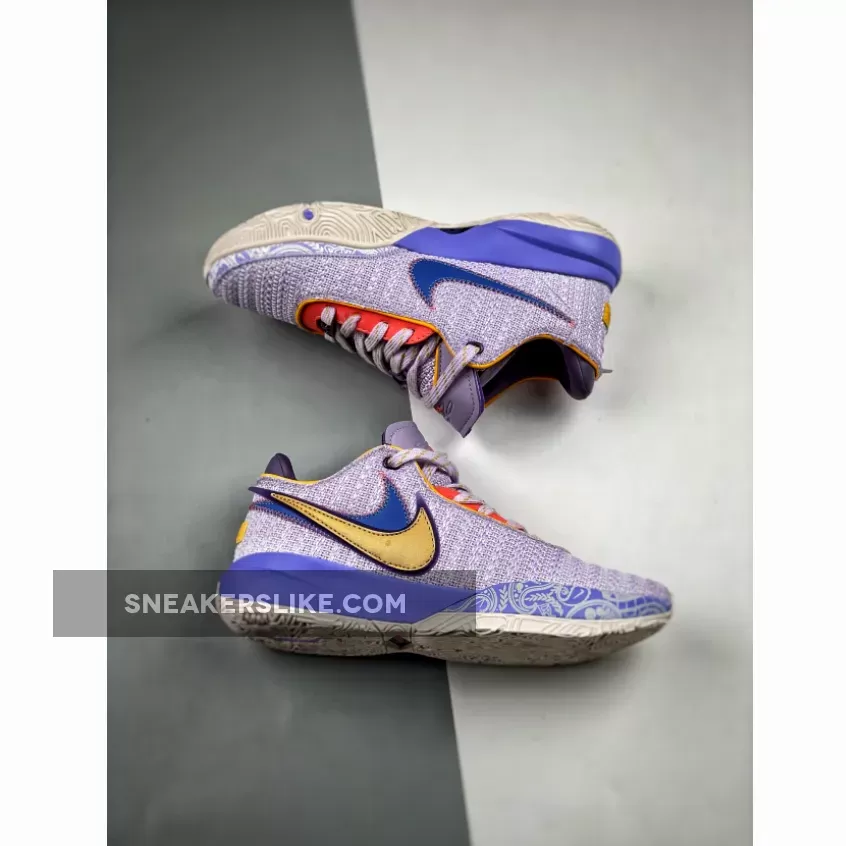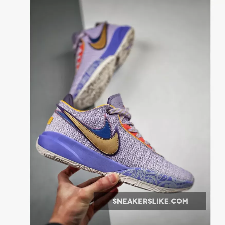 Dressed in a Vivid Purple, Metallic Gold, Black, Cave Purple, Lilac, and Solar Flare color scheme. This offering of the Nike LeBron 20 features a knitted upper with double-stacked Swooshes on the lateral and special “XX” lace dubraes and insole branding. A graphic print decorates the forefoot area of the midsole atop a multidirectional rubber outsole completes the design.