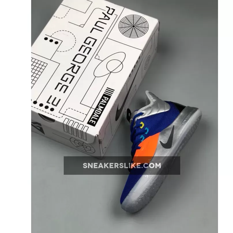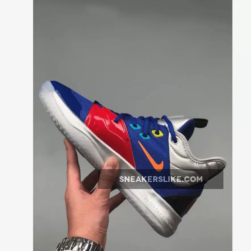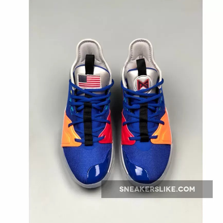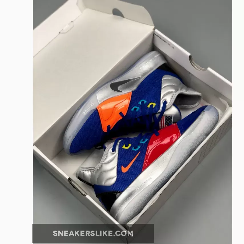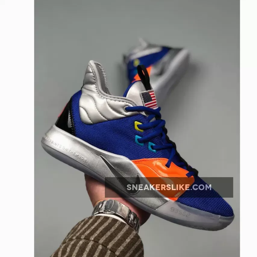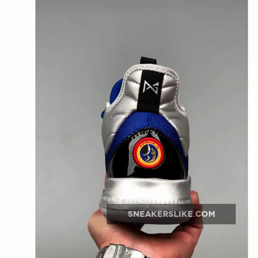 This space-inspired version of the PG 3 features a Royal Blue mesh and patent leather upper paired with Metallic Silver detailing, Orange and Red accents on the lower lace cage with NASA patches on the heel tabs.