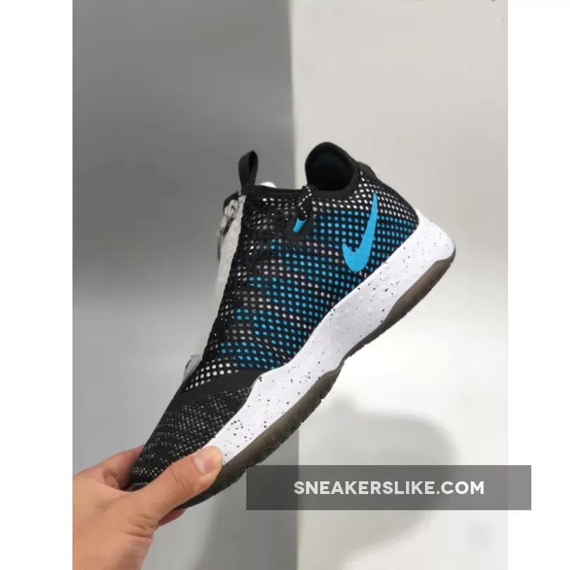 Dressed in a combination of Black, Grey, Blue, and White colors. This PG 4 features a knitted heathered upper with White Swooshes on the sides outlined in Blue.