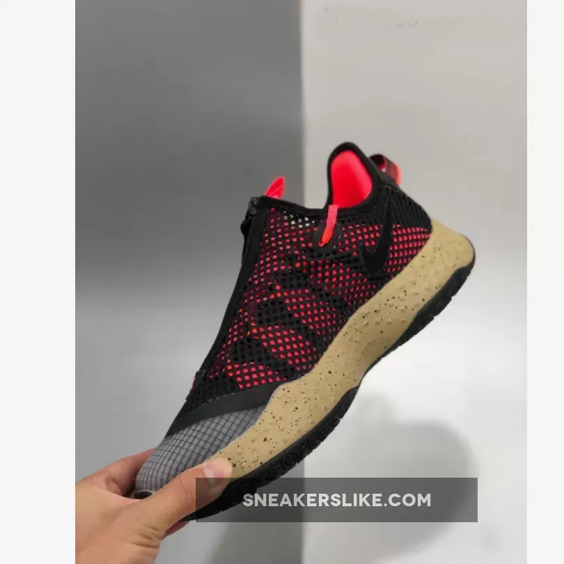 This offering of the Nike PG 4 features a transparent upper with Black netting overlays detailed with Red contrasting accents throughout.