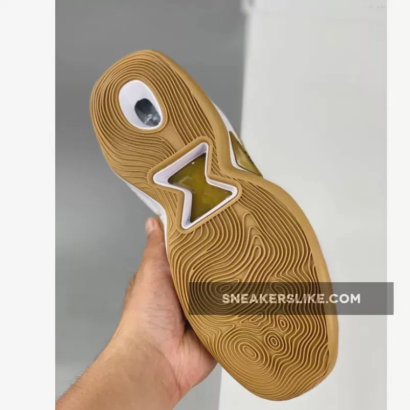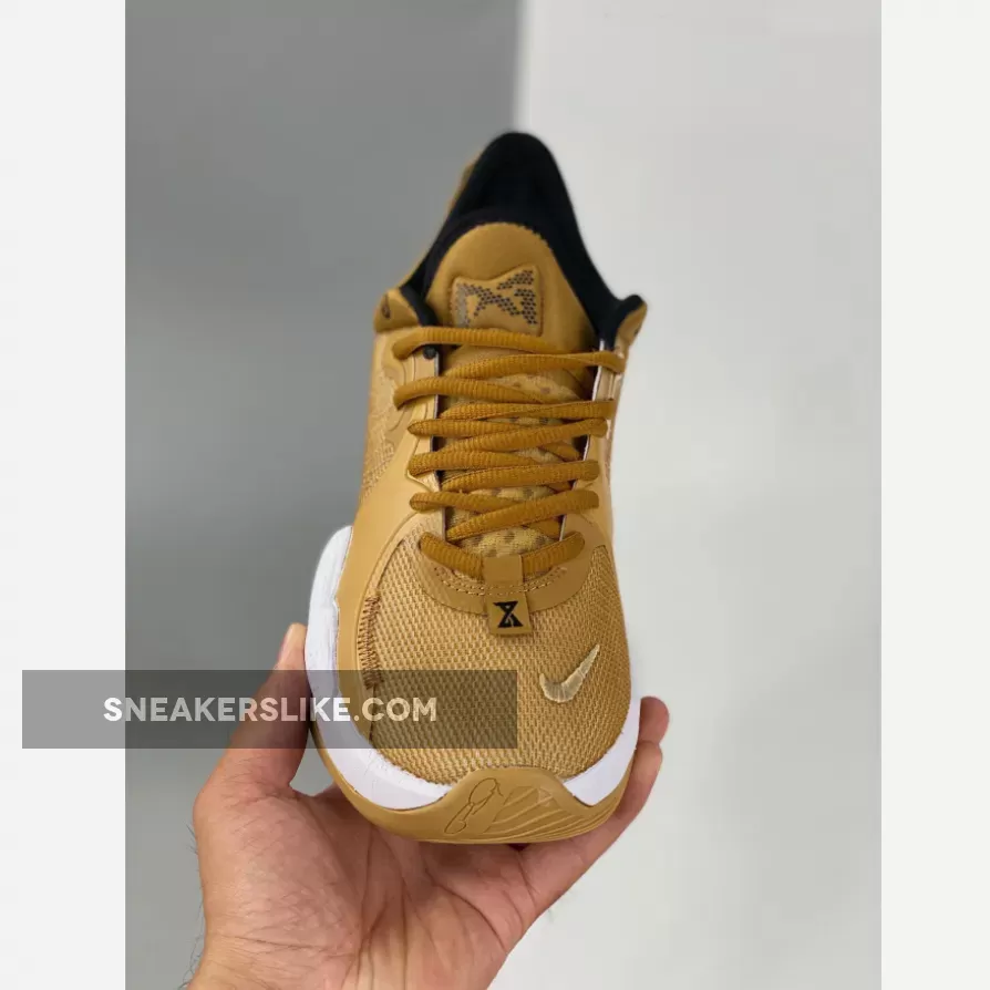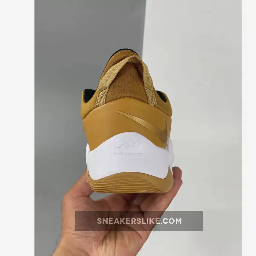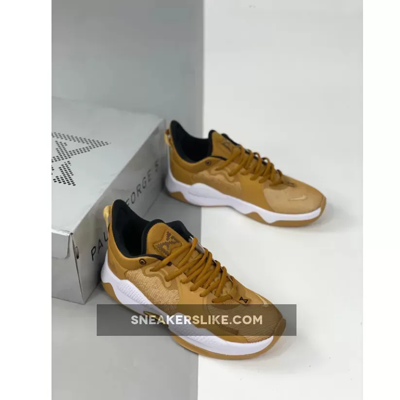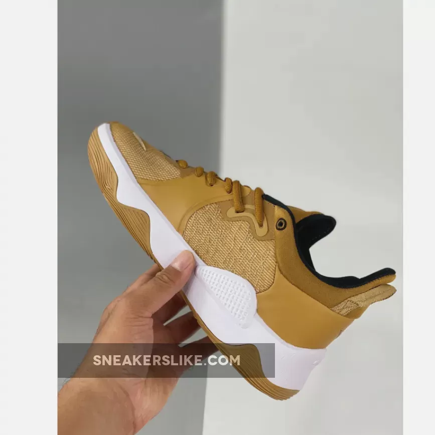 This offering of the Nike PG 5 features a Wheat-like upper with Gold branding throughout constructed in a mix of materials with exposed stitching at the forefoot.
