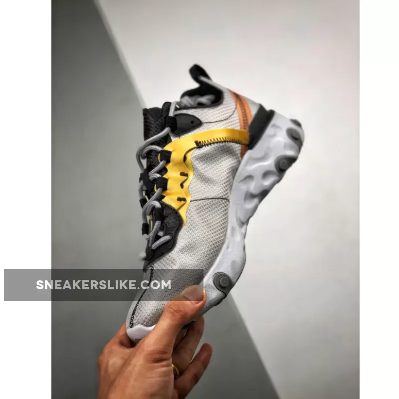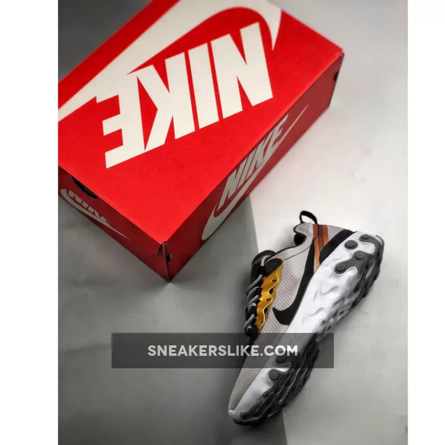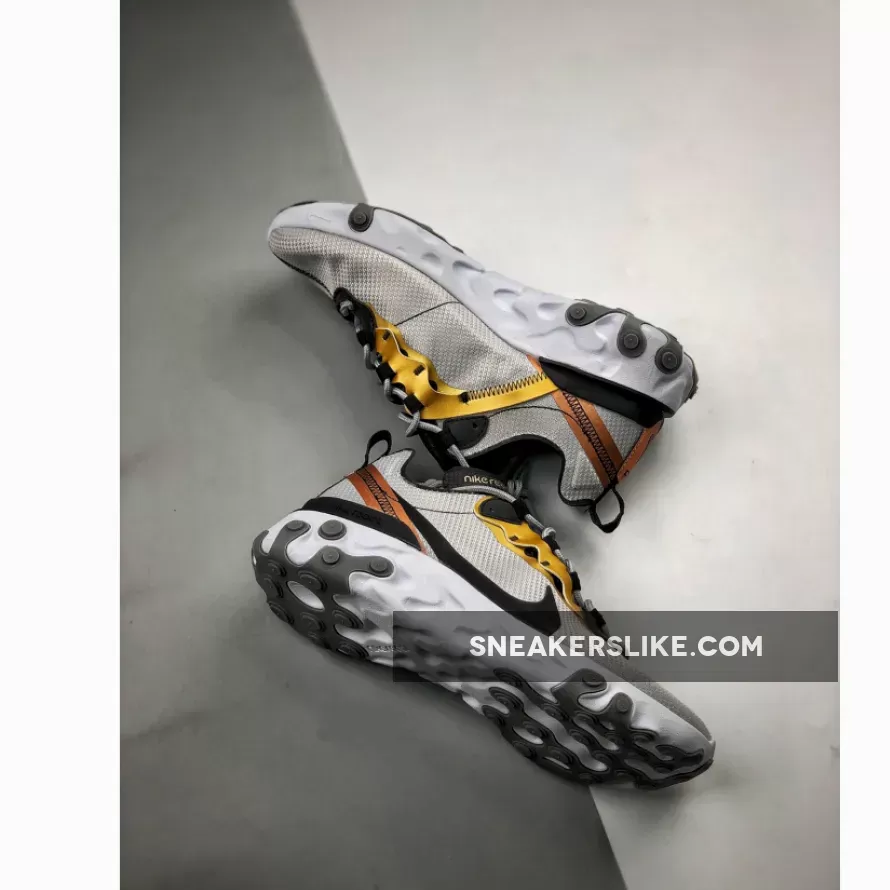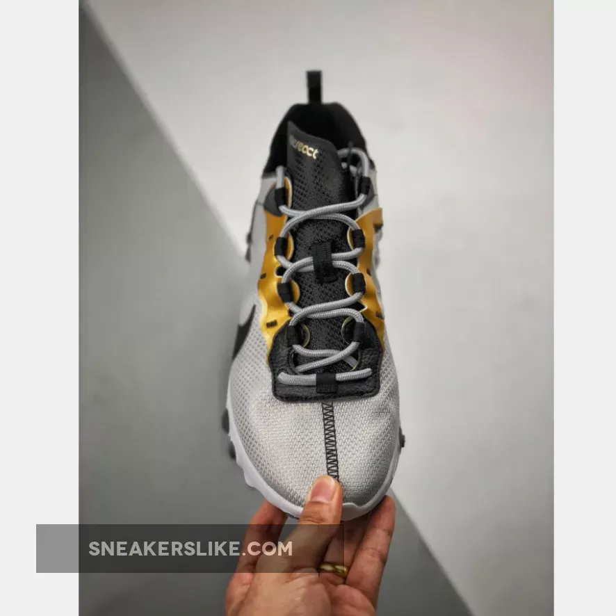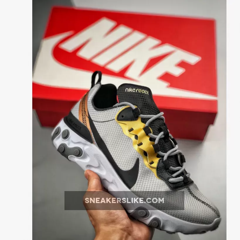 This luxurious-styled Nike React Element 55 features a Light Grey mesh upper with Black detailing throughout. Highlighting the shoe are Metallic Gold accents on the eyelets, while having Bronze on the heel.