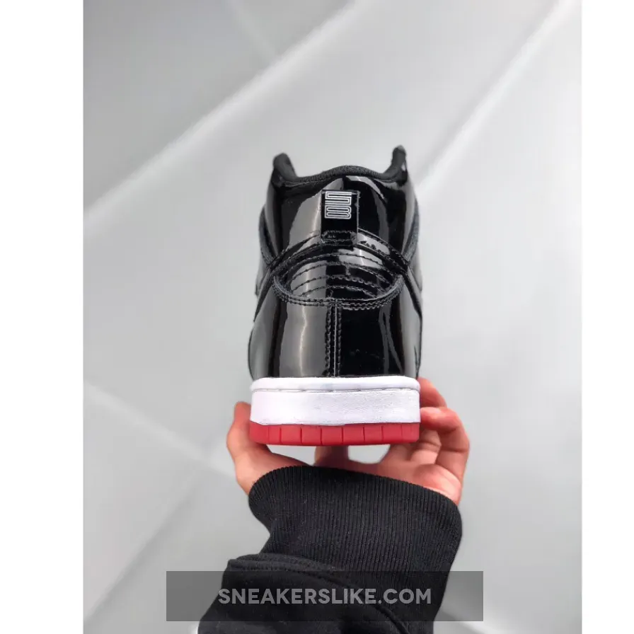 Dressed in a Black, White and Varsity Red color scheme. This Nike SB Dunk High features a Black ballistic mesh upper with matching patent leather overlays.