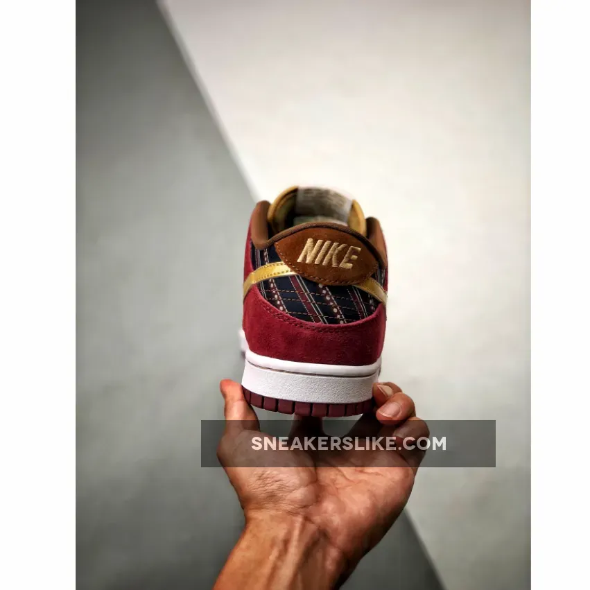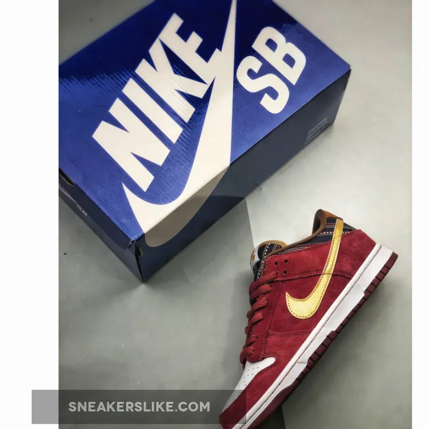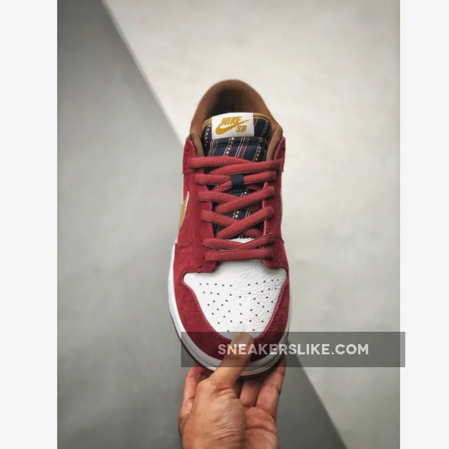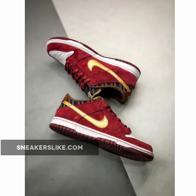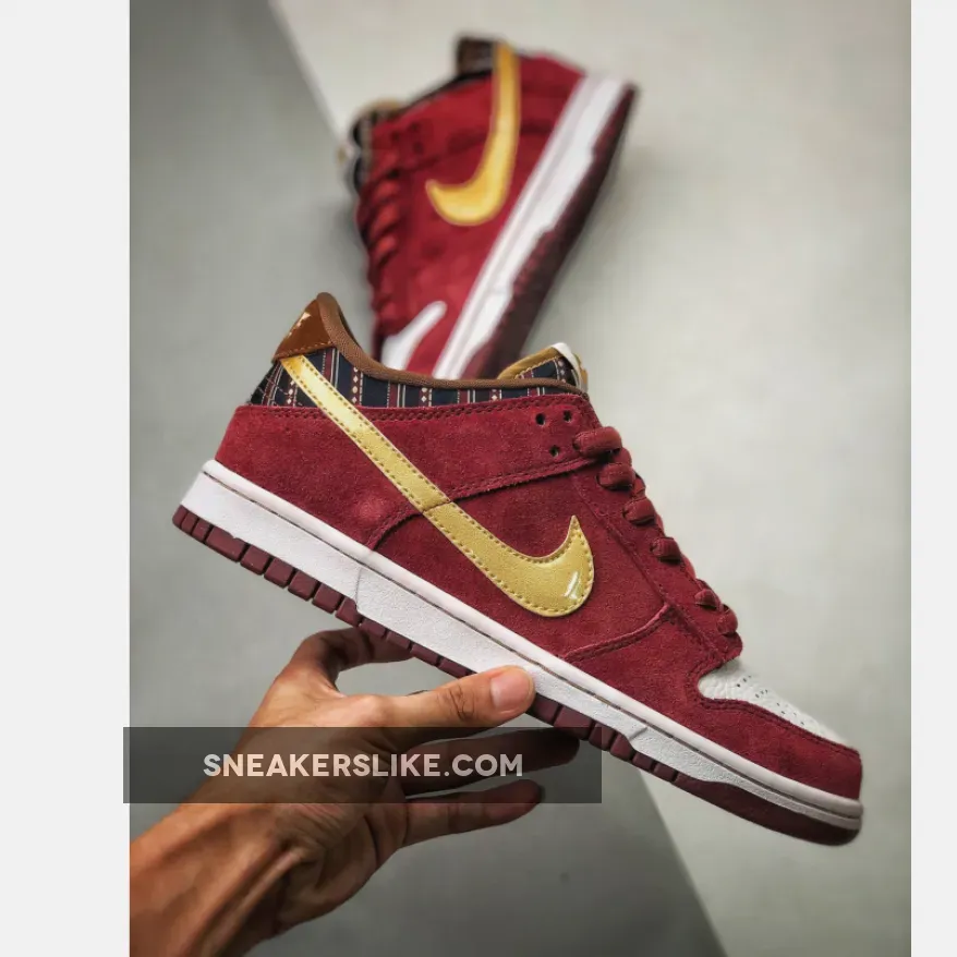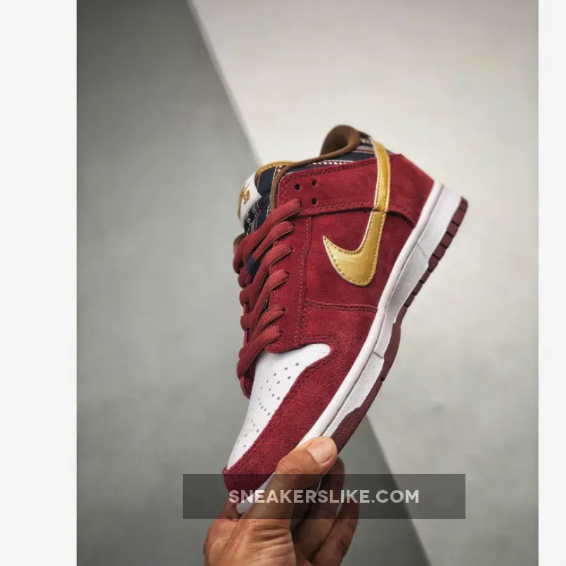 Dressed in a Team Red and Metallic Gold color scheme. This Nike SB Dunk Low features a Red suede upper that nods to Burgundy’s name and his signature newsman anchor suite.