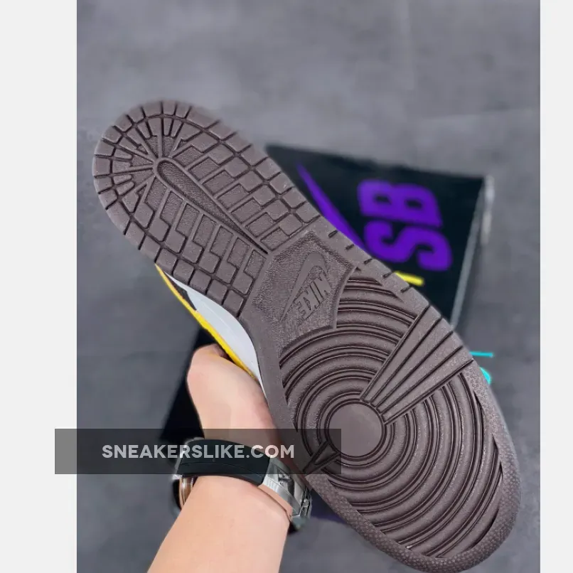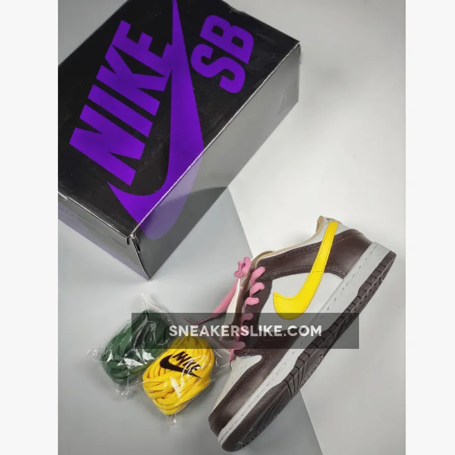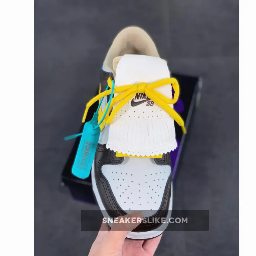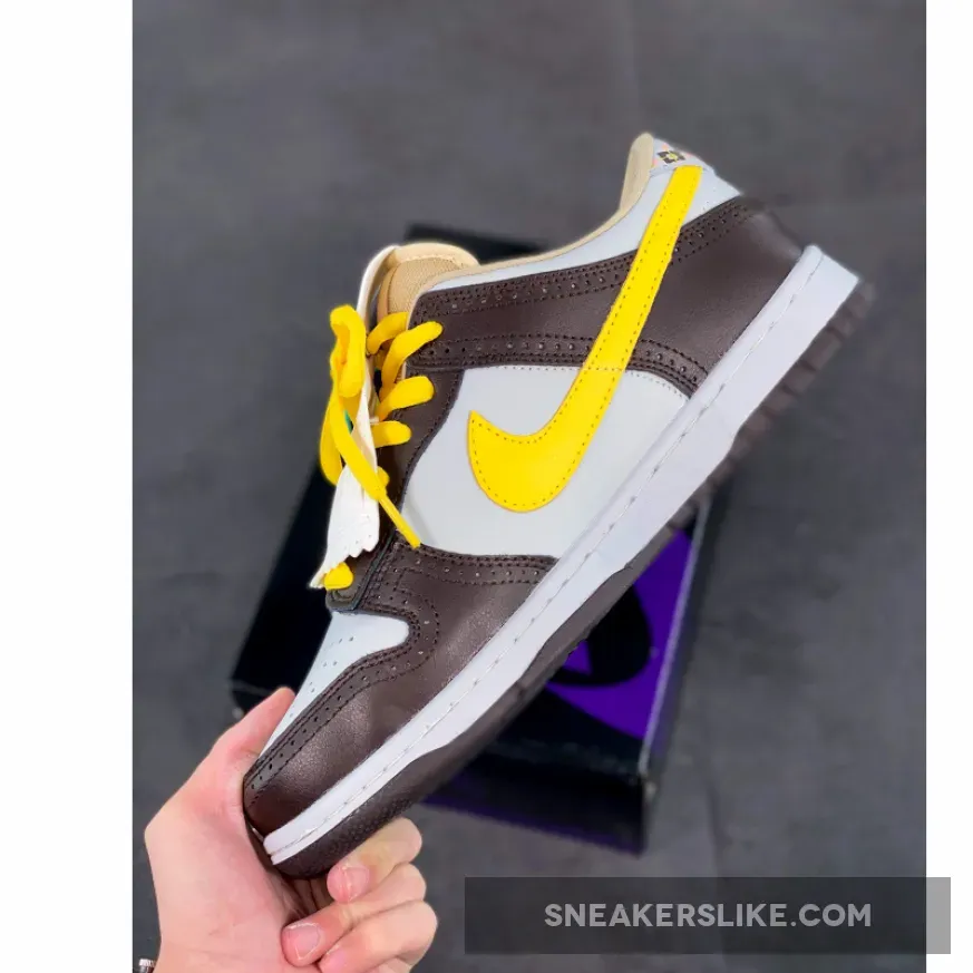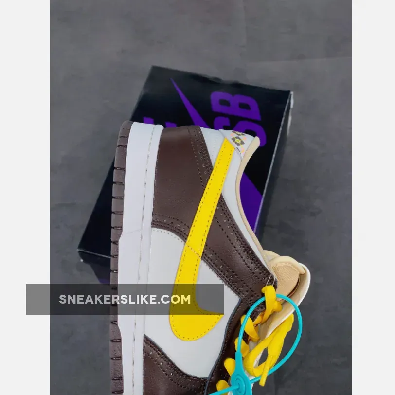The Nike Dunk Low SB Premium Brown Golf – net / maize is one of two golf inspired Dunks, the other being the Blue Golf. It strongly resembles a golf shoe, with all the standard holes that golf shoes feature, and even has an optional flap. The shoe is constructed from premium leather, and like the blue version, there were 2 version of Brown Golf released with different countries of origin. One was made In China and the other in Indonesia. Their box tag color and inside tag varied too, but both are legit.