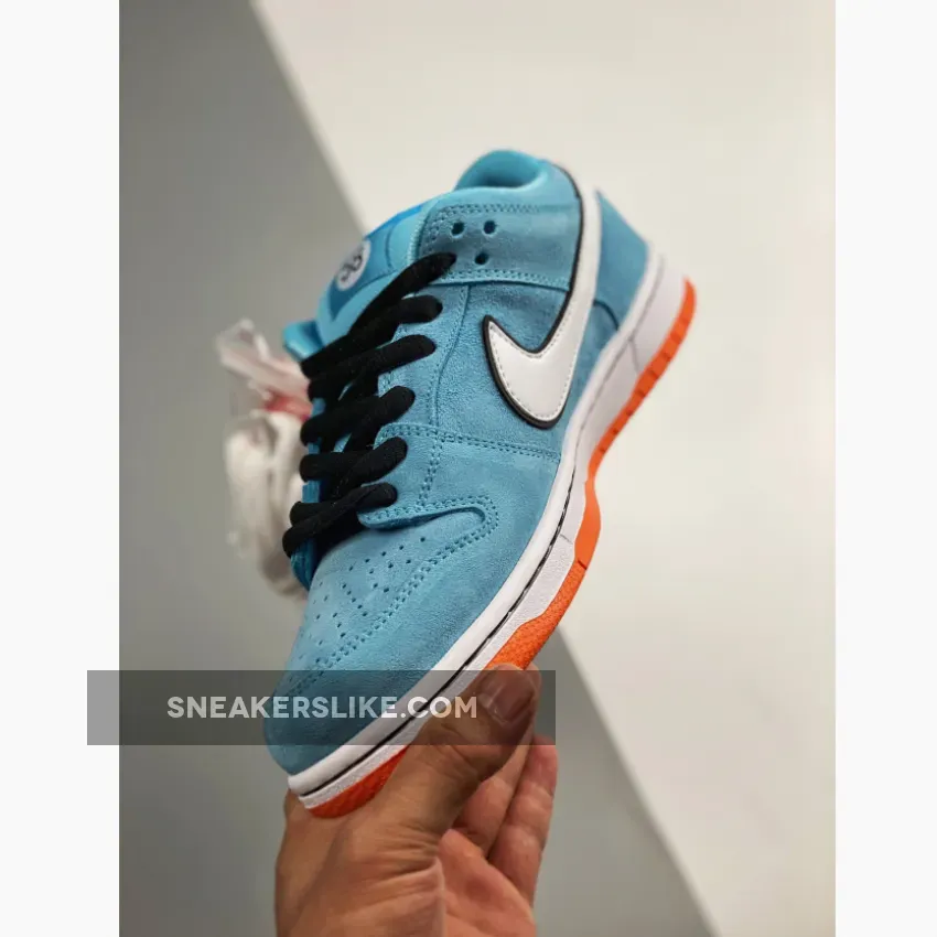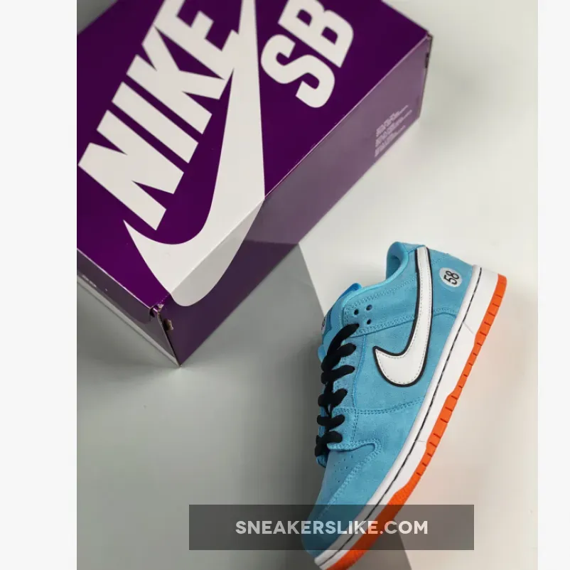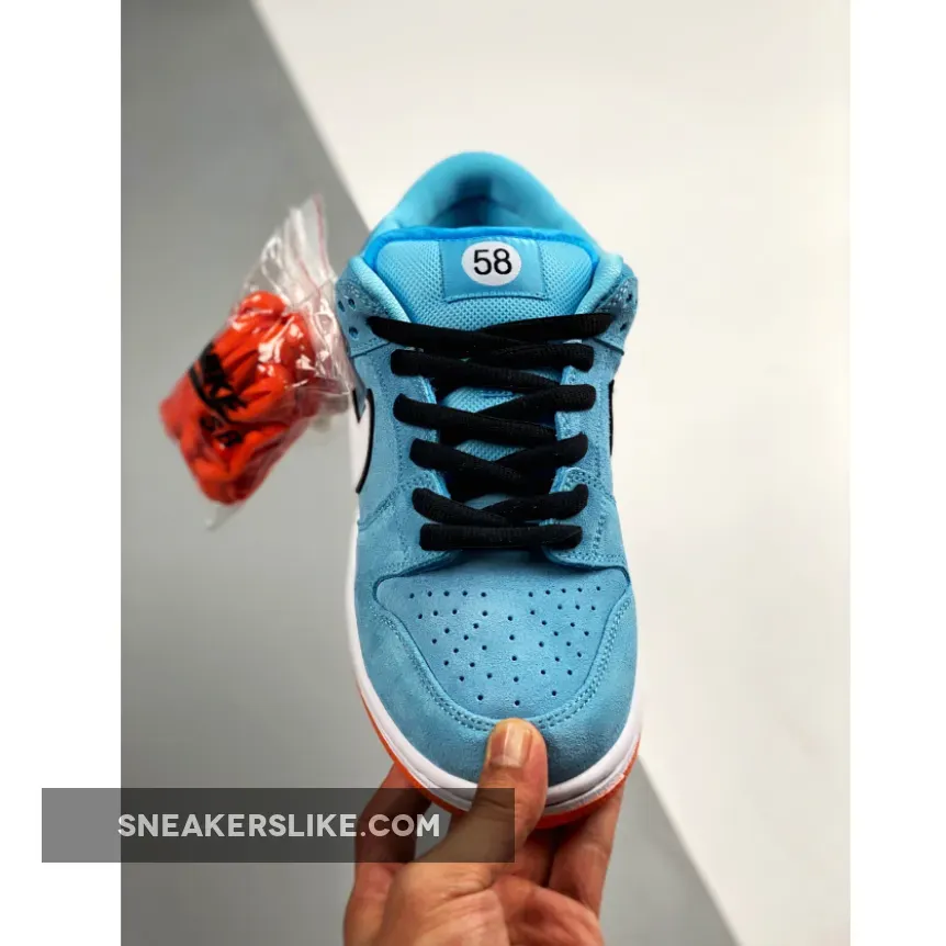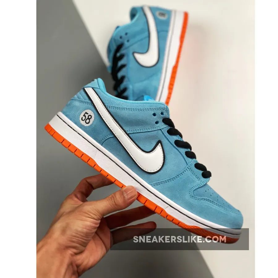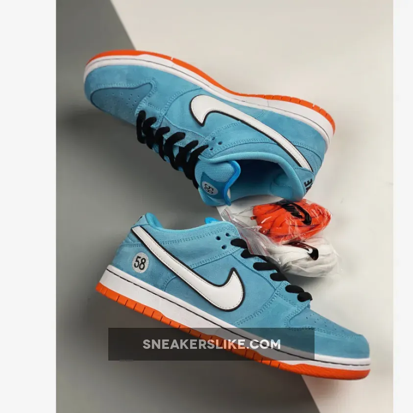This light blue Nike SB Dunk Low Club 58 Gulf adds to the Dunk SB range of race car-inspired sneakers. The Nike SB Dunk Low Club 58 Gulf features a Blue Chill suede upper, with black laces and a white leather Swoosh contrasting the silhouette. A patch with the number 58 is embroidered near the heel, and the same digits are repeated on the woven tag affixed to the stuffed mesh tongue. The design is finished with a two-tone sole: white with an orange outsole.