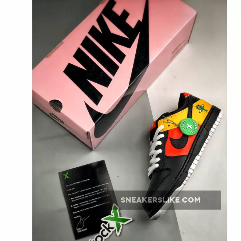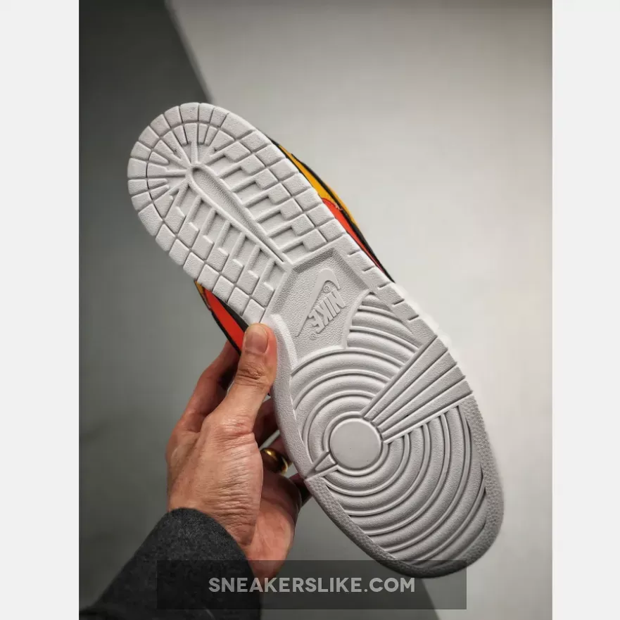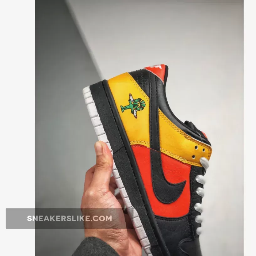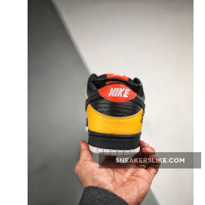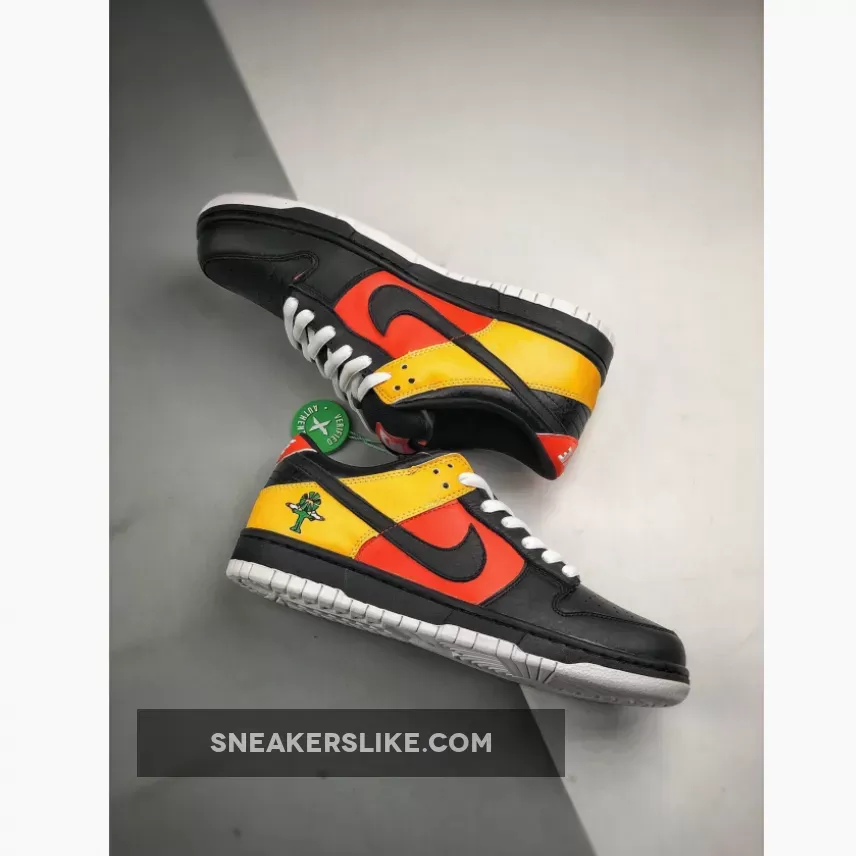 Definitely an interesting shoe, the Home Rayguns were designed by famed shoe customizer Methamphibian. He took inspiration from Nike’s made-up ABA team, the Roswell Rayguns, and actually painted this design on a pair of Air Force 1s. The design soon made its way to the Nike Dunk SB. This team, led by the fly Dr. Funk, who was portrayed by Vince Carter, was the center of a number of Nike ads during the 2002 NBA Playoffs. Jermaine O’Neal, Paul Pierce, Baron Davis and Jerry Stackhouse were also part of this fictional team. Not following traditional team colorways, this black-based sneaker is actually the home sneaker, rather than it being a usual white or lighter color. On the yellow heel is the Raygun logo, while the side panel is orange and the toe is black. The shoe is finished with a contrasting white outsole.