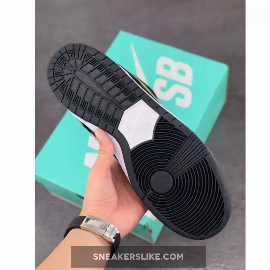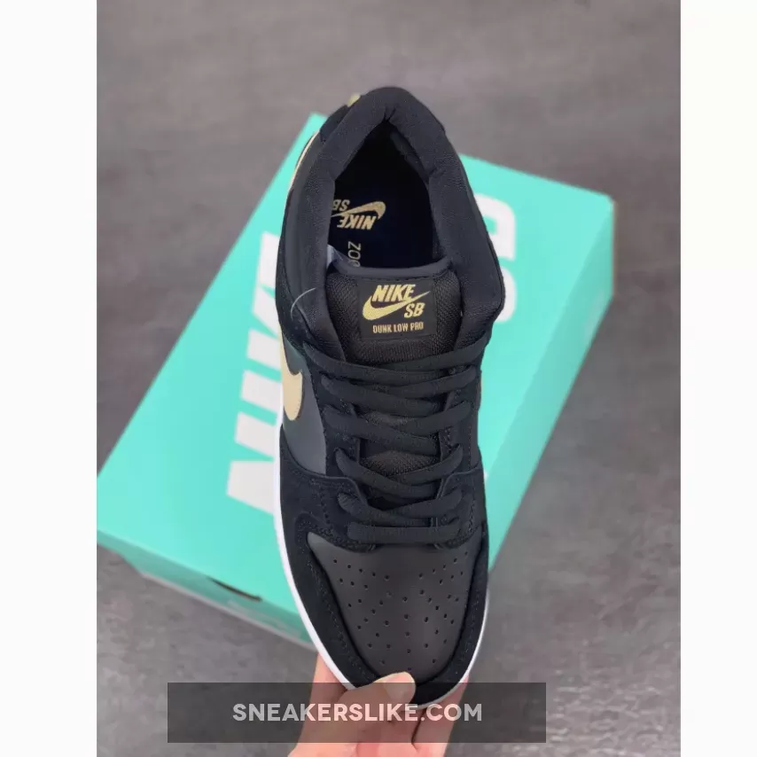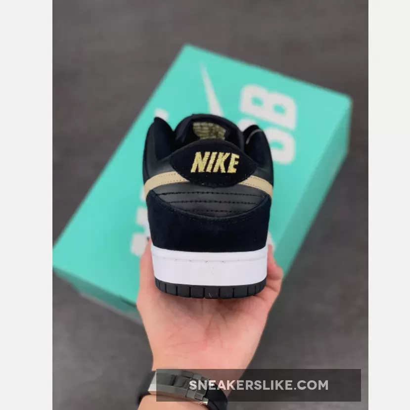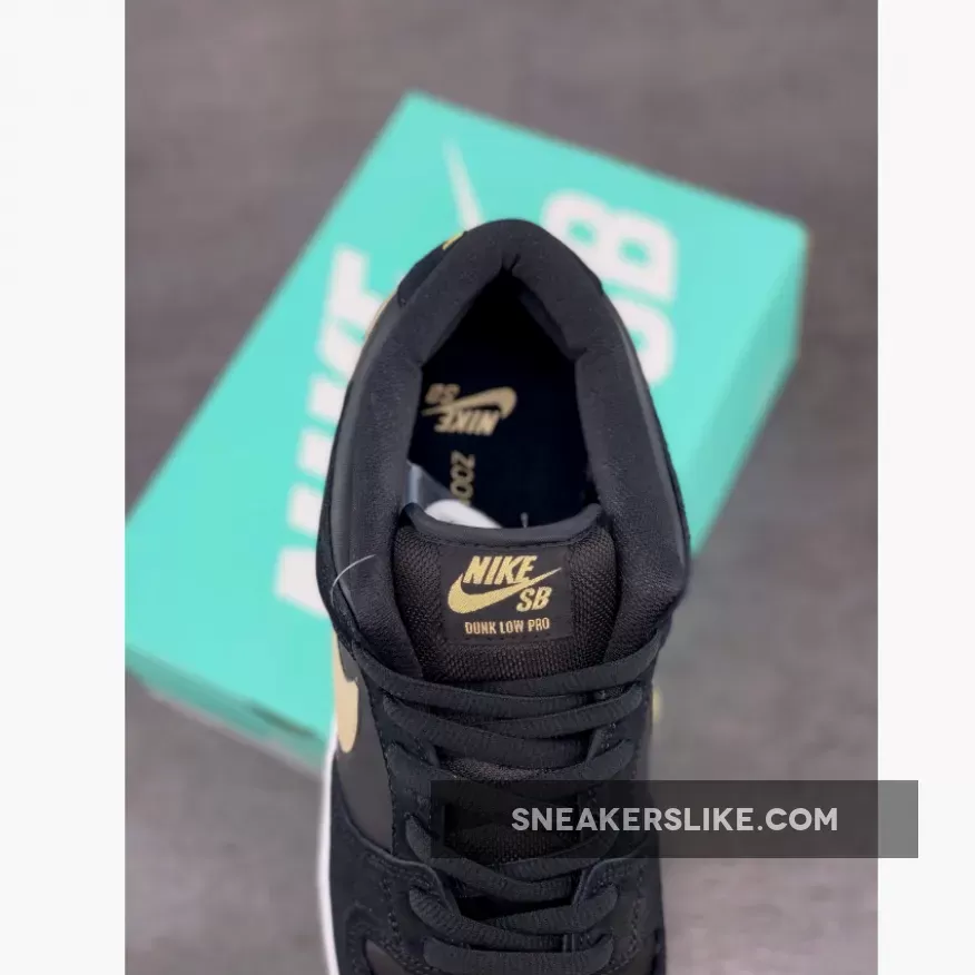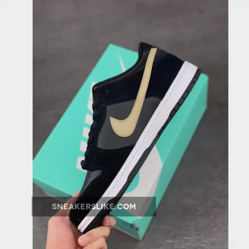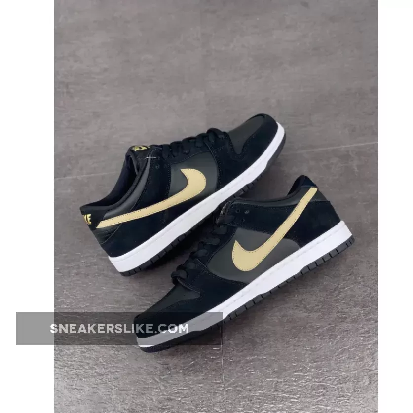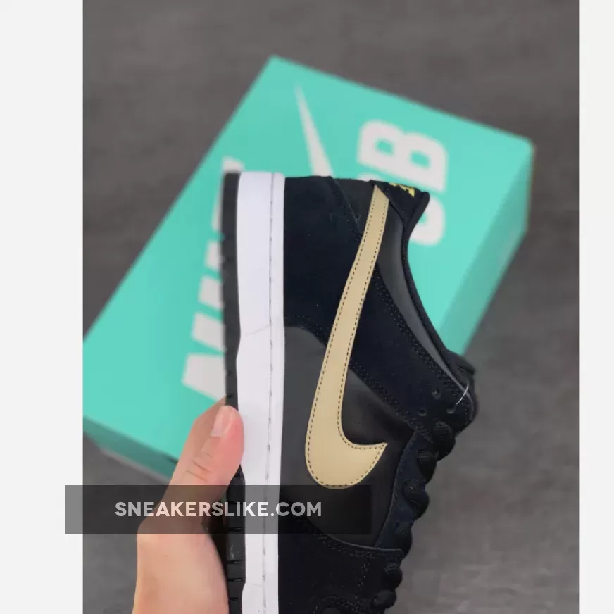 Dressed in a Black, Metallic Gold, and White color scheme. This Nike SB Dunk Low features a Black leather underlay with matching nubuck on its overlay.