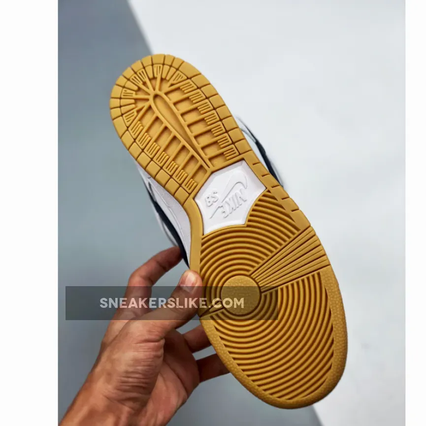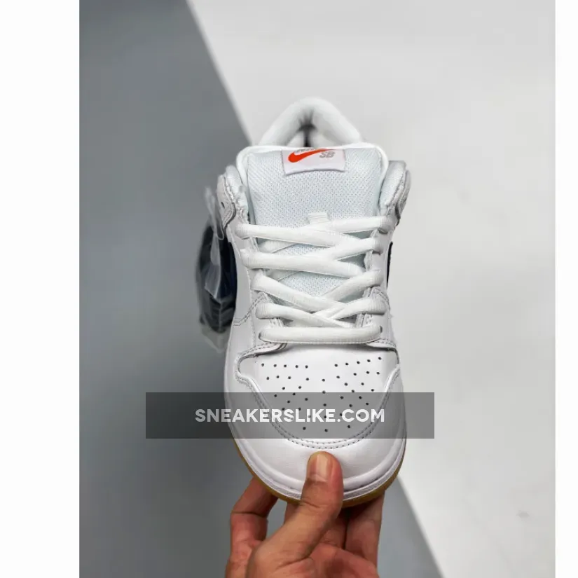 This Nike SB Dunk Low features a White leather upper paired with Black detailing on the tongues, heels and Swoosh logos.