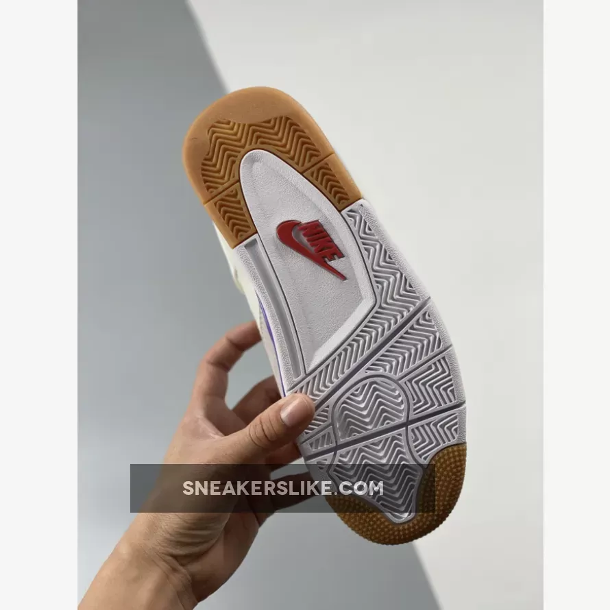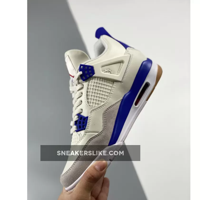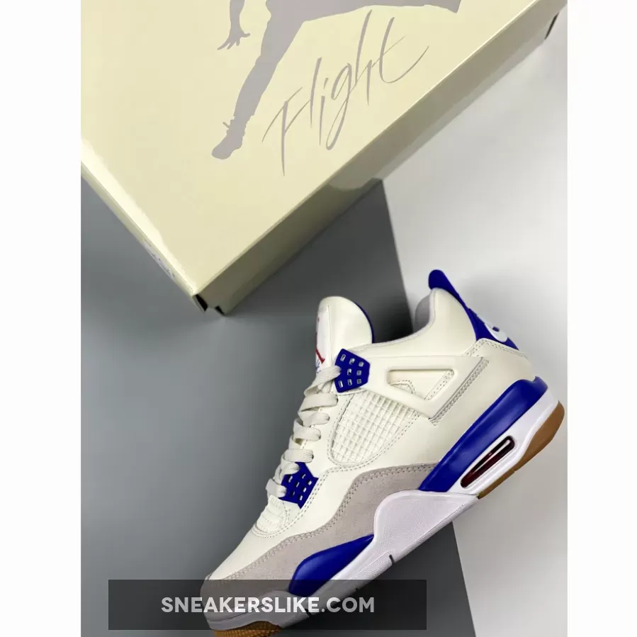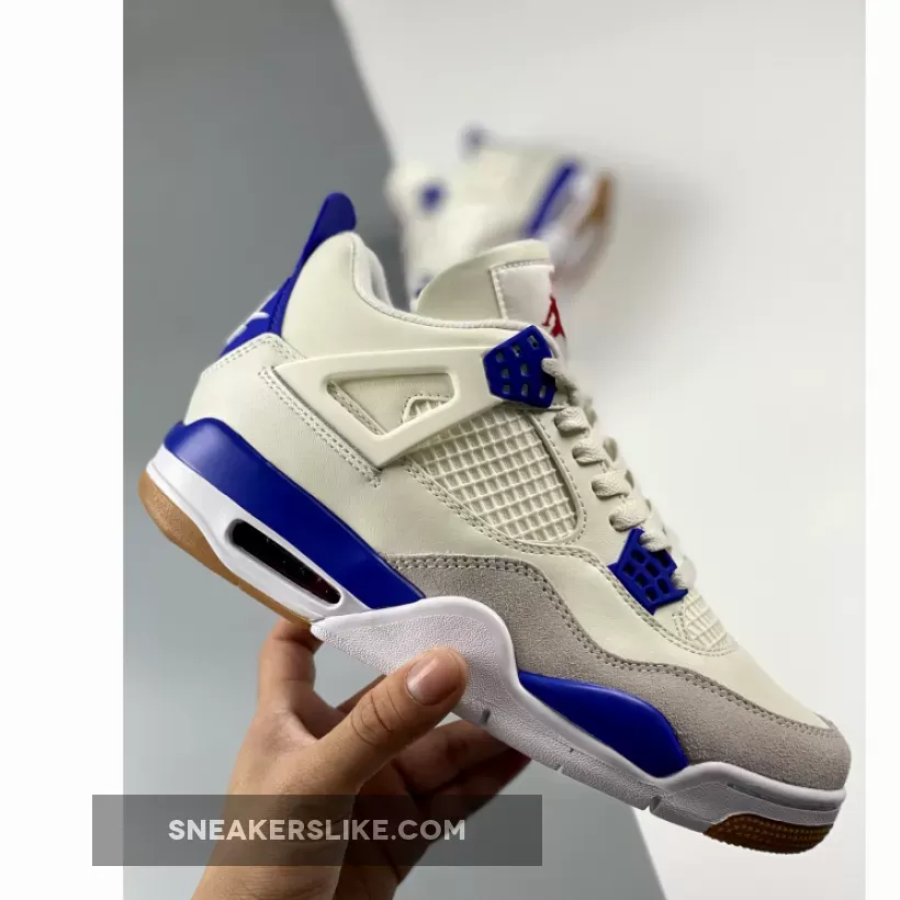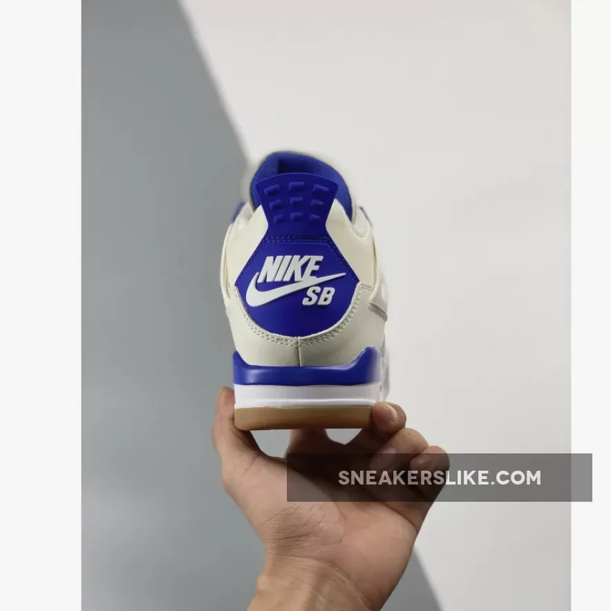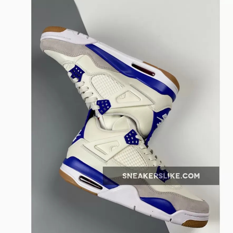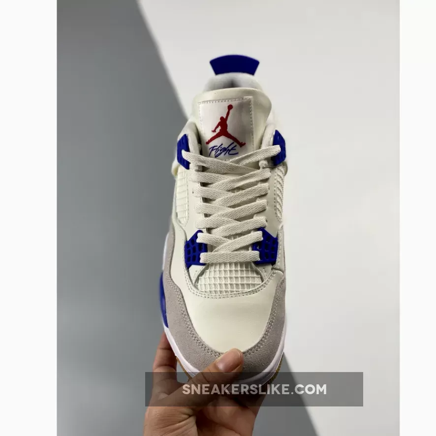 the Nike SB x Air Jordan 4 “Blue/White” is believed to feature premium white leather uppers accented by suede midsoles. Firstly, we get some nice grey suede on the overlays. Secondly, the rest of the upper is covered in white leather. Additionally, there is a lot of blue on the midsole and the back heel. Finally, Co-branding elements come in the form of Jumpman tongue tags, “NIKE SB” at the rear, and printed insoles.