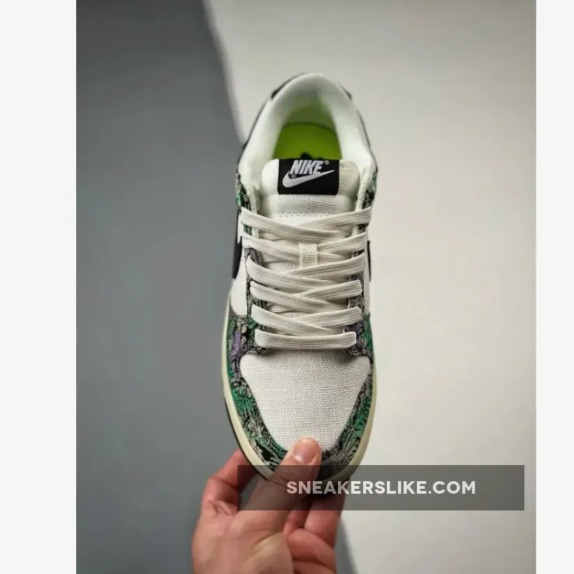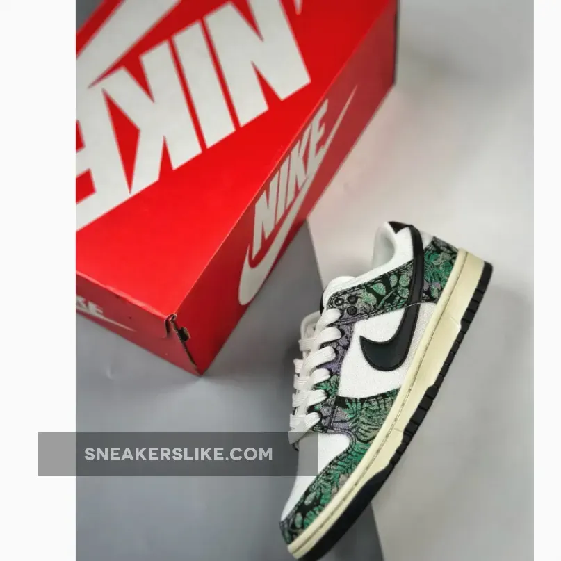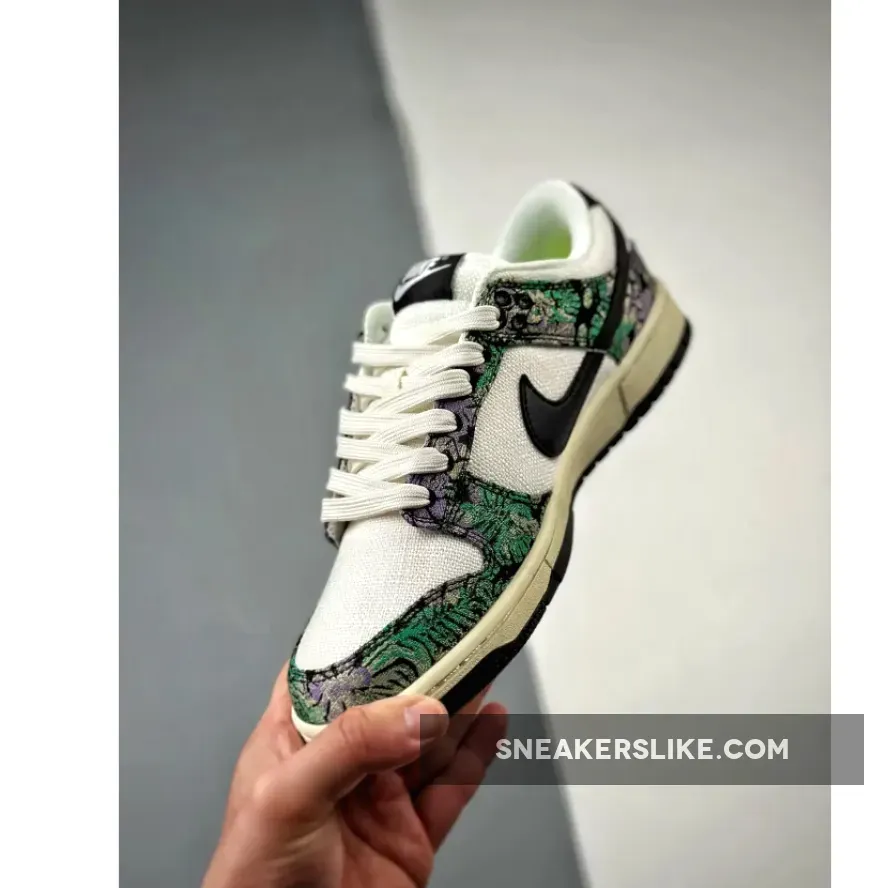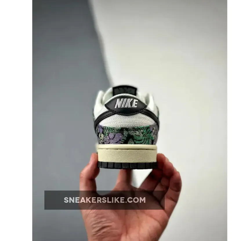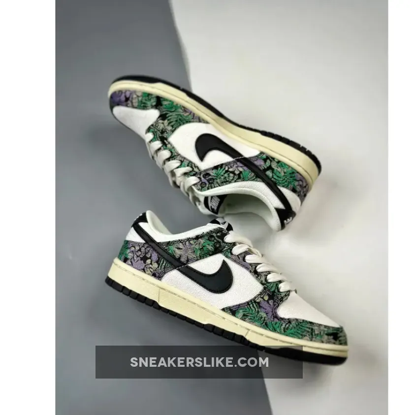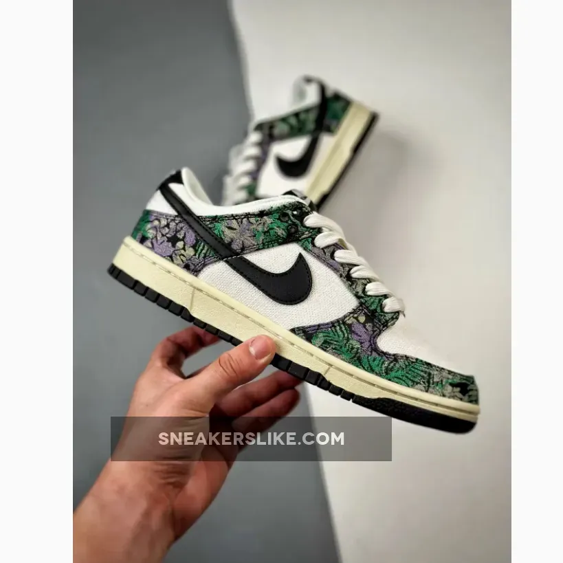 Floral graphic prints are still popular according to this new Nike Dunk colourway. Dare to try on this fresh eye-catching Nike Dunk Low Next Nature “Floral Tapestry” colour scheme.The 38-year-old Nike Dunk regained its glory in 2020 due to several hyped collaborations with various brands and designers. The Nike Dunk Low further gained popularity because of the iconic Panda colourway. The Next Nature edition consists of sustainable content as part of the Move to Zero campaign. This colourway brings back floral aesthetics to the Nike Dunk and features a sail white canvas base with black leather Swoosh logos. Black canvas overlays come covered with embroidered purple and green floral graphics. Next Nature Pinwheel branding appears on the volt sockliner.