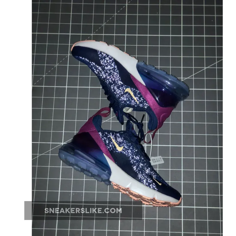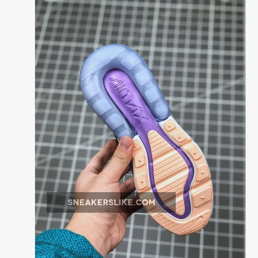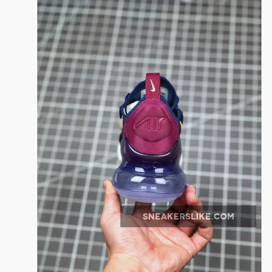 Looking closer, this Nike Air Max 270 comes highlighted with Navy Blue across the upper while Burgundy lands on the heel wrap. In addition we have Light Peach detailing on the Nike Swoosh and heel tab while Purple lands on the 270 logos.