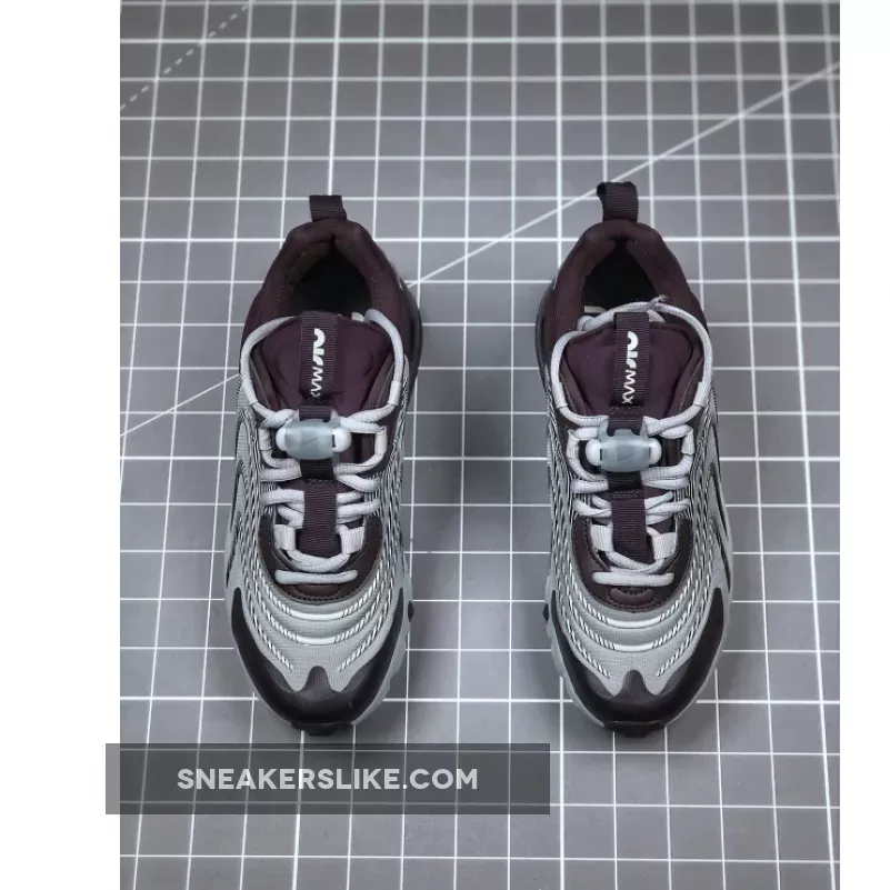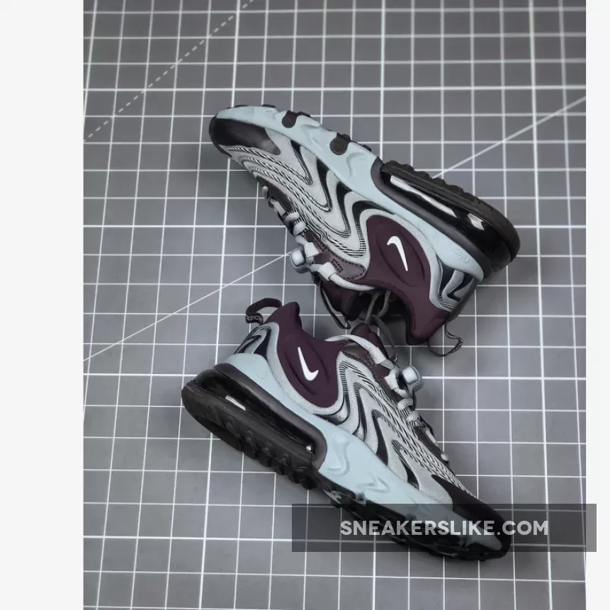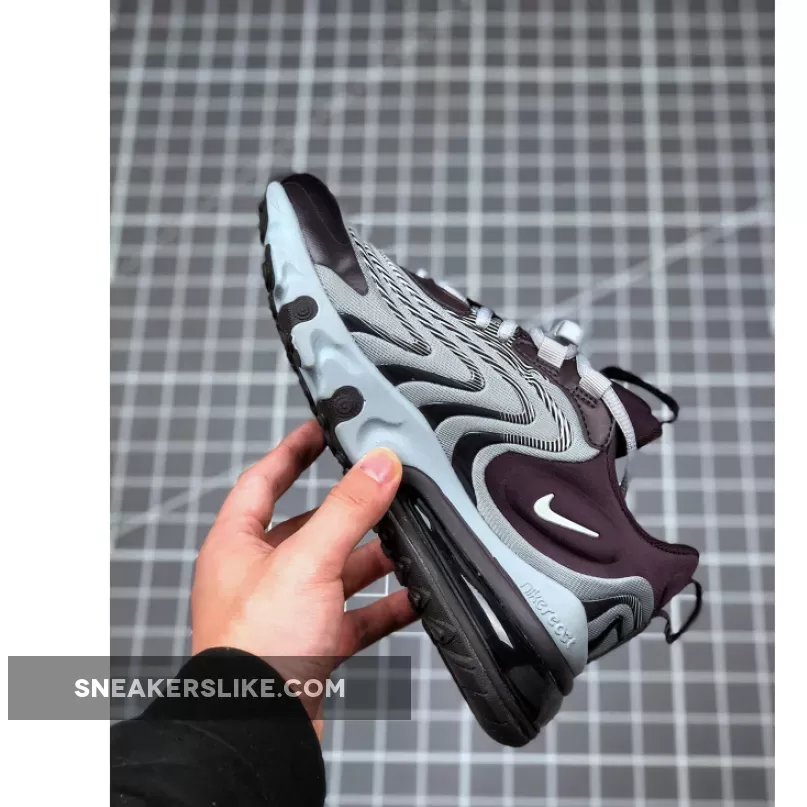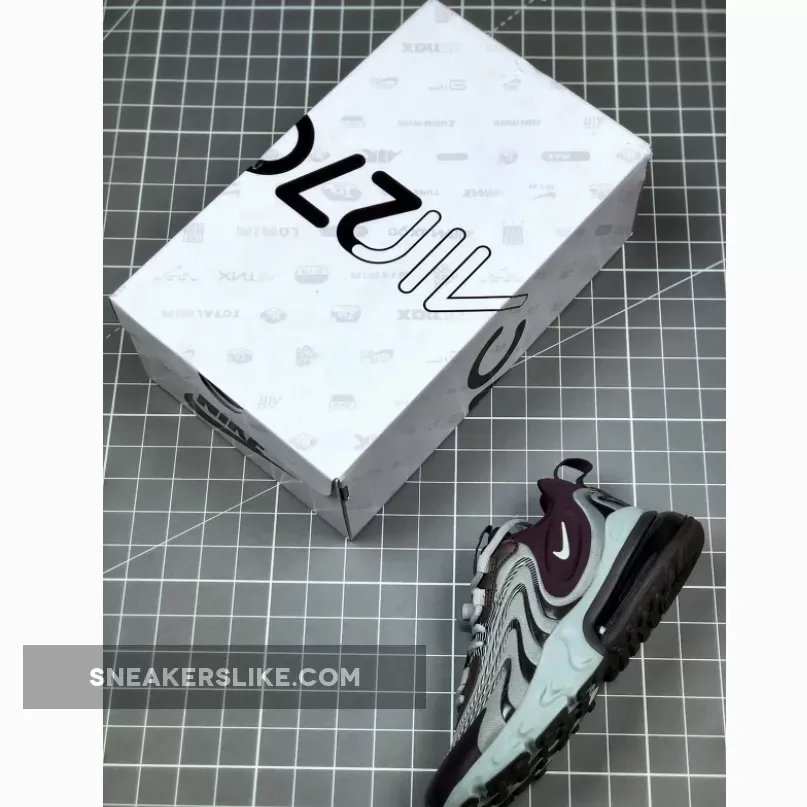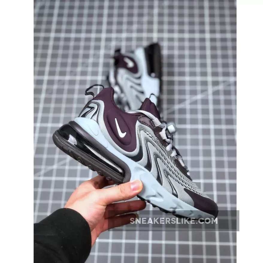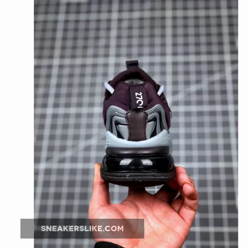 This edition of the Nike Air Max 270 React sports a Deep Burgundy and Ash Grey upper boasting a no-sew textile build with a low-cut design around the ankle.