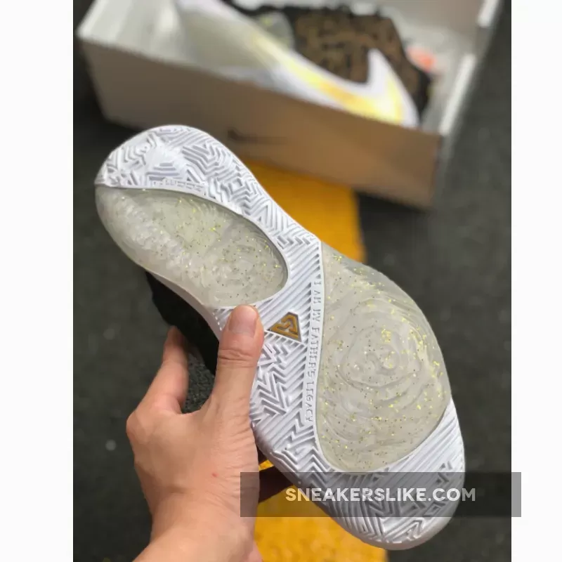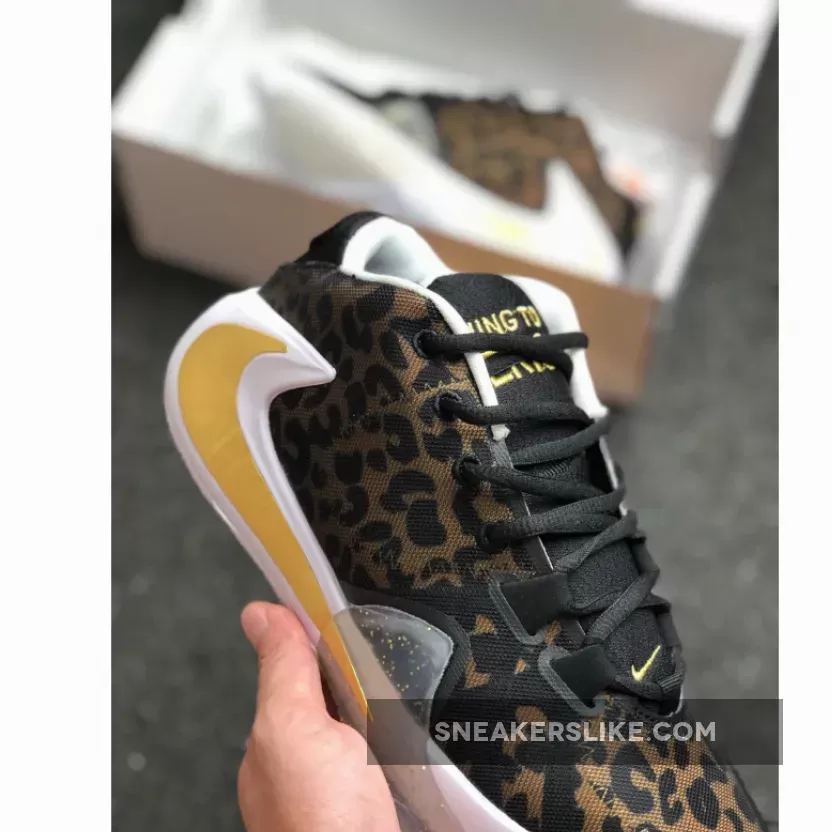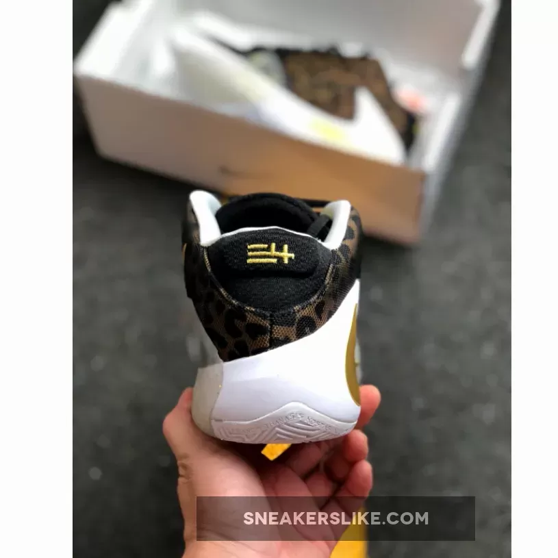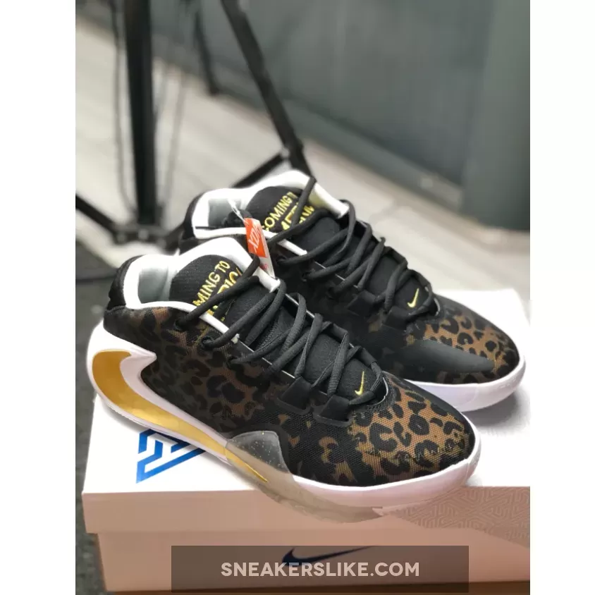 Detailed with “Coming to America” written in Gold lettering on the furry Black tongue, the shoe is also covered in leopard print as a nod to the shawl worn by Eddie Murphy’s character, Prince Akeem. Finishing off the collaboration is a Metallic Gold box with Red branding, special card that displays a photo of Giannis dressed like the Akeem, and Pink flower petals that nods back to the movie when the petals are thrown at the feet of King Jaffe.