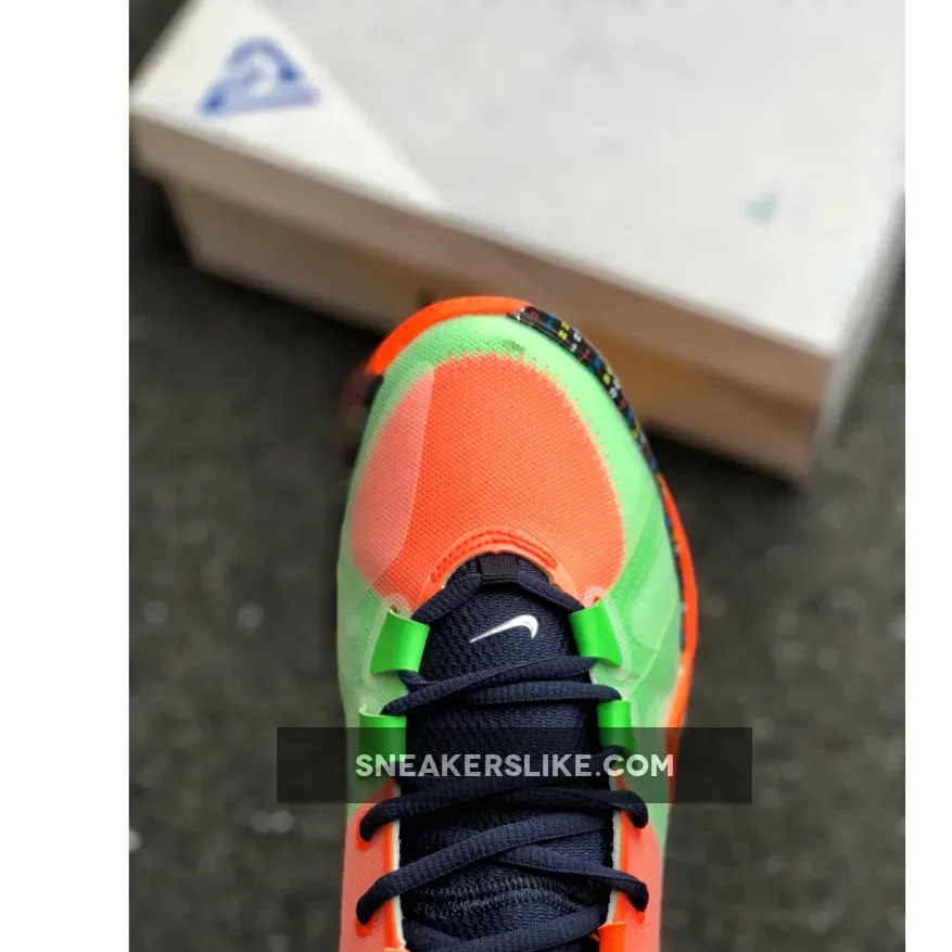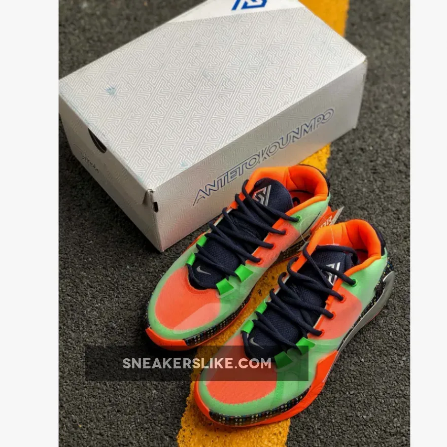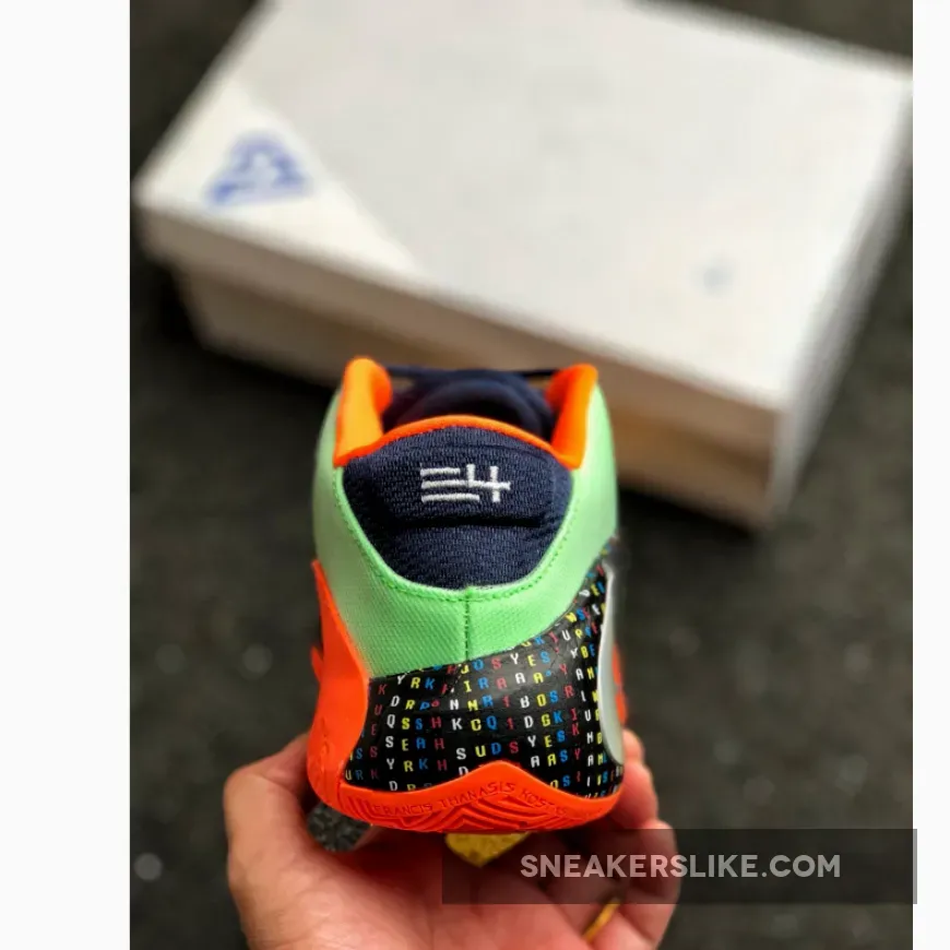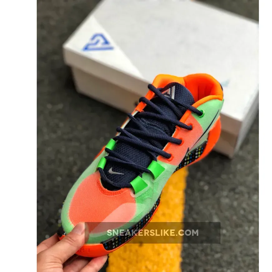 This iteration of the Nike Zoom Freak 1 features a clear translucent upper with a mix of Green and Orange on its base. A Navy tone covers the tongues, laces, and heel highlighted with iridescent detailing on the Giannis Antetokounmpo’s “GA” logo and oversized reverse Swoosh logo.