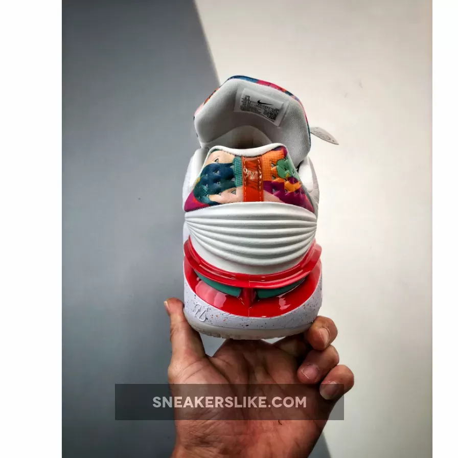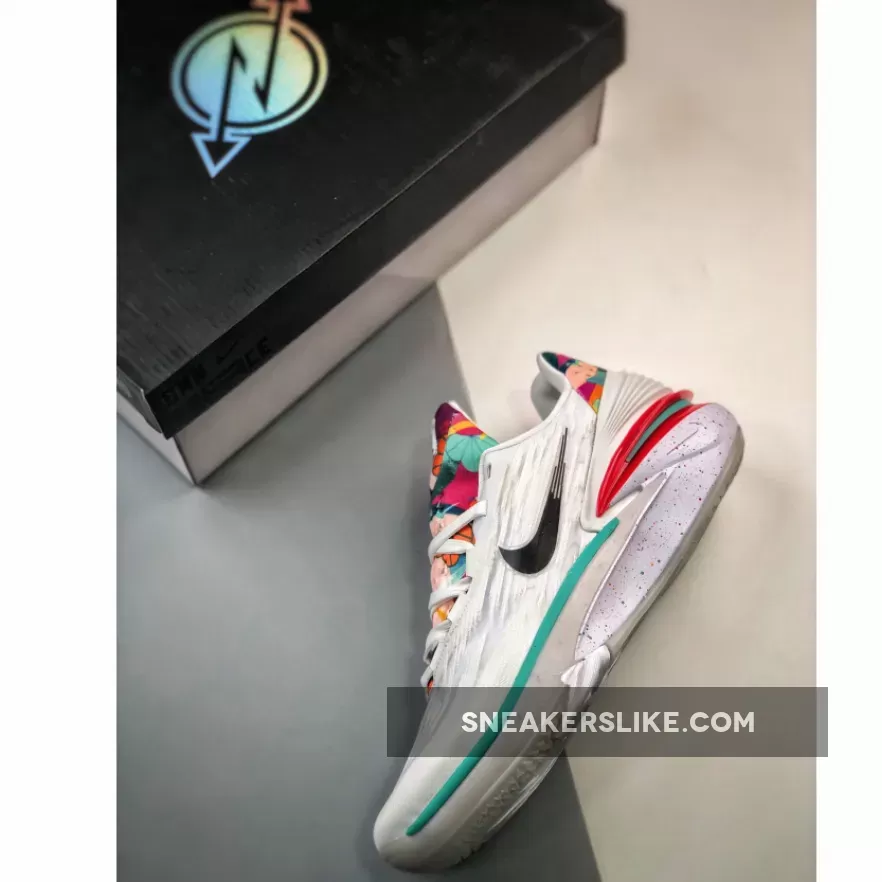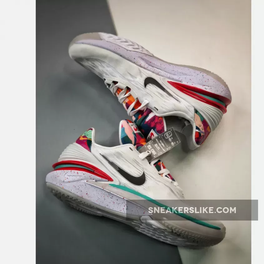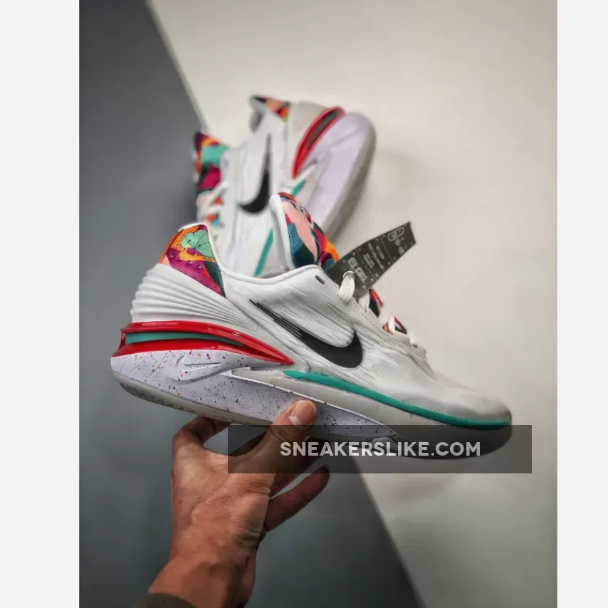 Code named “Leap High” for its typography on the informational factory-like tongue tab, a crisp white base layer illuminates the overall composition, allowing for its inclusion of disparate and titular hues to reign supreme. Extending a thin strip of teal at its forefoot, the lower section of the molded heel counter encourages a bright red trim surrounding the latter’s tucked away inclusion. Coordinating the hues of the pair into a speckled arrangement along the midsole, a jet-black Swoosh interjects at the midfoot before an abstract amalgamation of basketball motifs and vivid colors fill the tongue construction and perforated heel tab.