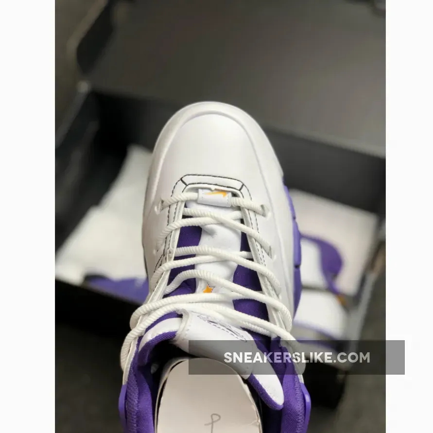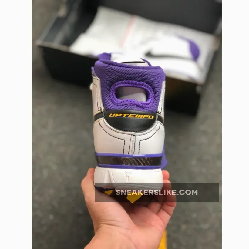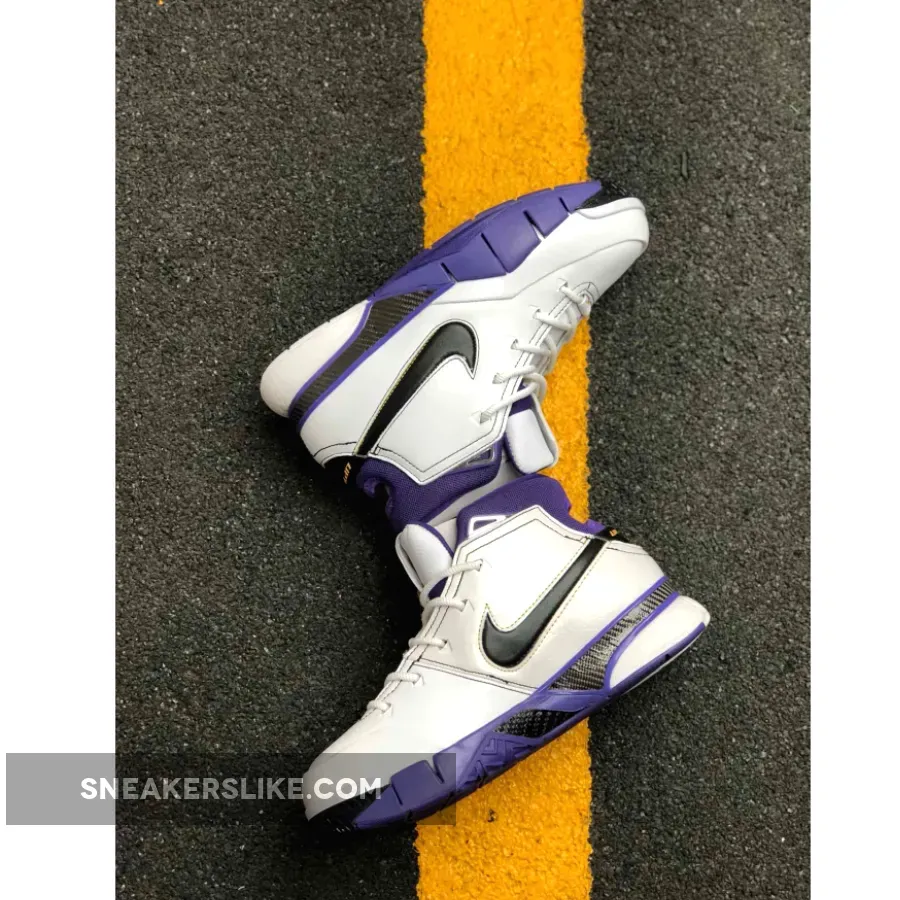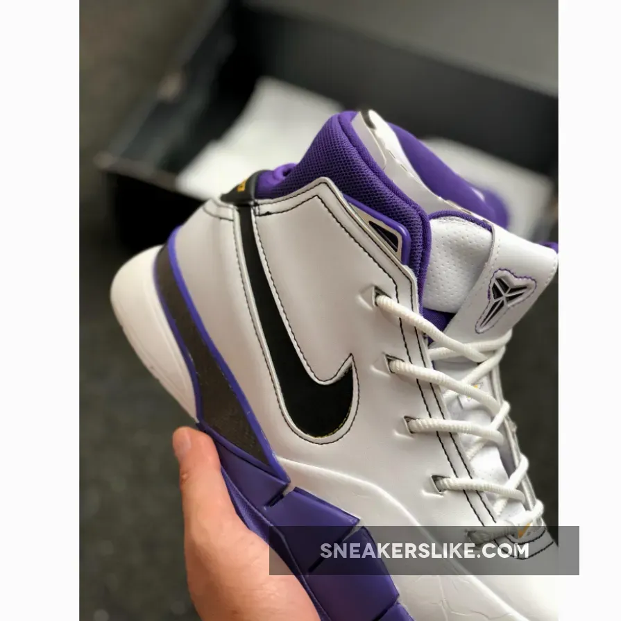 Dressed in a White, Black, and Court Purple color scheme. This Nike Kobe 1 Protro features a White leather upper with Black Swoosh branding on the lateral and medial sides accented in Purple on the ankle collar and midsole.