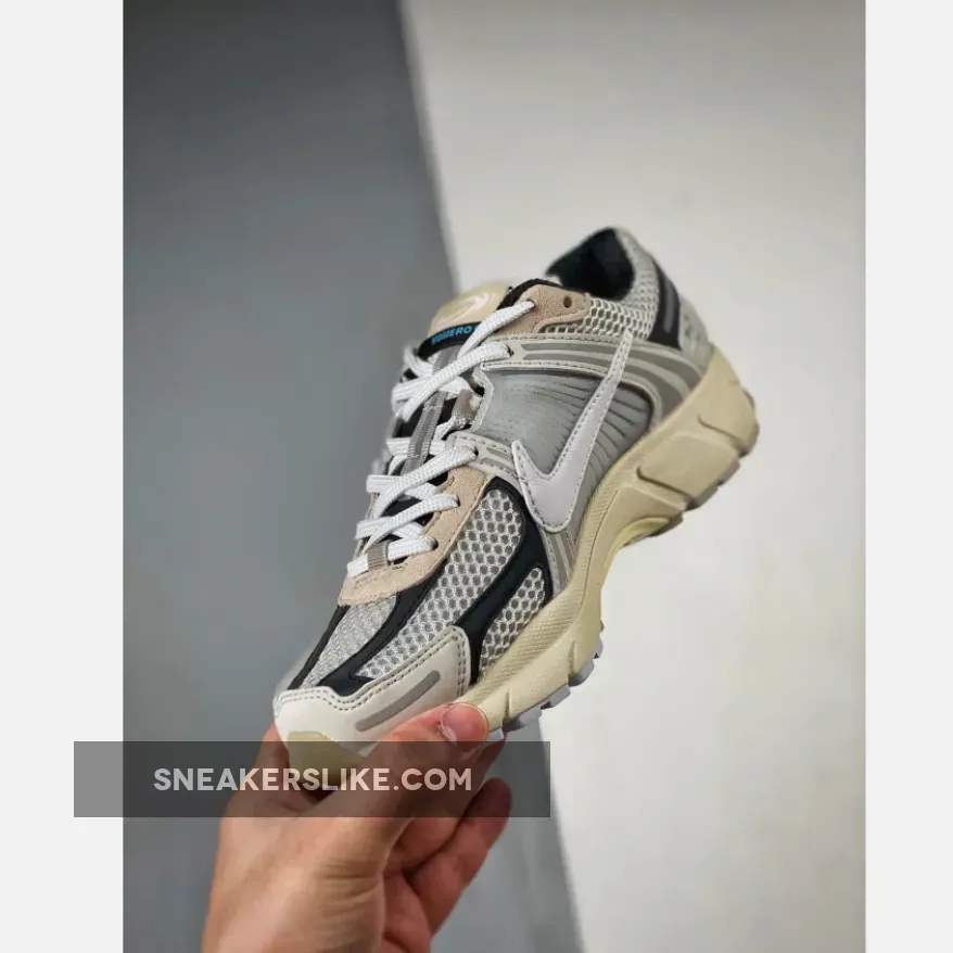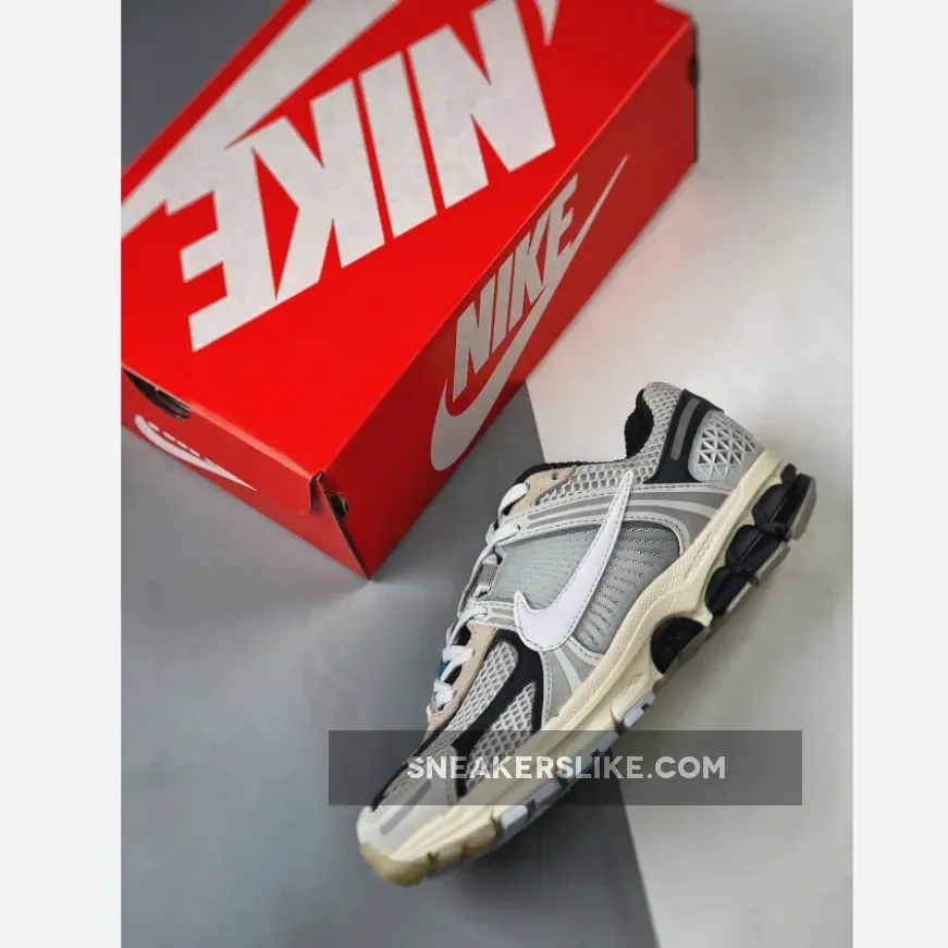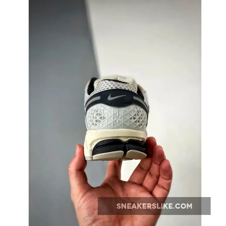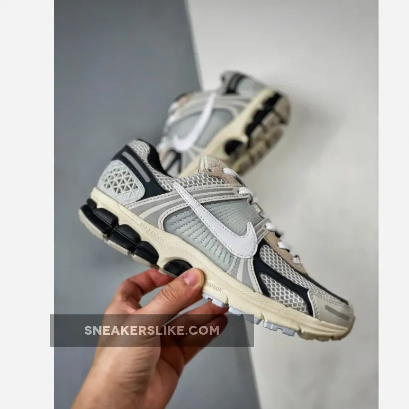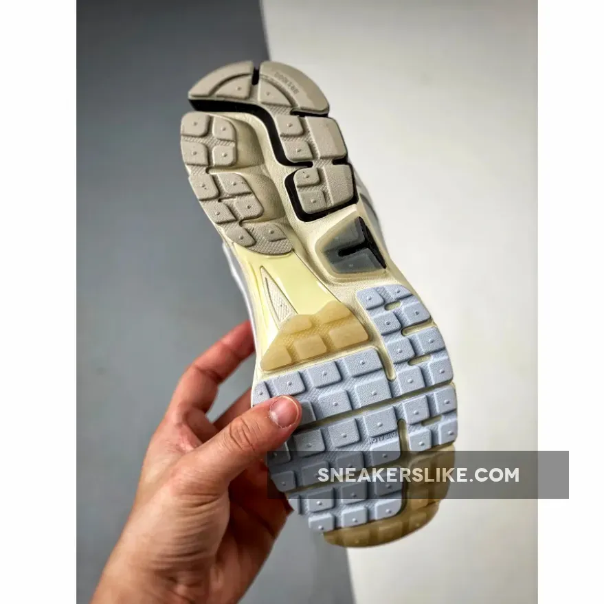 The Nike Zoom Vomero 5 Supersonic comes dressed in a White, Igloo, Black, and Neutral Grey color scheme. Crafted like its brethren, this piece features an exuberant medley of white and “Sail” hues adorning the primary mesh layer and the TPU caged mid-foot Swoosh. Dark black nuances lend sharp definition to the toe and heel layers. The shoe’s midsole is a playful blend of the earlier mentioned cream and stark black shades, exhibiting a subdued outward appearance that contrasts with the energetic and recurring patterns of blue and black found on the insoles, which reflect the internal architecture of a speaker system.