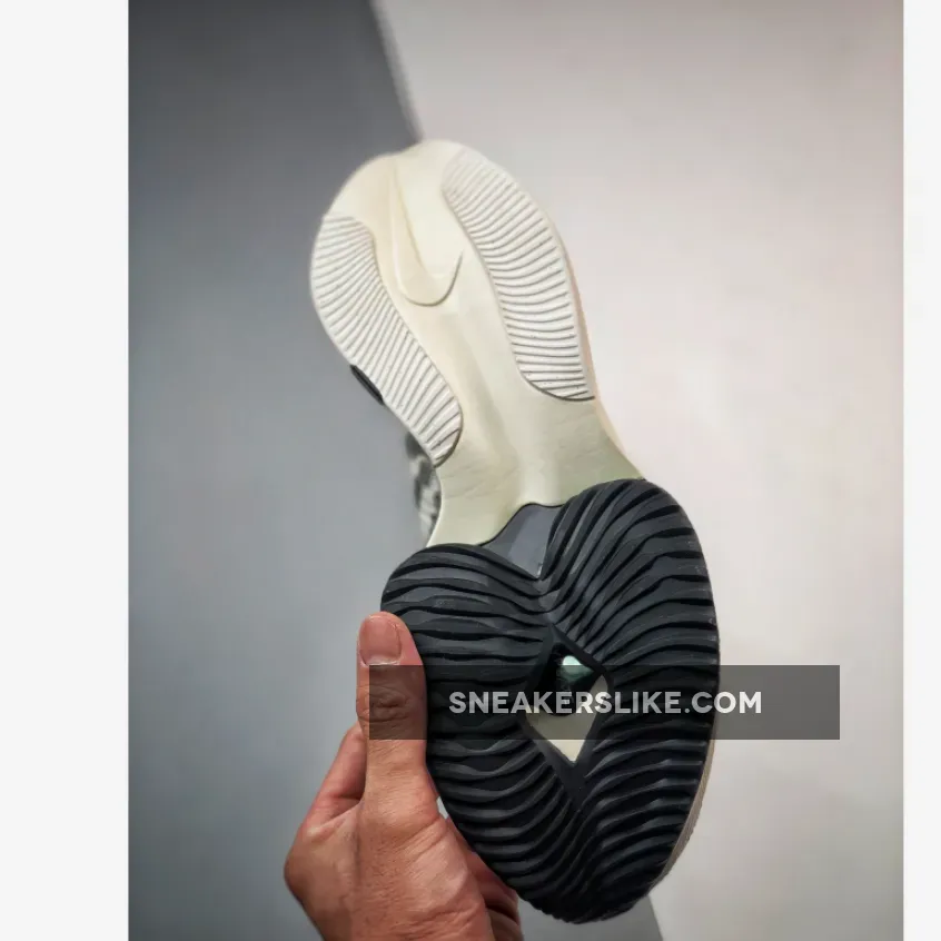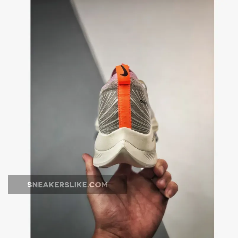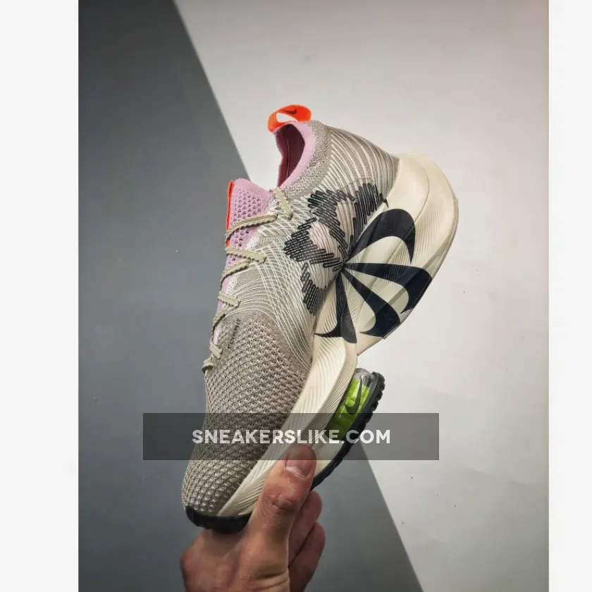 The upper, however, errs close to familiarity at most points. Along the toe and collar, for example, the cream knit exhibits the usual breathability, while the midfoot and heel opt for a more reinforced construction. This allows for the applied print to retain its shape, ensuring the fidelity of the circular design logo at the medial and the zig-zag Swoosh along the lateral. Elsewhere, pink and orange bring color to the top line, Volt pops within the forefoot Zoom, and Sail tinges the clearly reconstructed midsole.