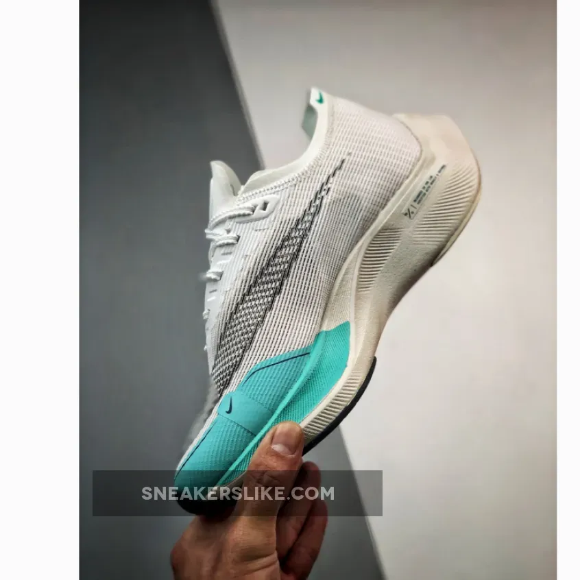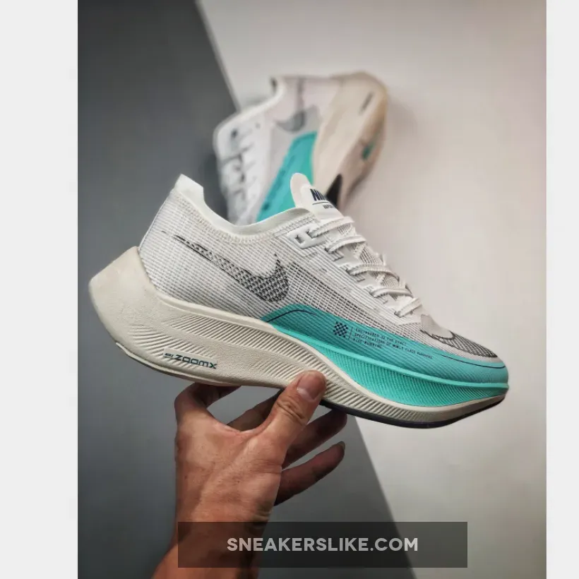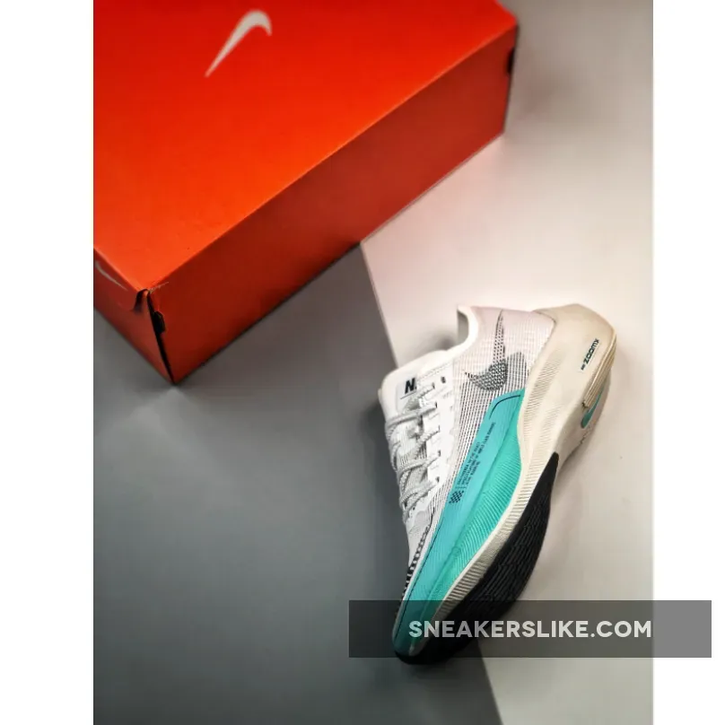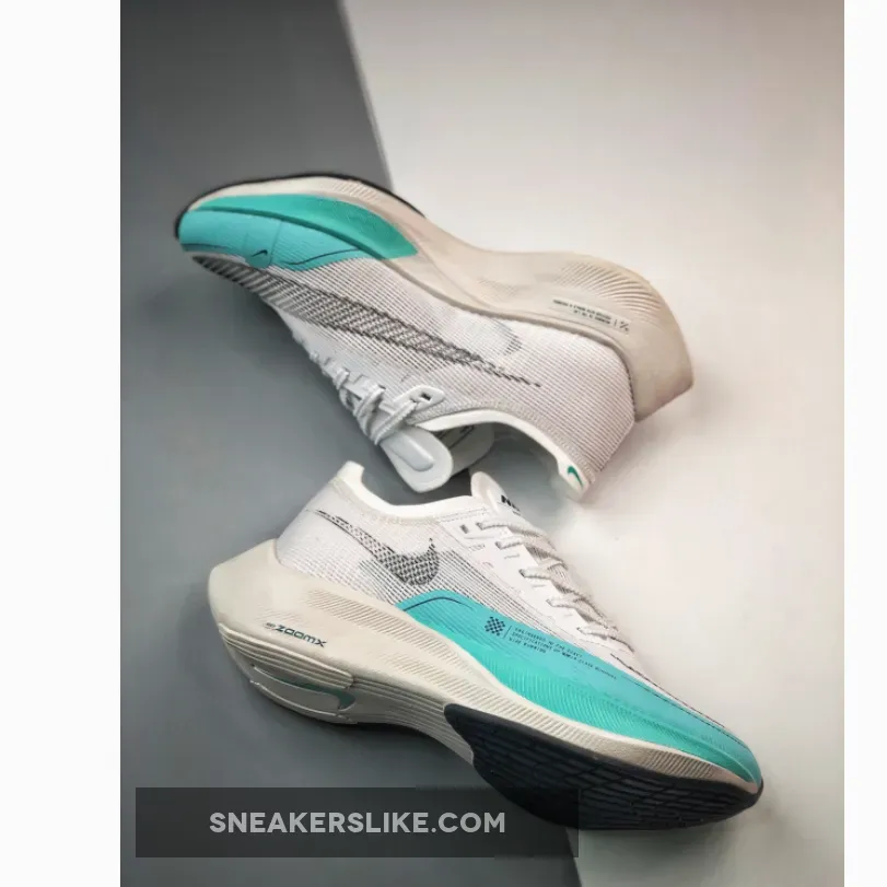 The Nike women’s ZoomX Vaporfly Next% 2 ‘White Aurora Green’ delivers a performance running shoe built for speed and distance. An asymmetrical lacing system secures the airy white mesh upper, featuring an ergonomic tongue and an interior heel lined with foam pods. Lightweight cushioning is provided by a ZoomX foam midsole with a full-length carbon fiber plate for energy return and a feeling of forward propulsion. The outsole adds durable rubber in high-wear areas for grippy traction that lasts.