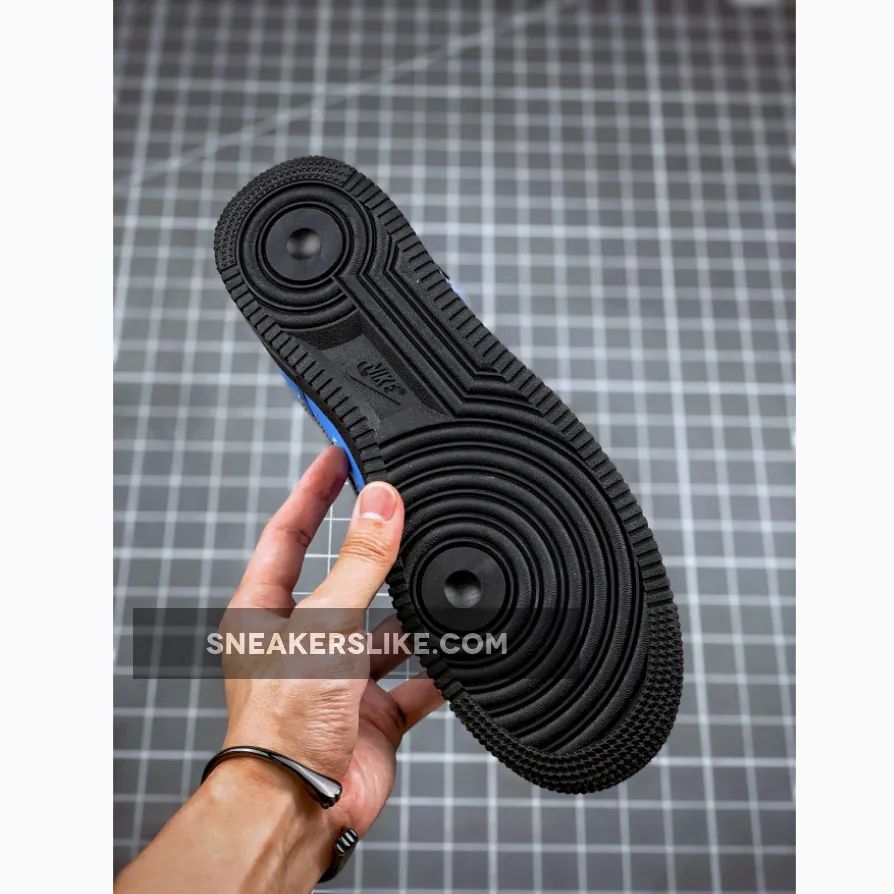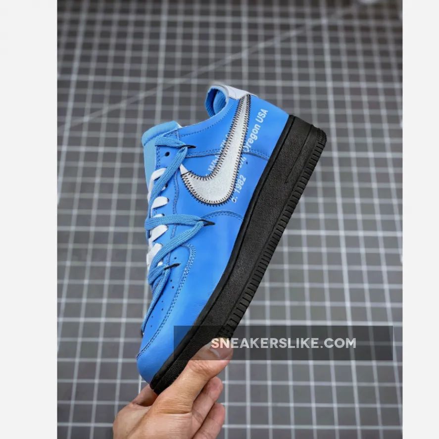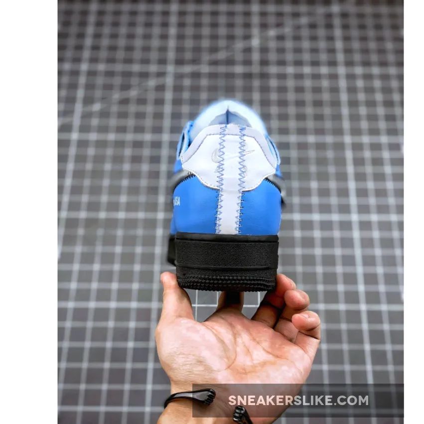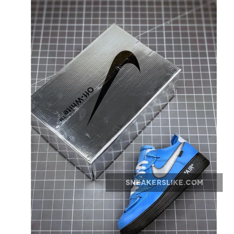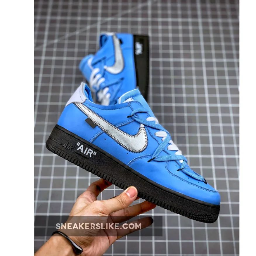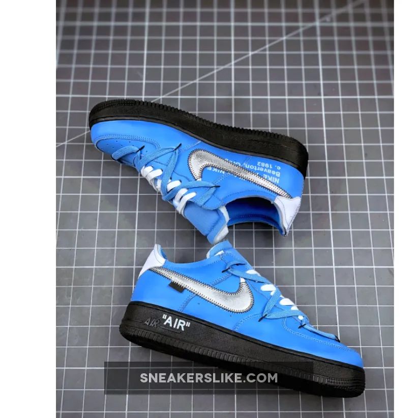 A doubled-up lacing system with standard white laces over the throat and a set of wide-reaching blue laces secured by black anchors nod to Abloh’s 2019 Dunk Lows. The aforementioned Swoosh may be silver, but it’s surrounded by black thread and a black hangtag in place of the other version’s blue and red accouterments. White leather is placed on the heel tab and heel strip, and for a finishing touch midsoles are done up in black with a white “AIR” hit.